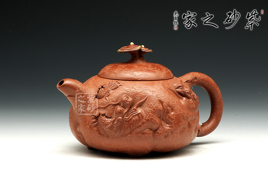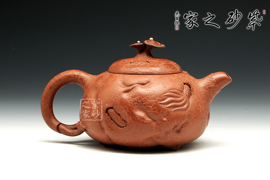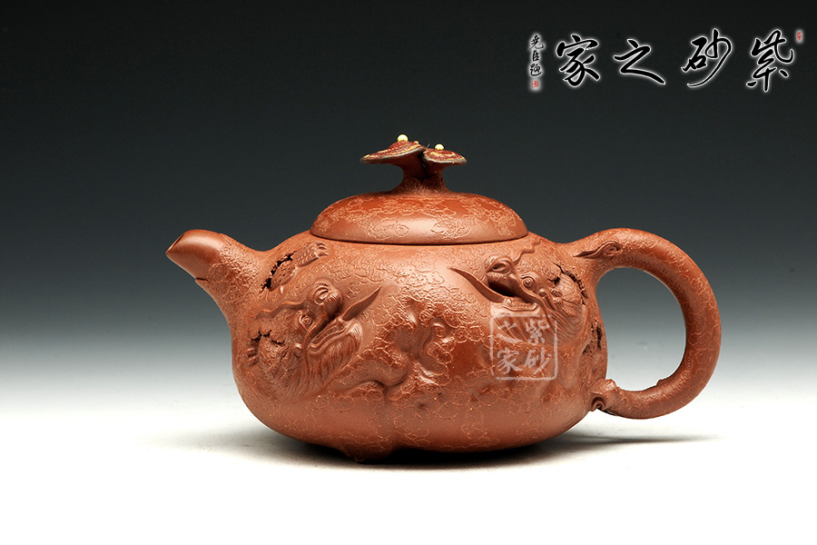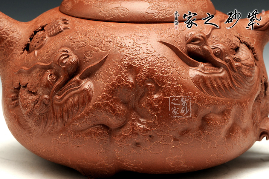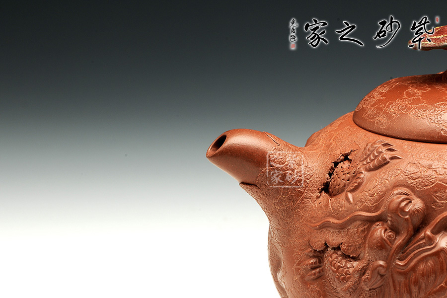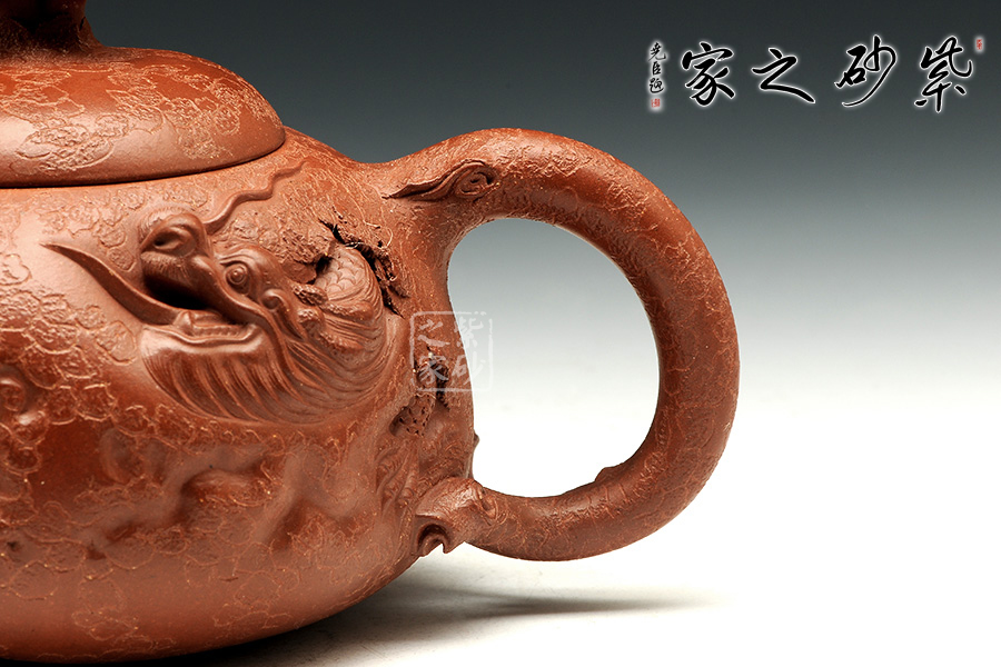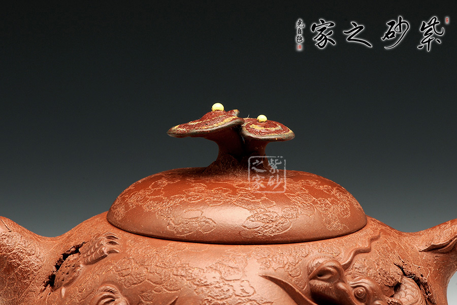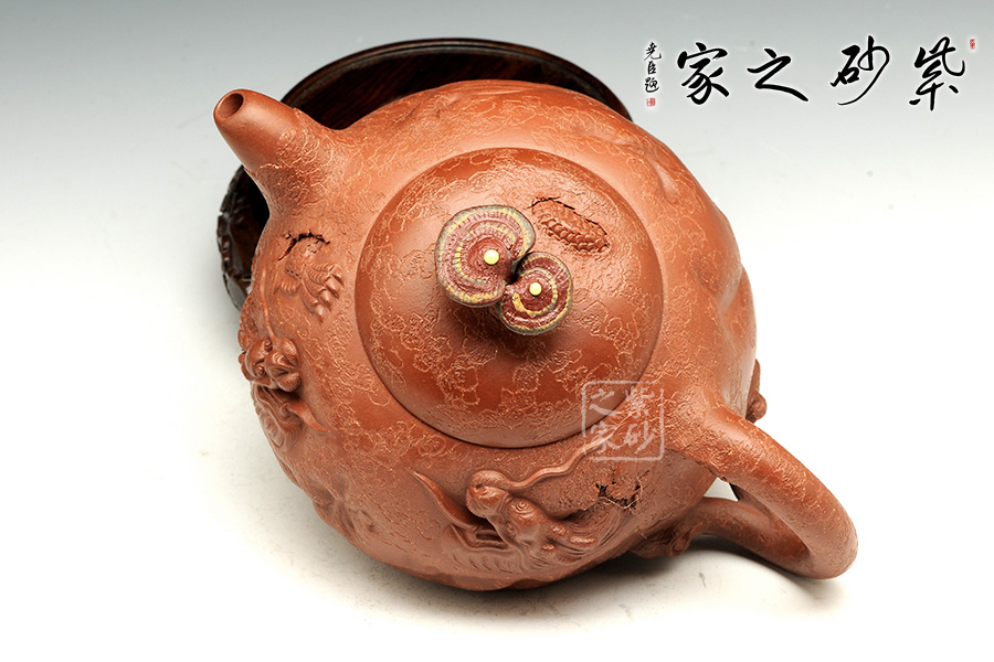 此款靈芝供春壺與傳統(tǒng)的供春壺實(shí)有異曲同工之妙,壺身皆有如老樹疙瘩般,盡顯得老成,但此款作品壺身的疙瘩卻不同尋常,以浮雕龍首,寓意吉祥,典雅藝美。壺把與壺嘴粗大對稱,以靈芝為壺鈕不但突出主題,亦區(qū)分出與其他供春壺的不同,可見老師創(chuàng)意之新穎,整體造型渾圓敦厚,古樸雅拙,器身仿褶皺祥瑞,這款壺難能可貴,推薦!