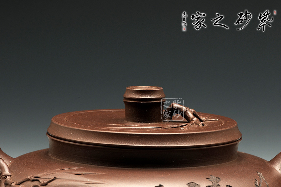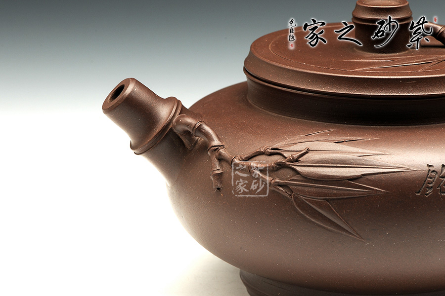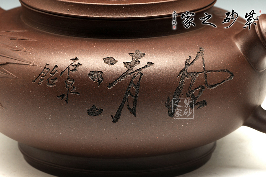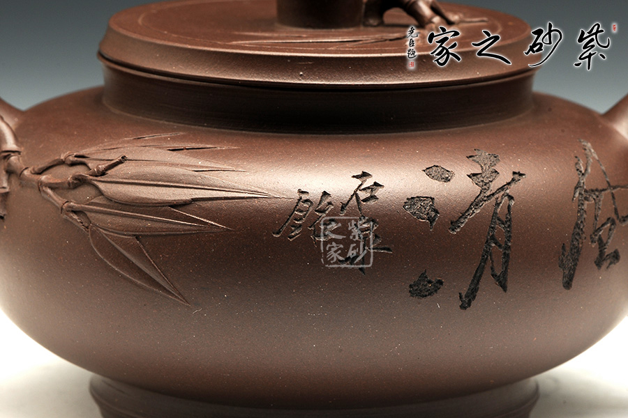 此器以竹為主題,各部位協(xié)調(diào)處理,很是精當(dāng)。壺身圓融,飽滿瑩潤,上收至壺口,下收至圈足,上下相稱,越發(fā)顯得清風(fēng)淡雅。高壺頸、口蓋吻合嚴(yán)密,且呈竹節(jié)形狀,蓋上以竹節(jié)為壺鈕,并貼塑竹枝竹葉。嘴把皆做竹枝形,壺嘴底部貼塑嫩枝及竹葉,與蓋上裝飾一致。壺身正面刻“風(fēng)清”“石泉銘”,背面刻繪淡雅竹葉,展君子氣節(jié)。