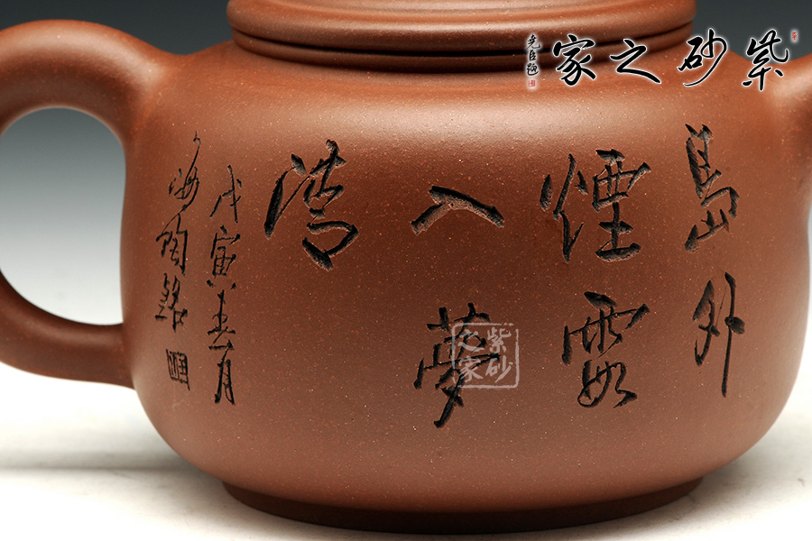 此壺壺身傳統(tǒng)圓器造型,線條飽滿有張力,輪廓柔和。壺底加圈足,和壺頸部上下對(duì)應(yīng),優(yōu)雅氣韻由此頓生。壺蓋平蓋圓潤(rùn),子母線壓合自然,做工精細(xì)。蓋上的圓珠壺鈕圓滑可愛(ài),精妙可人。壺把和壺嘴的線條非常明朗,線條簡(jiǎn)練挺立,顯得古樸自然。也正是因此,此壺特別的味道才更加濃厚。