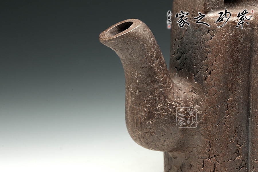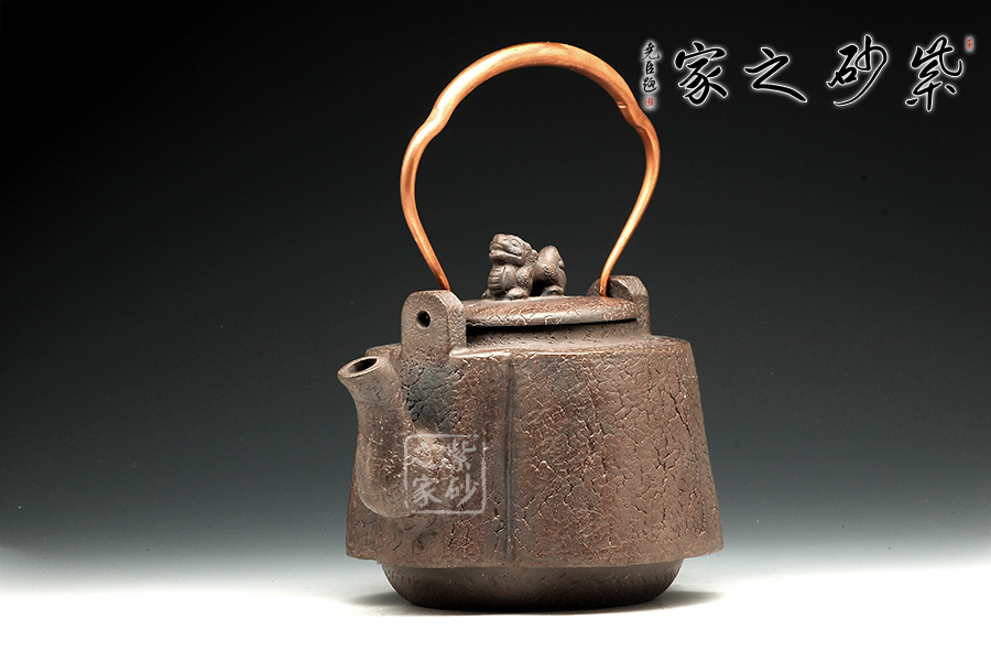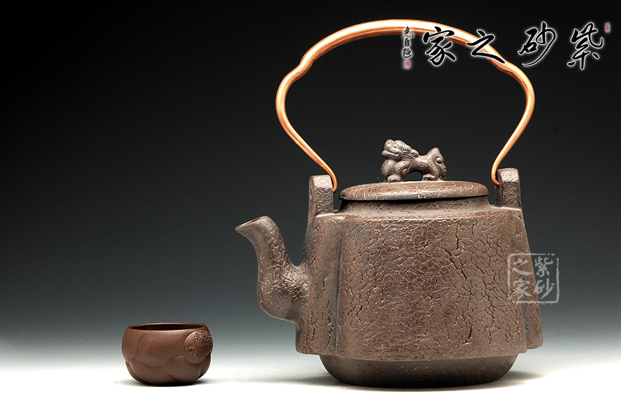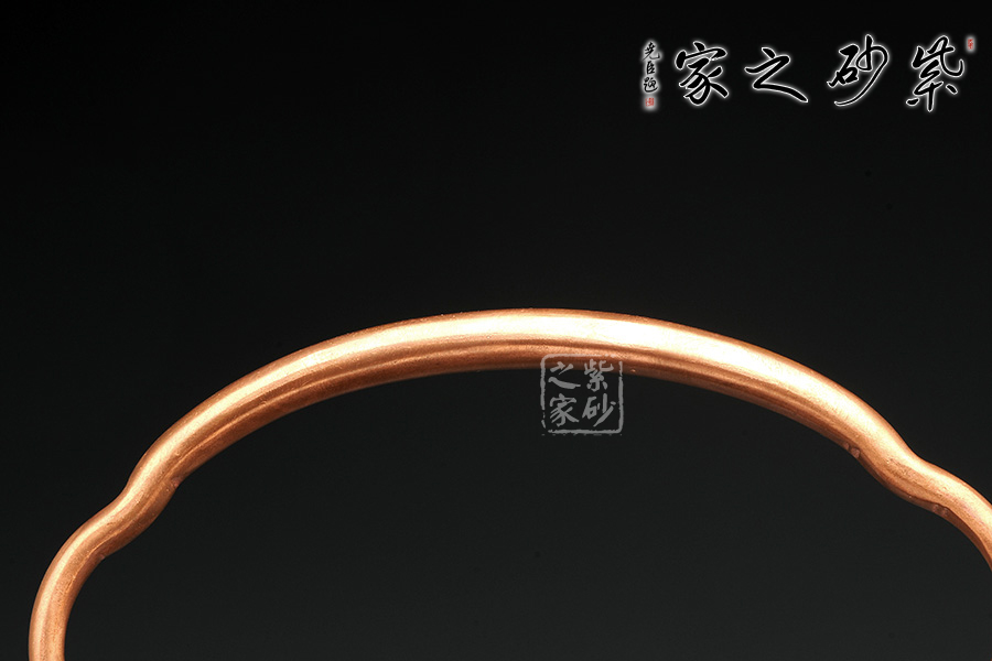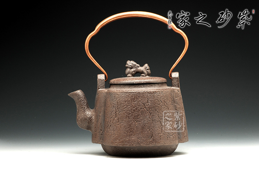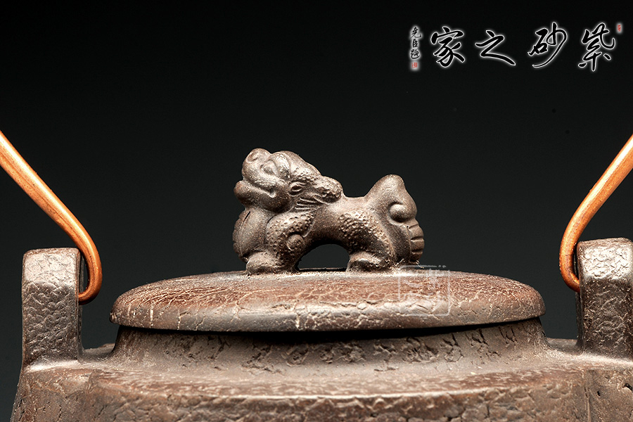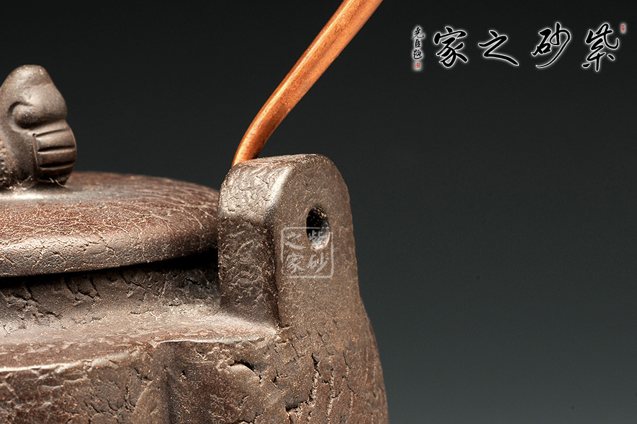 這件作品顯得厚重沉穩(wěn),大氣有感,整體的造型線條蒼涼有力,古色古香,突出原始的意味。壺蓋圓蓋上以精致龍鈕為點(diǎn)睛之筆,氣韻盡顯。壺嘴三彎設(shè)計(jì),古拙中透著濃濃韻味。金屬提梁把造型變化豐富,線條流暢,又給此壺增加不少特色。