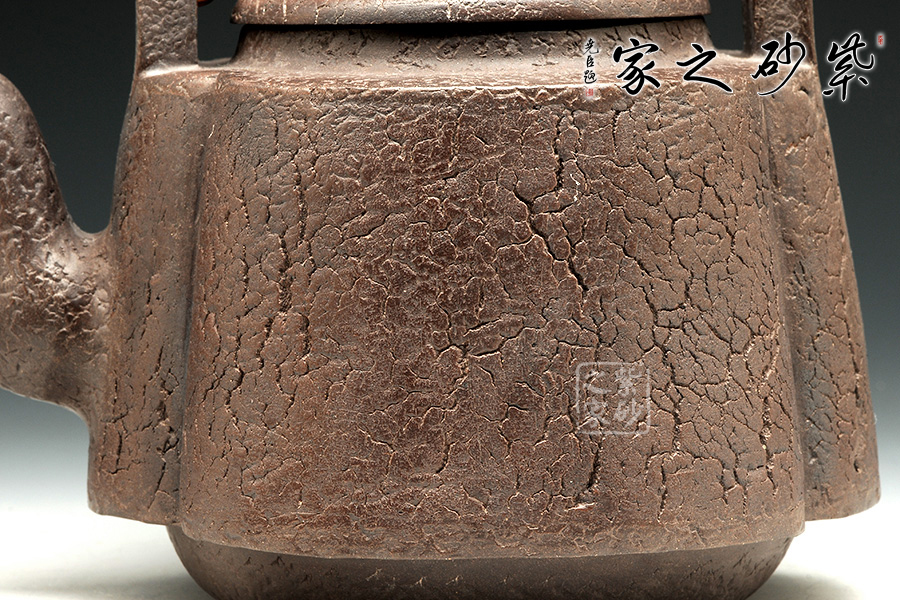 此壺為紫砂仿鐵壺,近幾年刮起了一股日本鐵壺風(fēng),日本鐵壺以其獨(dú)有的古樸造型闖入我們的視野,盧建國老師的這幾款紫砂仿鐵壺就是在日本鐵壺的造型而制成的。壺身也特別仿制了日本鐵壺獨(dú)有的不規(guī)則花紋,此款更是冰裂紋,顯得更加古樸獨(dú)特。