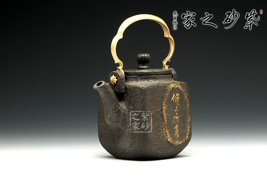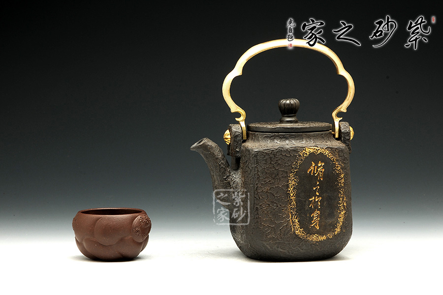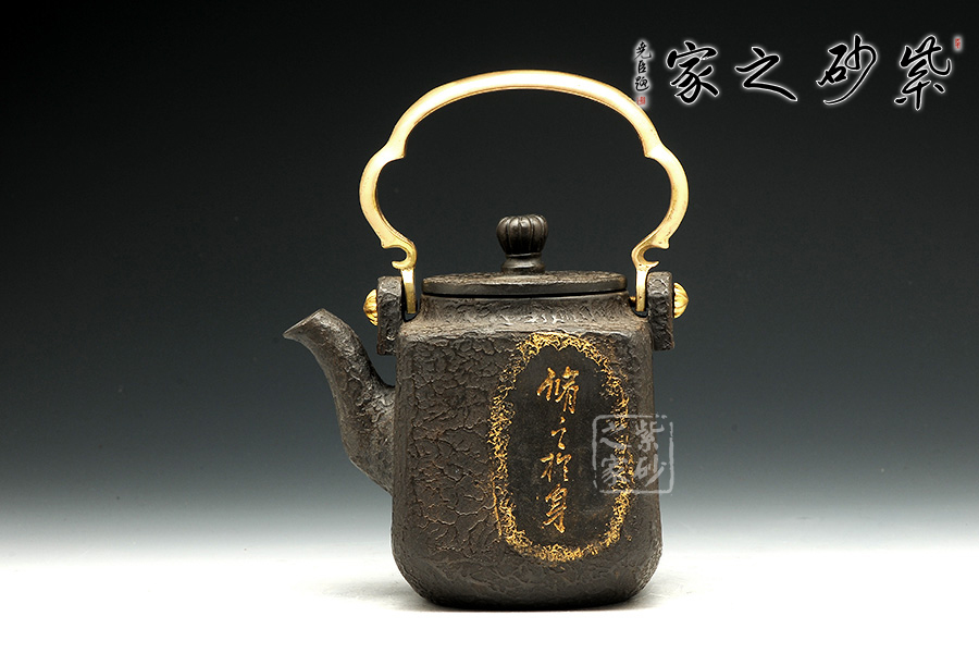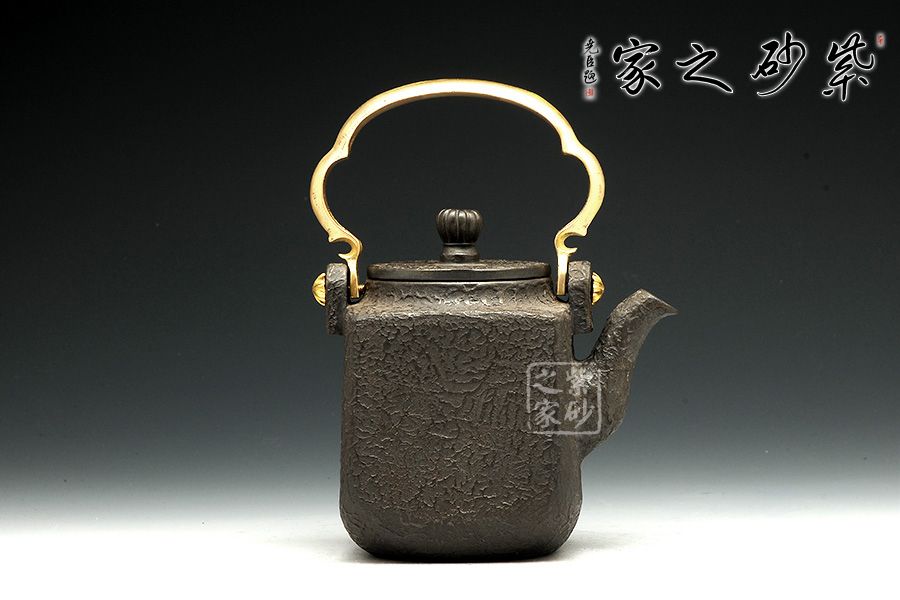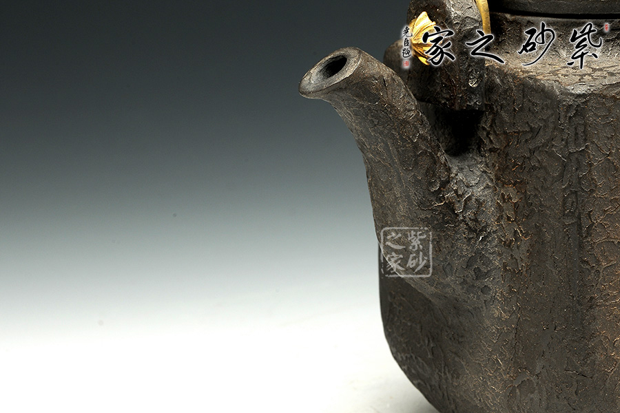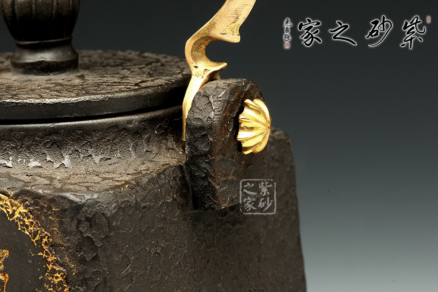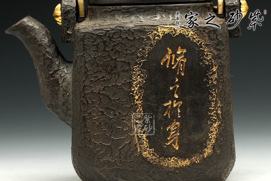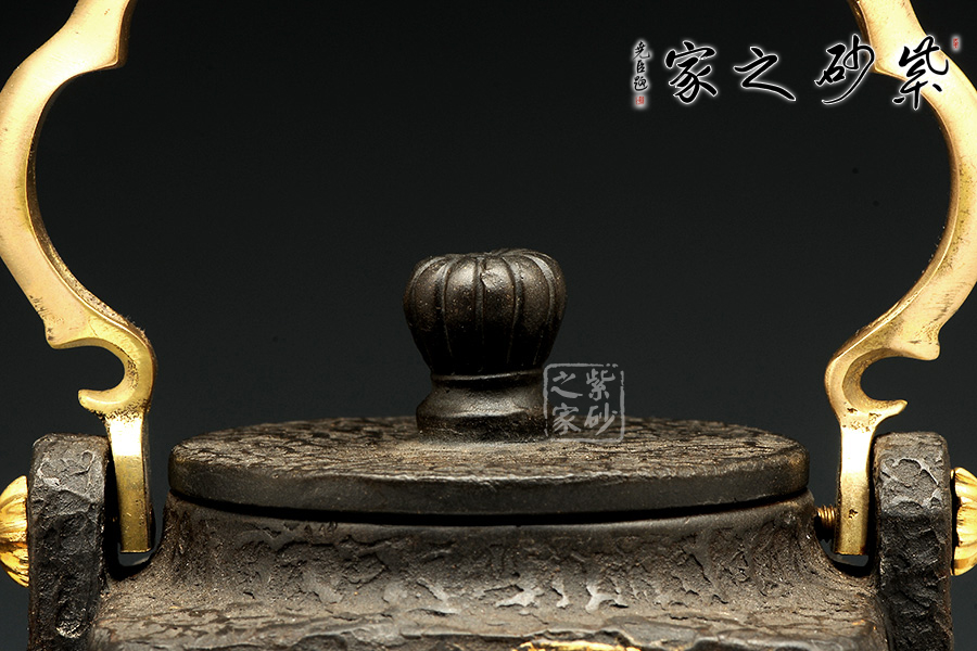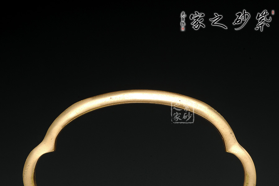 這件作品返璞歸真,方器而為,四面有感,線條蒼涼有力的展現(xiàn)古樸的意味,給人一種沉思,壺嘴三彎設(shè)計,大氣順然,古拙中透著濃濃韻味,出水利落。壺蓋平蓋,鼎與壺口之上,筋紋鈕別致,似皇冠,典雅有款。金屬提梁把造型變化豐富,金光燦燦,線條流暢,又給此壺增加不少特色。