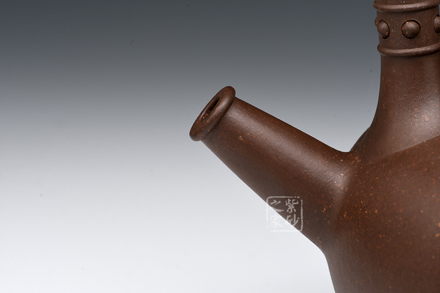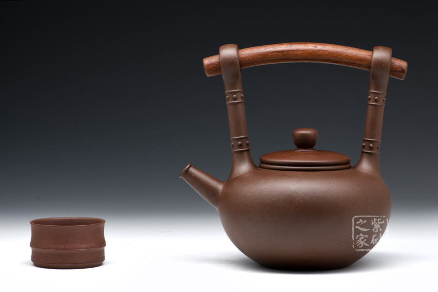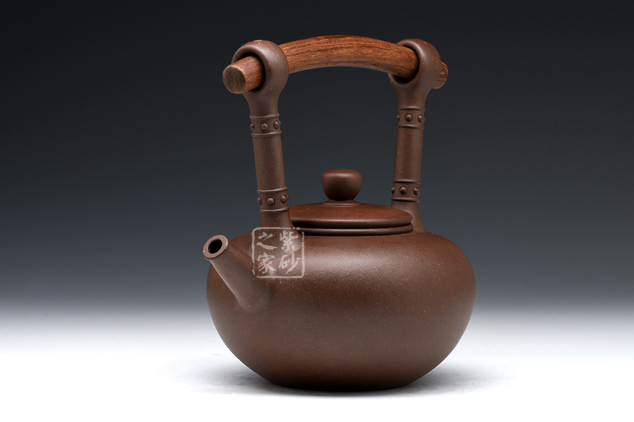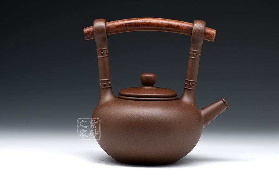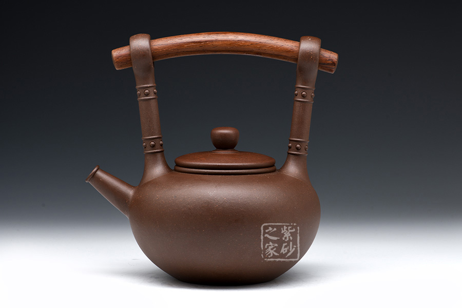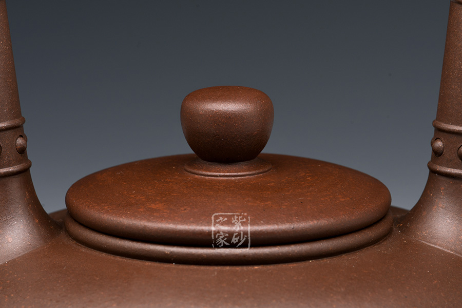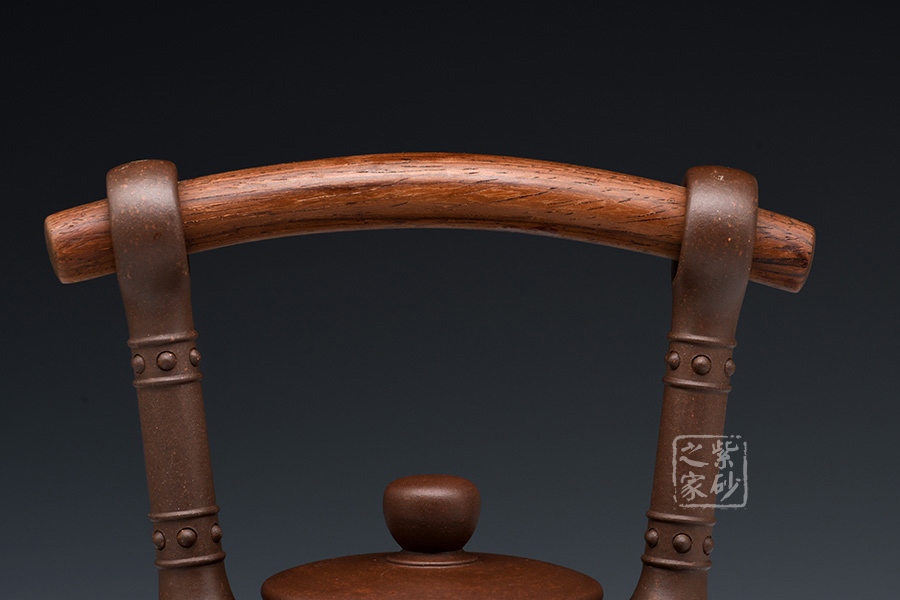 整器線條簡潔、粗獷敦厚,彎流自然胥出,海蓋契合嚴(yán)密,更顯沉穩(wěn)。兩根豎梁自壺肩騰起,橫梁以紫檀木插入豎梁中,顯得樸質(zhì)古拙,形成一種新紫砂壺流派。