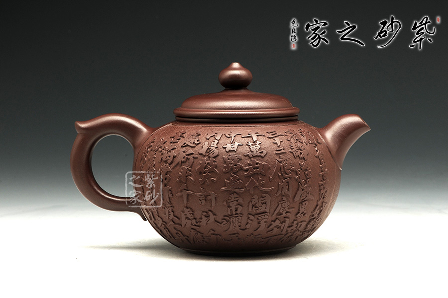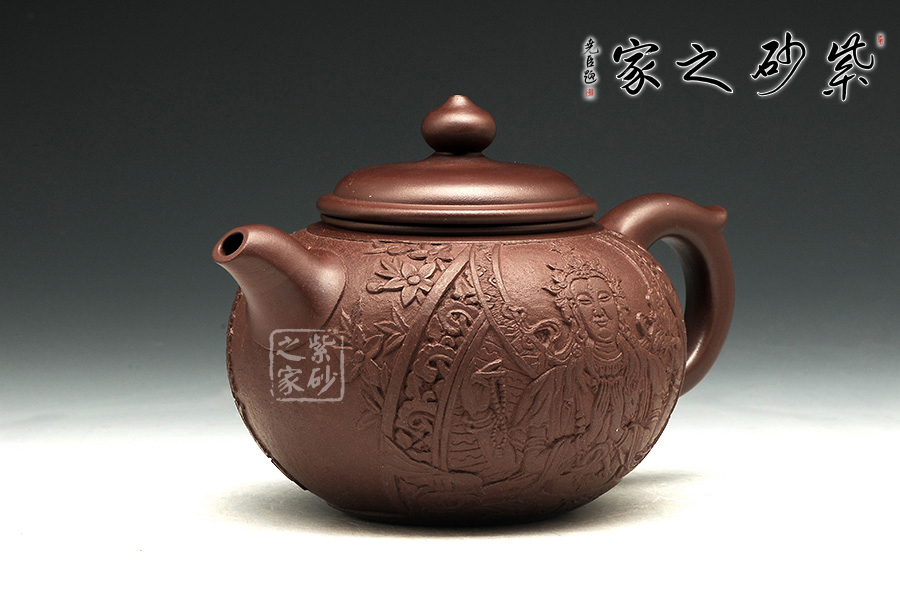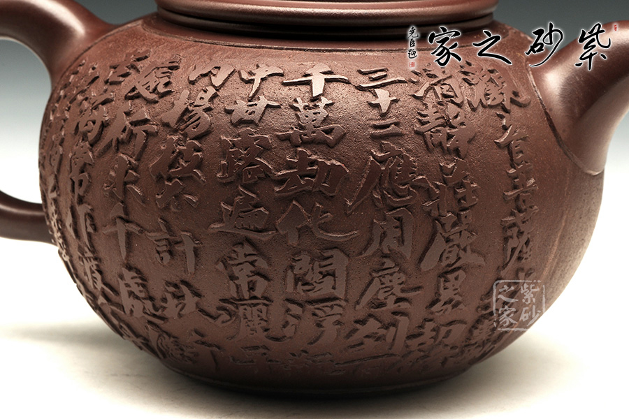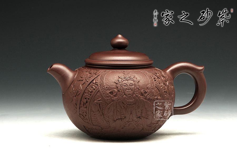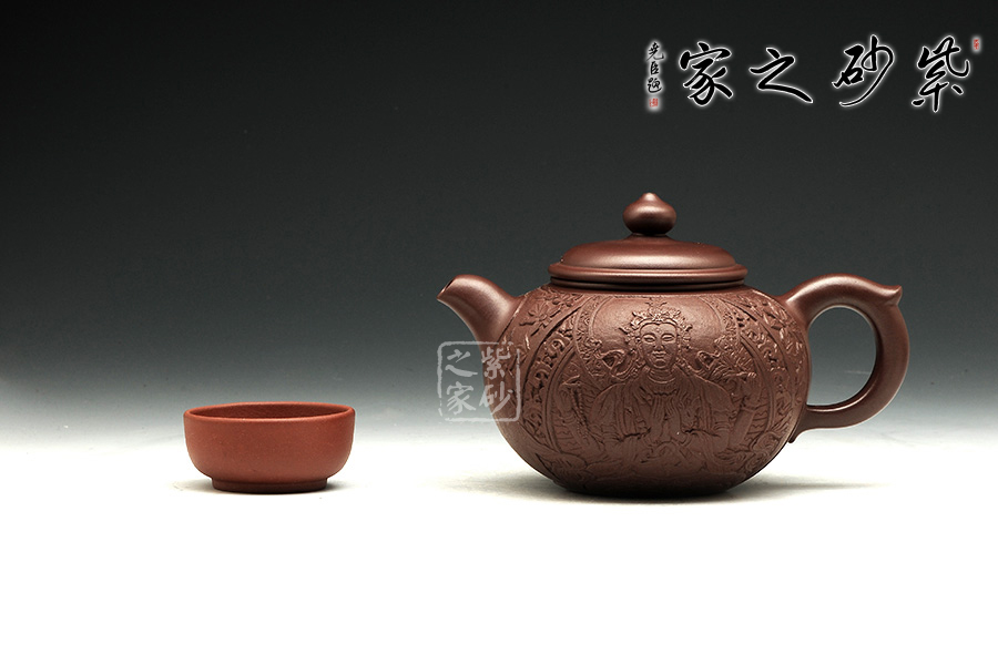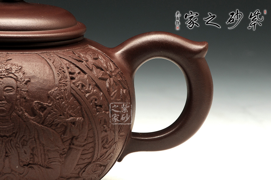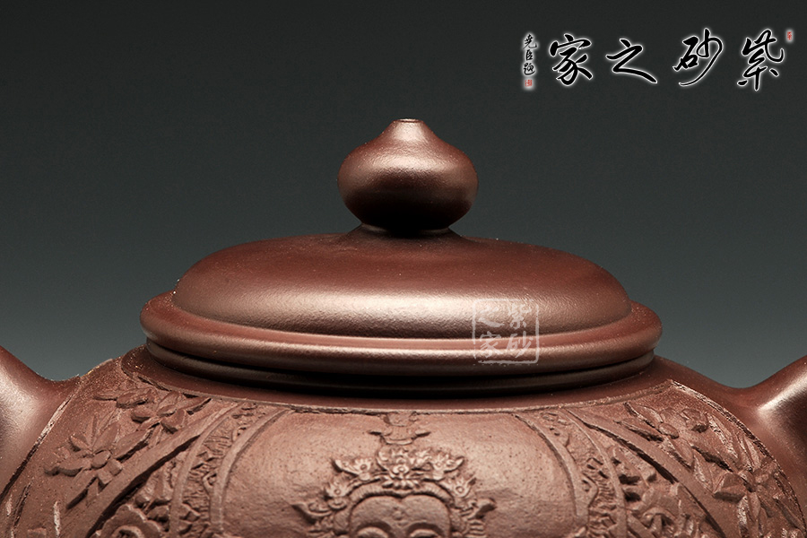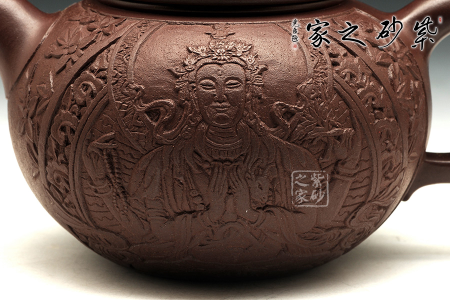 此把禪緣壺,質(zhì)感古樸蒼涼,細而不膩,淡泊寧靜。此壺如傳統(tǒng)形制一般,造型古樸,腹圓而鼓,壓蓋蓋面蓬勃飽滿,氣密性良好;飛把大方簡單,便于提拿;嘴口略微下壓,出水暢快;壺身結(jié)構(gòu)自然和諧,十分優(yōu)美,平靜中孕育著動感;通身似浮雕刻繪,繪刻細膩,工藝精湛,以千手觀音表明禪意,輔以詩詞,清雅淡然。