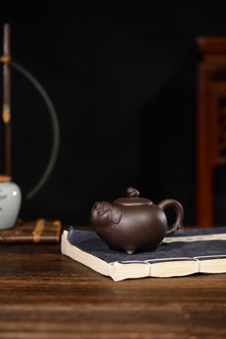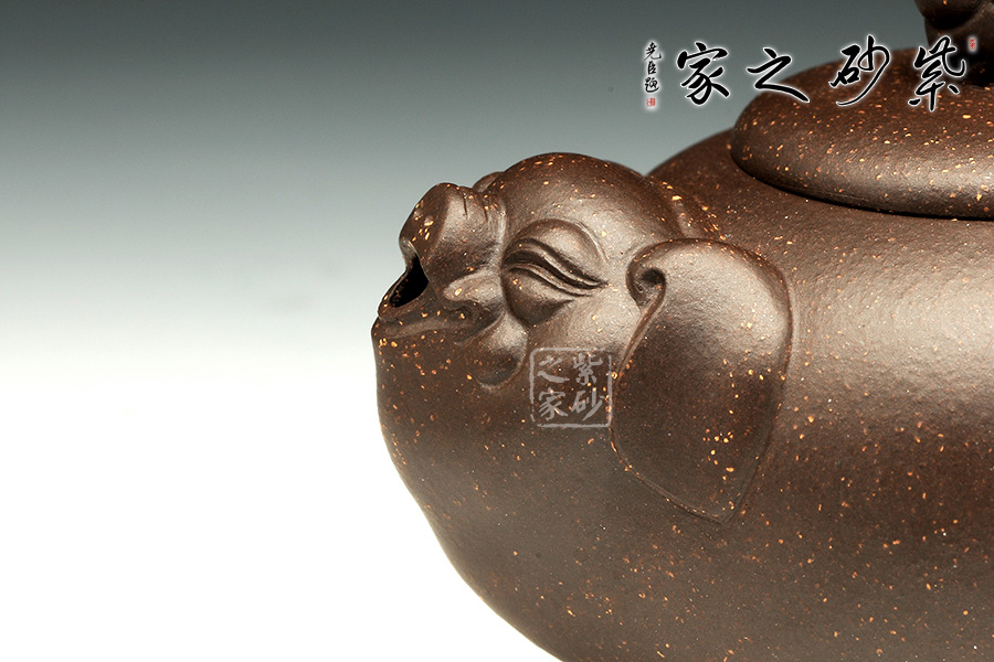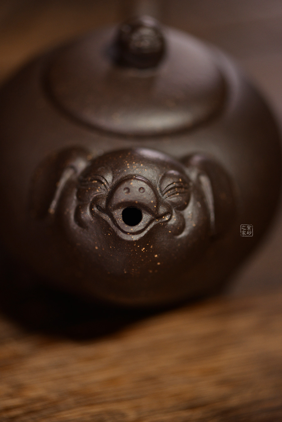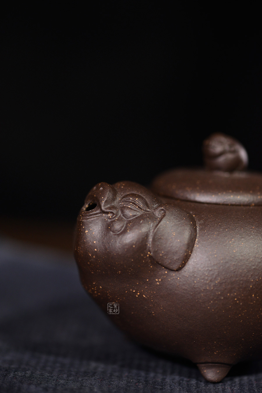 老師這款壺造型別致,鐵砂泥潤(rùn)澤飽滿,砂質(zhì)感盡顯,氣韻豐盈。以豬首做壺流,肥頭大耳,憨態(tài)可掬;豬尾巴塑成圓柄壺把,端握適手,實(shí)用性佳。壺體內(nèi)斂沉穩(wěn),壓蓋上一只胖乎乎圓潤(rùn)可愛(ài)的小豬為壺鈕,實(shí)在精致!簡(jiǎn)潔無(wú)贅飾的壺體更顯紫砂陶素面素心的璞玉本質(zhì),值得推薦!