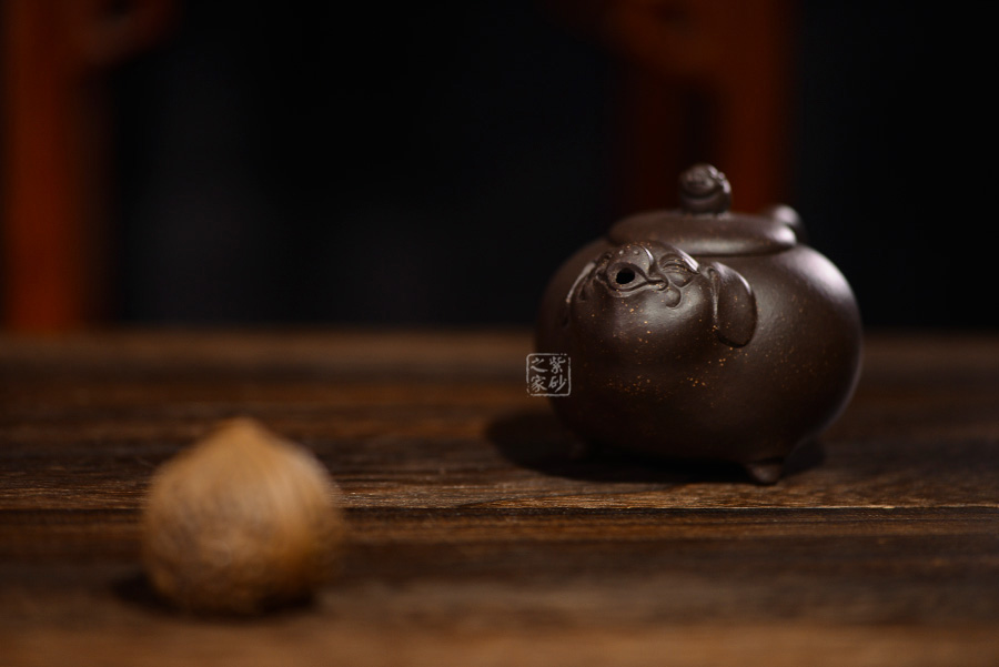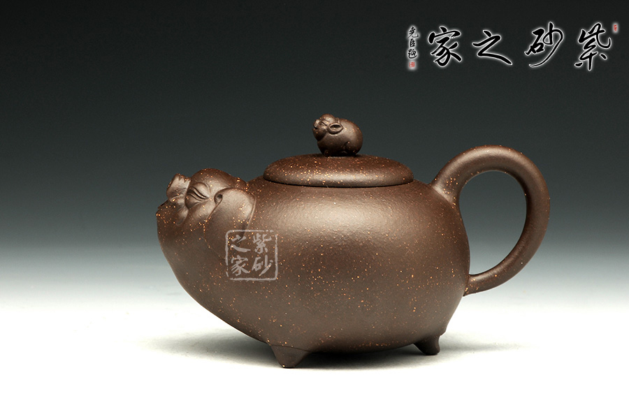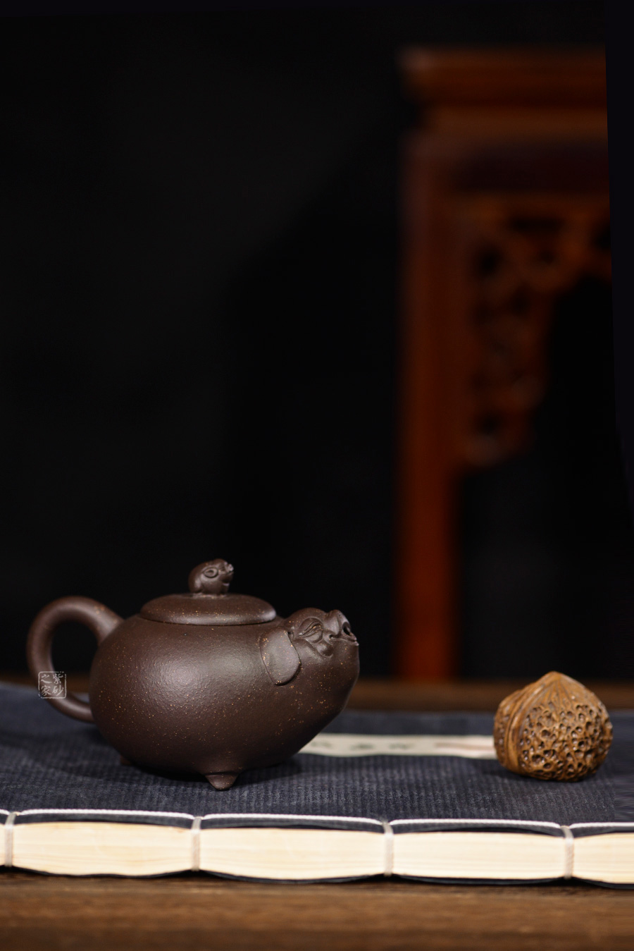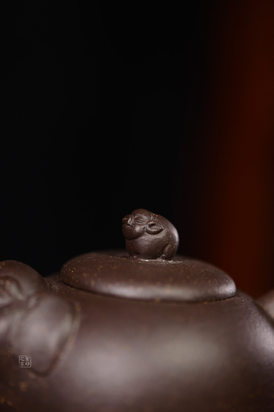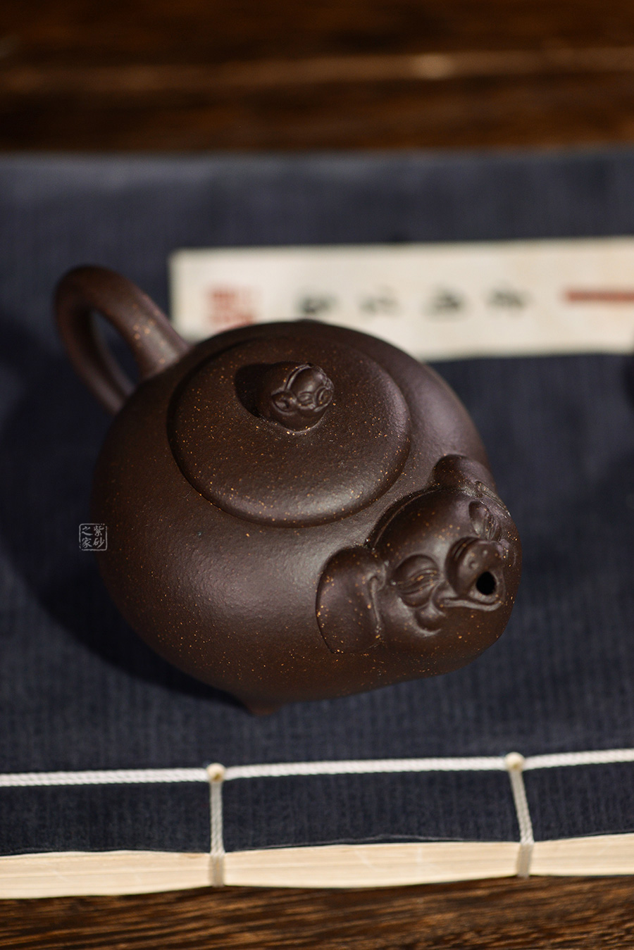 老師這款壺造型別致,鐵砂泥潤(rùn)澤飽滿,砂質(zhì)感盡顯,氣韻豐盈。以豬首做壺流,肥頭大耳,憨態(tài)可掬;豬尾巴塑成圓柄壺把,端握適手,實(shí)用性佳。壺體內(nèi)斂沉穩(wěn),壓蓋上一只胖乎乎圓潤(rùn)可愛(ài)的小豬為壺鈕,實(shí)在精致!簡(jiǎn)潔無(wú)贅飾的壺體更顯紫砂陶素面素心的璞玉本質(zhì),值得推薦!