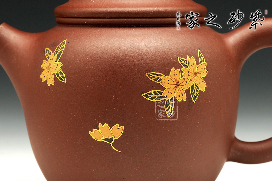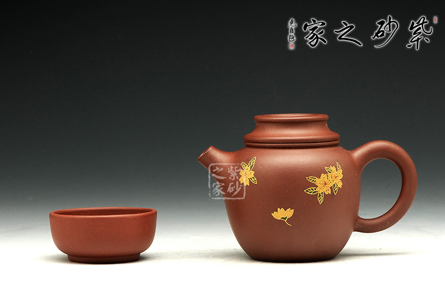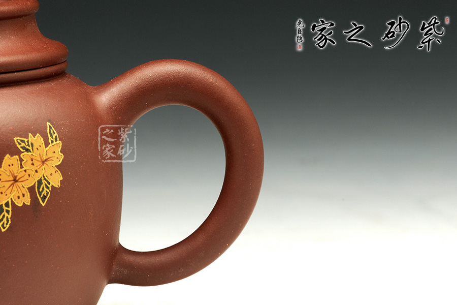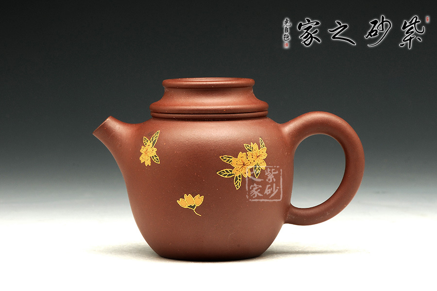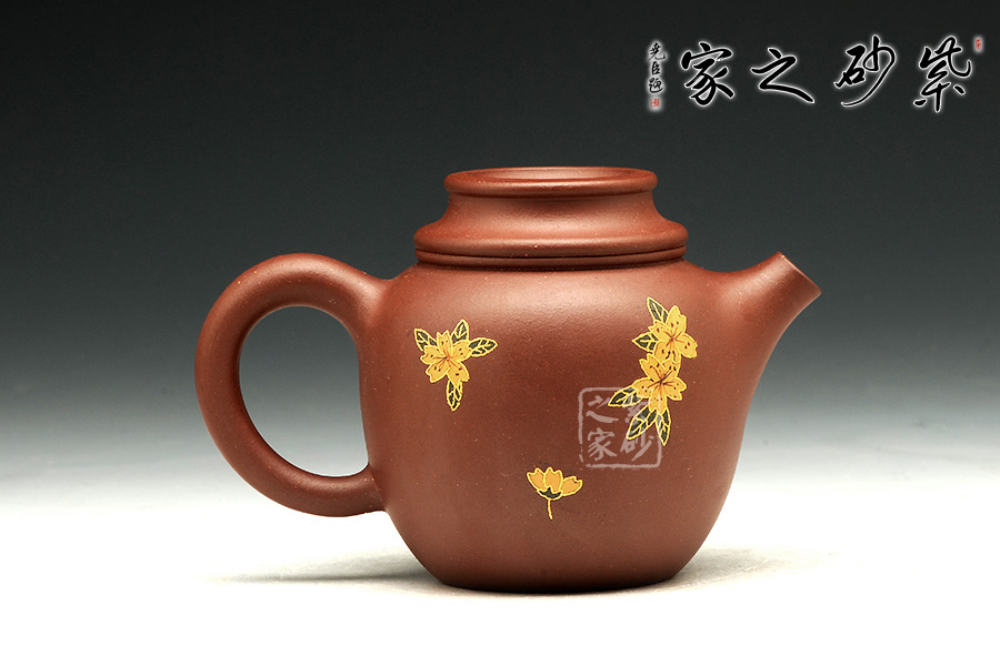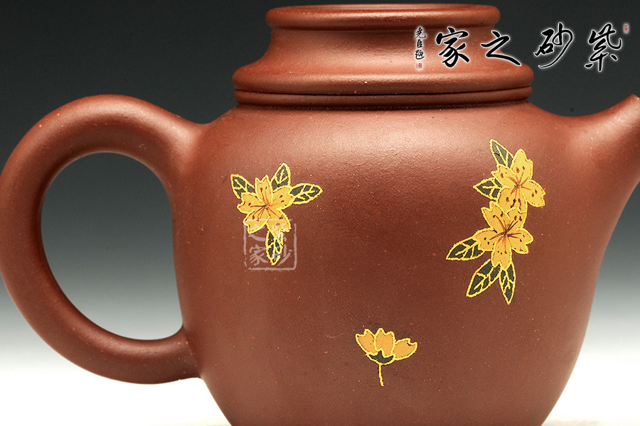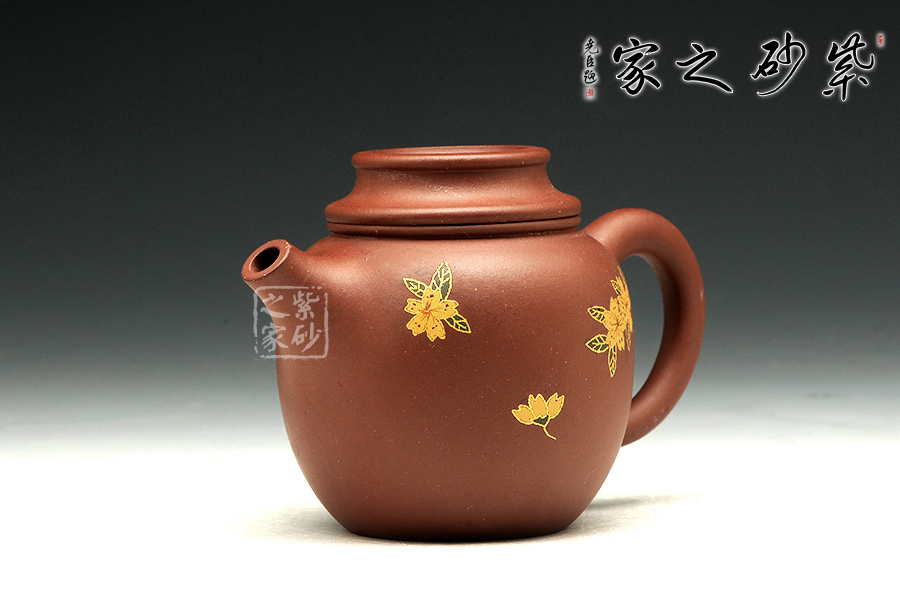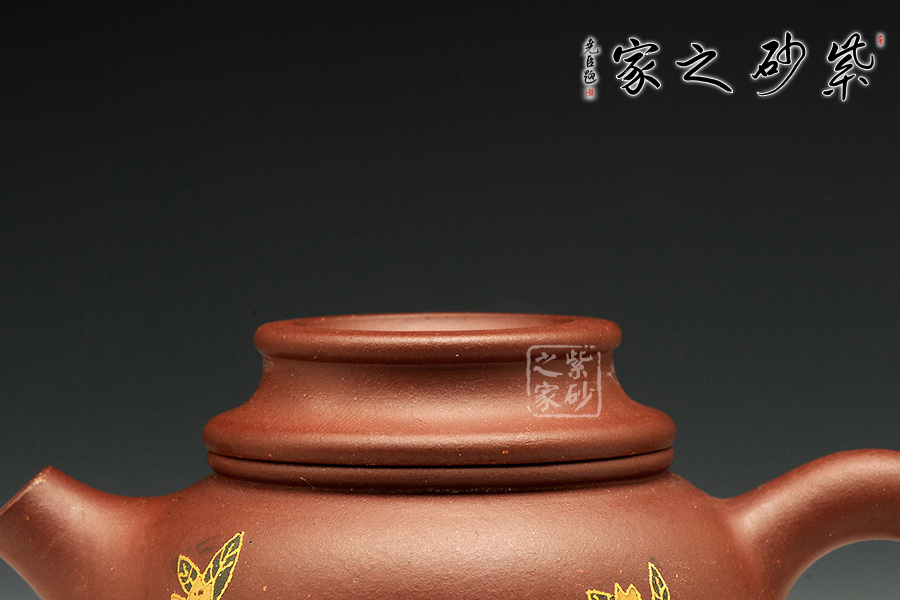 此把作品沉穩(wěn)大方,給人以實在沉穩(wěn)的內(nèi)斂觀感,在壺蓋的設(shè)計上則去除了壺鈕的造型,與壺蓋融為一體,圈線層次,以口拿捏更加的適手,可見老師在制作上的用心,設(shè)計上的創(chuàng)新。壺身飽滿,口沿邊線手工勻稱,續(xù)出的直流嘴,憨實大口,出水爽利,不誕水。壺把與之對應(yīng),呼應(yīng)壺身線條的柔和。加之器型上的描金裝飾,則平添一份典雅的意味。