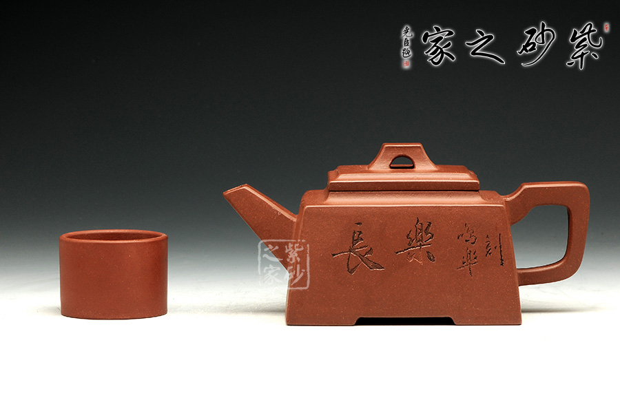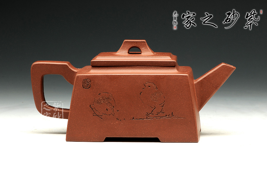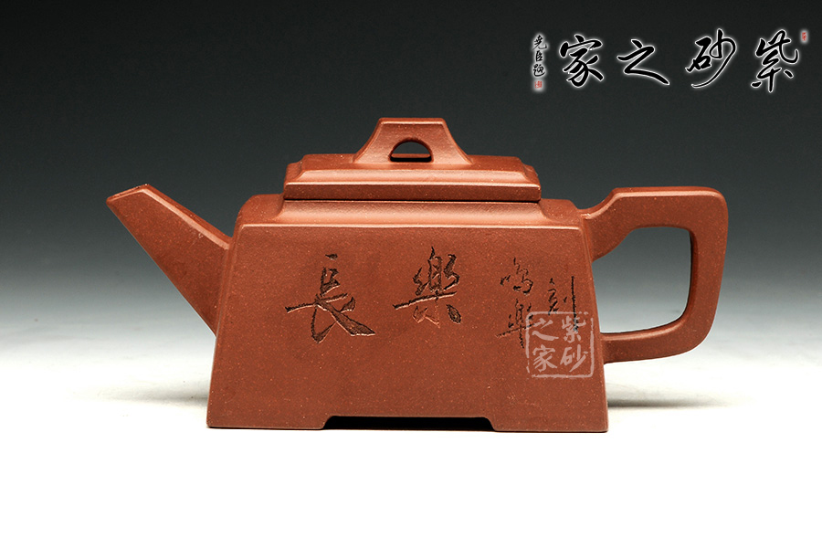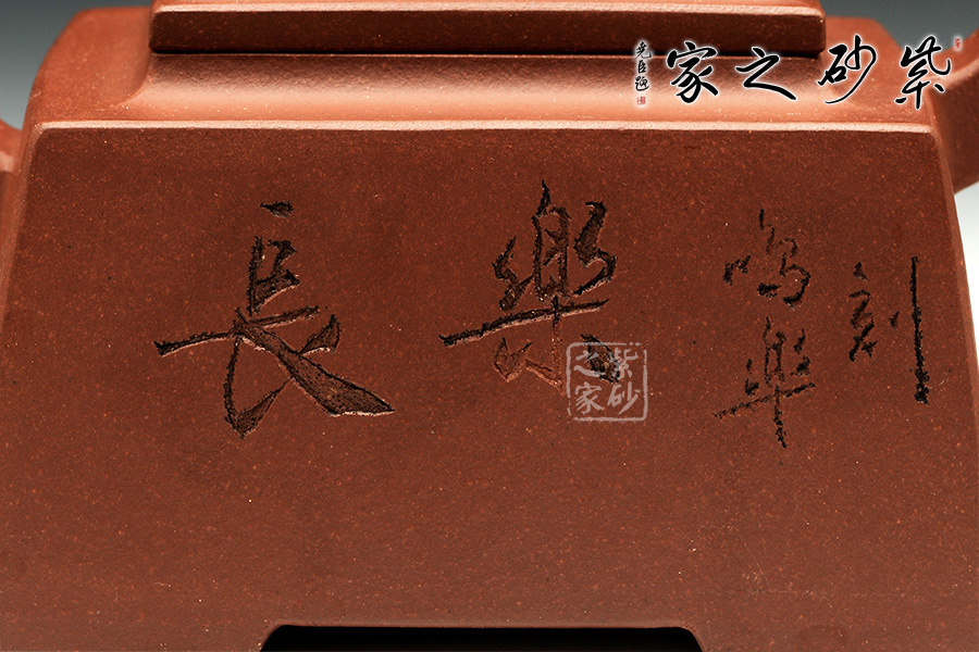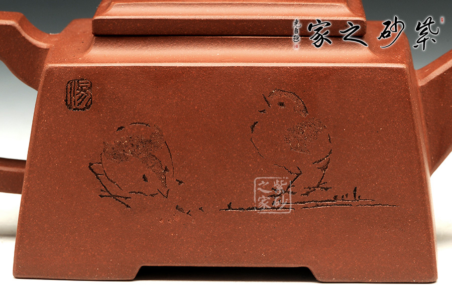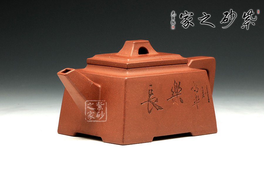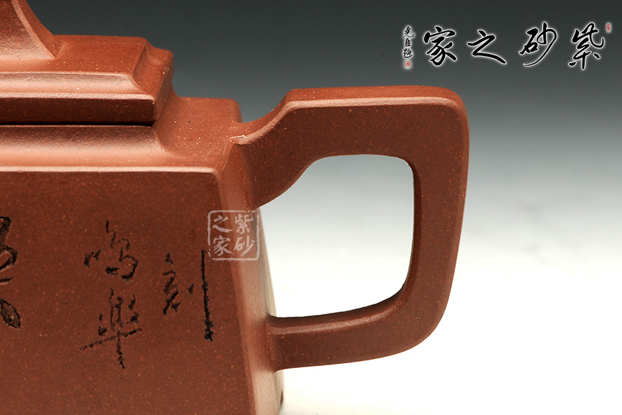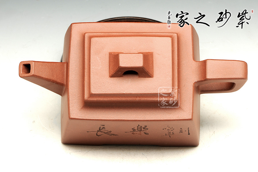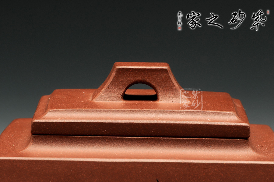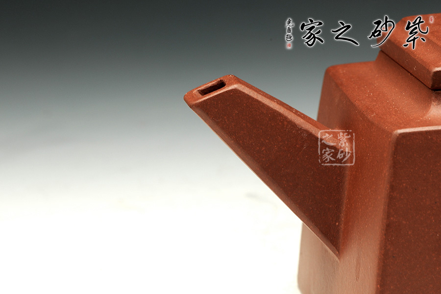此款方器壺造型簡潔明快,四方基底,下寬上窄,使此壺具備方壺穩(wěn)重剛強(qiáng)的優(yōu)點(diǎn),又不流于呆板單調(diào)。壺流與把挺立與虛實(shí)空間對應(yīng),全器表現(xiàn)出剛?cè)岵?jì)的美感,足見作者已掌握制壺精髓,能于不變中求變。壺蓋正方壓蓋,方形橋鈕,整器以直挺的線條為主,不嬌柔做作,表現(xiàn)出堅(jiān)實(shí)陽剛之氣!