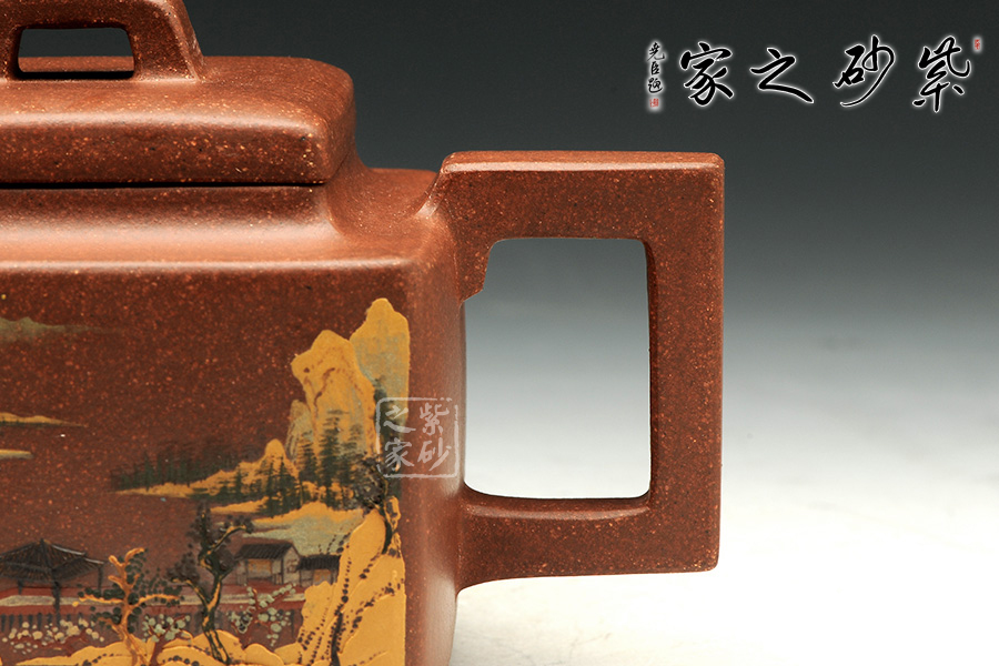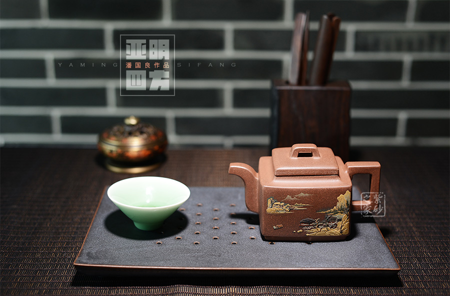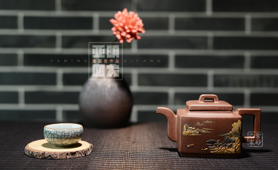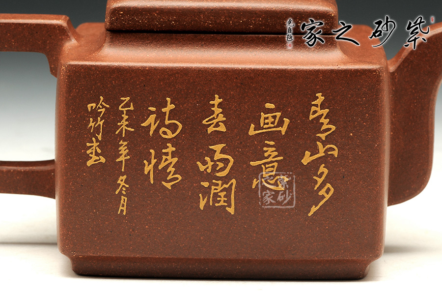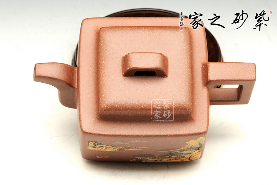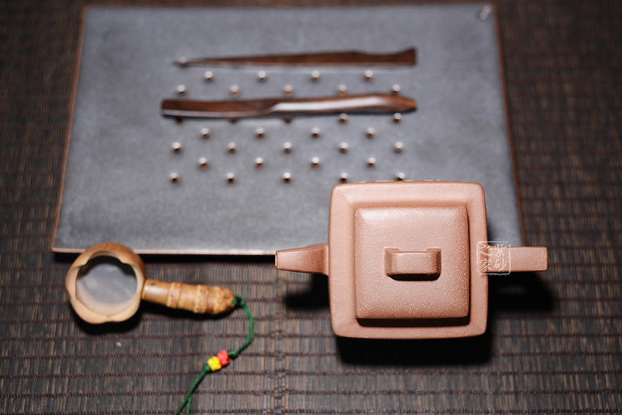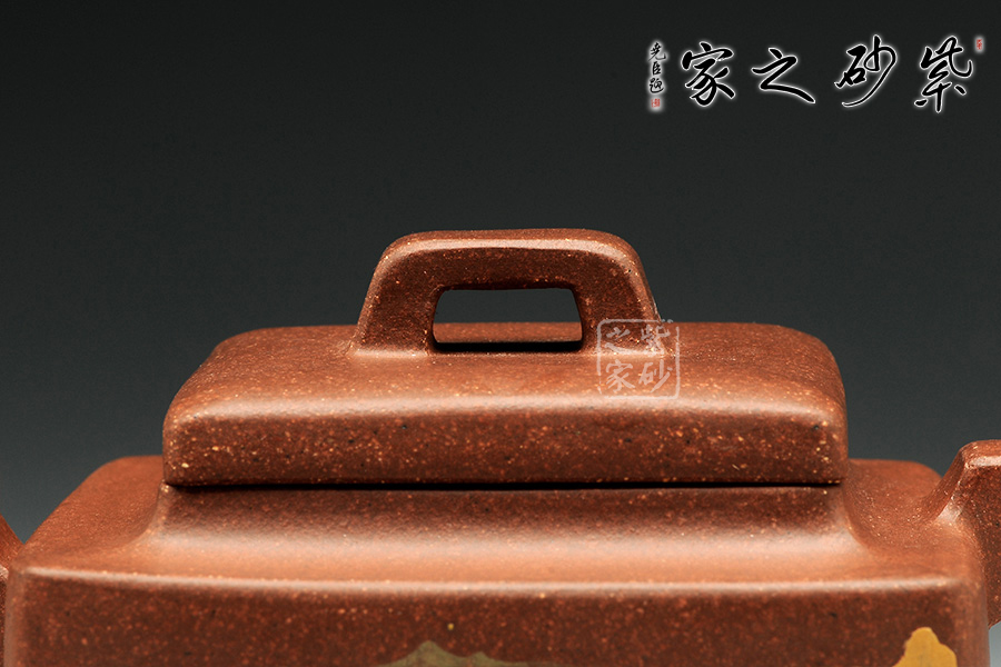這款亞明四方雖為經(jīng)典器型,然而在潘老師手中形神俱備,砂質(zhì)粗礦。方形橋鈕,寬厚有力。四方鼓蓋,折線分明,截蓋壓于壺口之上,氣勢雄大。
