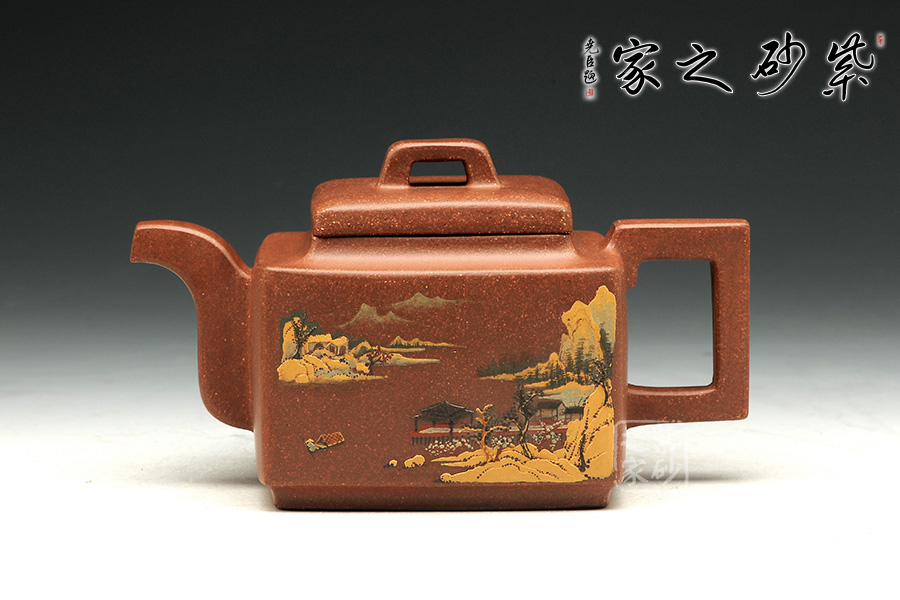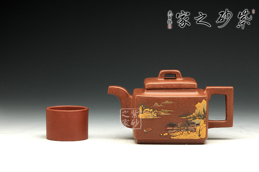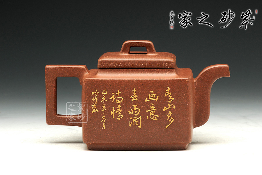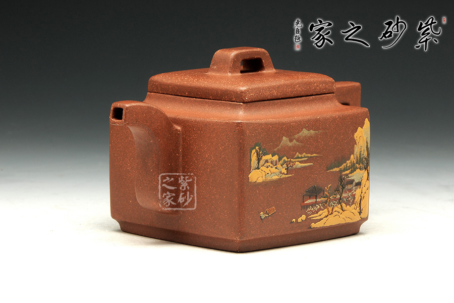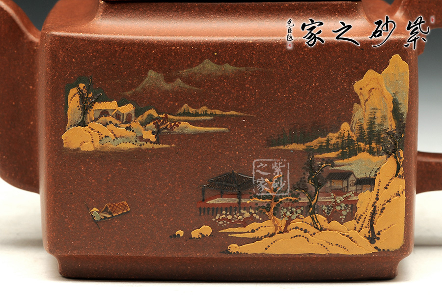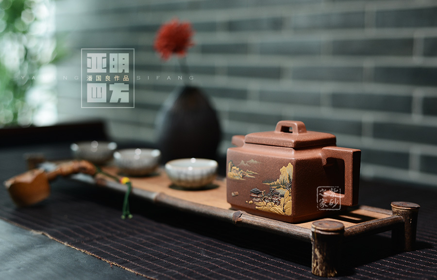 這款亞明四方雖為經(jīng)典器型,然而在潘老師手中形神俱備,砂質(zhì)粗礦。方形橋鈕,寬厚有力。四方鼓蓋,折線分明,截蓋壓于壺口之上,氣勢雄大。