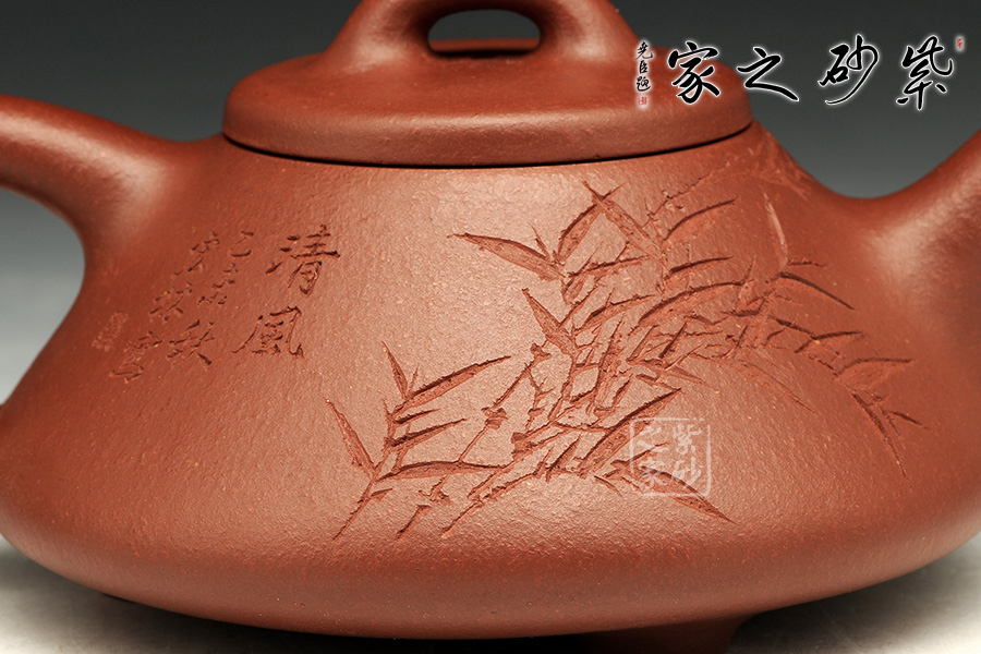 吳建平老師作為石瓢大師,其作品質樸自然,格調高雅,神韻躍然,多次獲獎,并被各大博物館收藏。壺身上斂下豐,的流把做工細致,整體比例勻稱,器型優(yōu)美;壺身上刻有片片竹葉,生機勃勃,寓意竹之堅強不屈的高尚品格;在壺身反面,幾個剛勁有力的刻字,刀法剛勁有力,文化韻味十足;此款作品,為老師全手工制作,歷時數(shù)月,收藏升值。