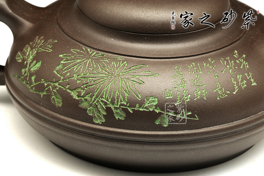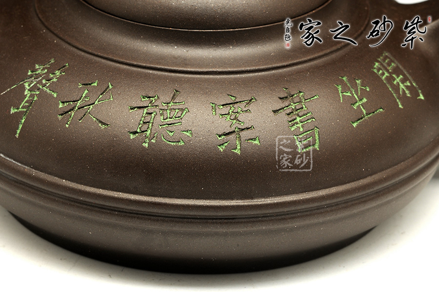 此款線扁壺制得非常有層次感,扁圓鈕、微鼓蓋,壺頸裹云肩線,溜肩線條流暢,壺腹束線圓線,由小到大,層層鋪開,很有立體美感。老師選用原礦紫泥制壺,色澤內(nèi)斂,很好地體現(xiàn)了泥料的古樸肌理美感,加以刻繪裝飾,美壺一把,值得養(yǎng)用!
