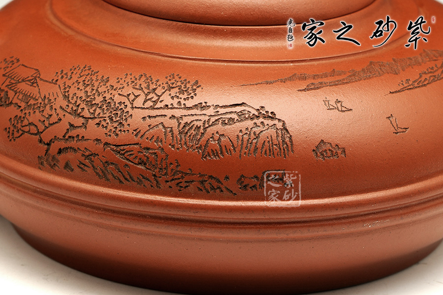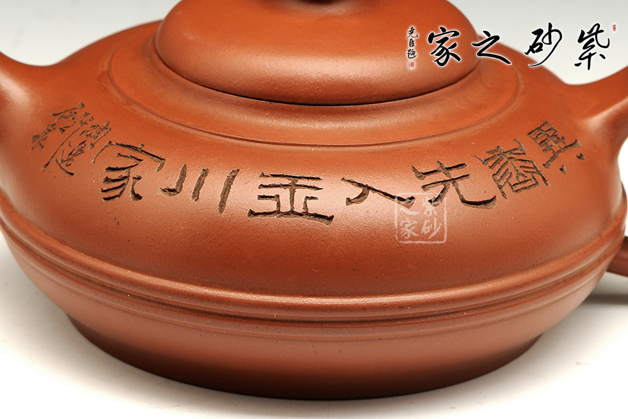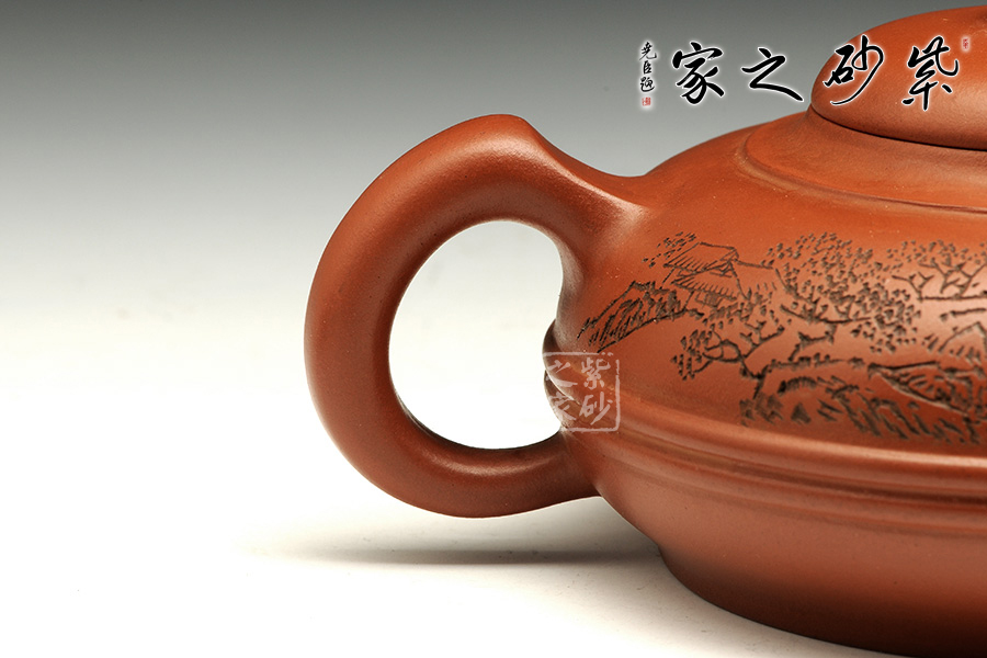 此款線扁壺制得非常有層次感,扁圓鈕、微鼓蓋,壺頸裹云肩線,溜肩線條流暢,壺腹束線圓線,由小到大,層層鋪開,很有立體美感。老師選用原礦紫泥制壺,色澤內(nèi)斂,很好地體現(xiàn)了泥料的古樸肌理美感,加以刻繪裝飾,美壺一把,值得養(yǎng)用!