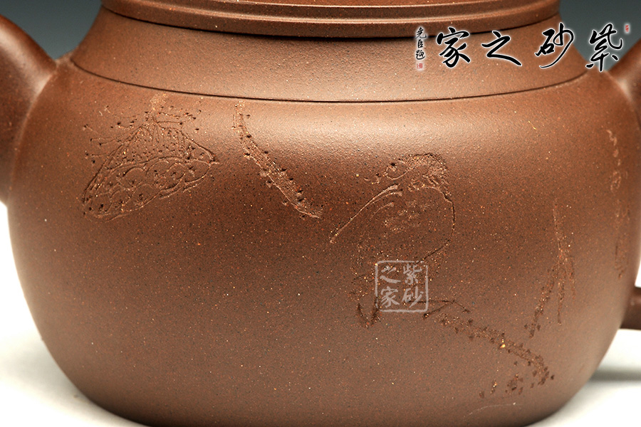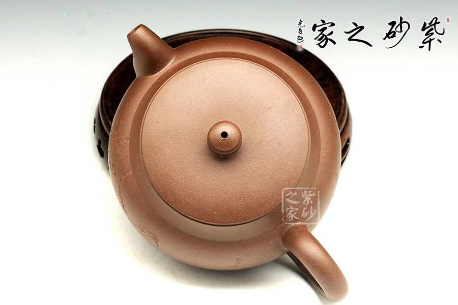 此壺壺身飽滿圓潤,全手工制作。平圓的壺蓋,柱形鈕,線條流暢,好似與壺身相襯,比例得當(dāng)。肩頸處過渡自然,點線之間見出魅力,子母線口蓋溫和嚴(yán)密,骨肉亭勻,簡練大方,制作頗見功力。彎流嘴胥出,在端頭下壓,柔美之姿明顯,壺柄略微上抬之后優(yōu)雅滑落而下,形成一條圓潤飽滿的弧線,樸雅大方。