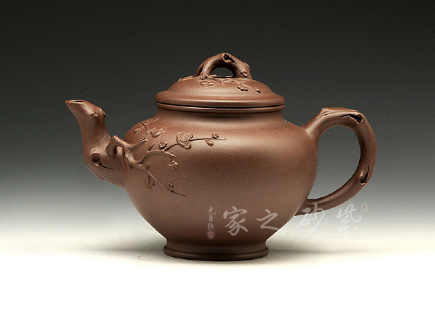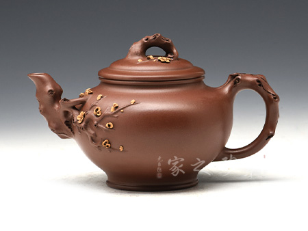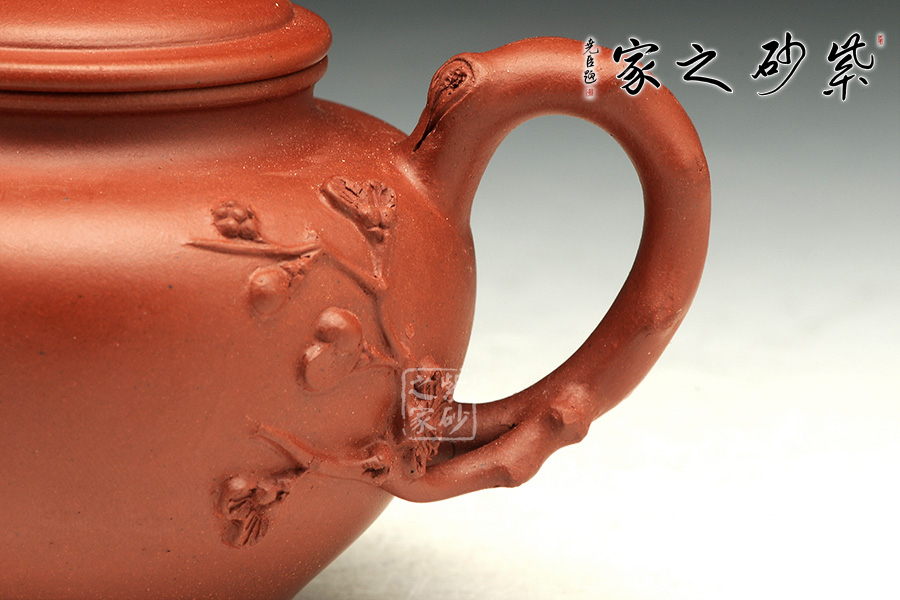 此款作品以梅為創(chuàng)作主題,圈把、彎流、橋鈕皆塑成百年梅枝的造型,紋路逼真,帶給人蒼勁與穩(wěn)健之感。整款作品線面和諧,剛?cè)嵯酀?jì),加之梅枝裝飾,更加意趣盎然;而光貨與花塑器的融合,使整件作品更具生命力;此款作品為潘菊芳老師全手工制作,采用家藏陳腐多年的原礦紅泥,泥色鮮艷,質(zhì)感特殊,為藏家所愛(ài)。