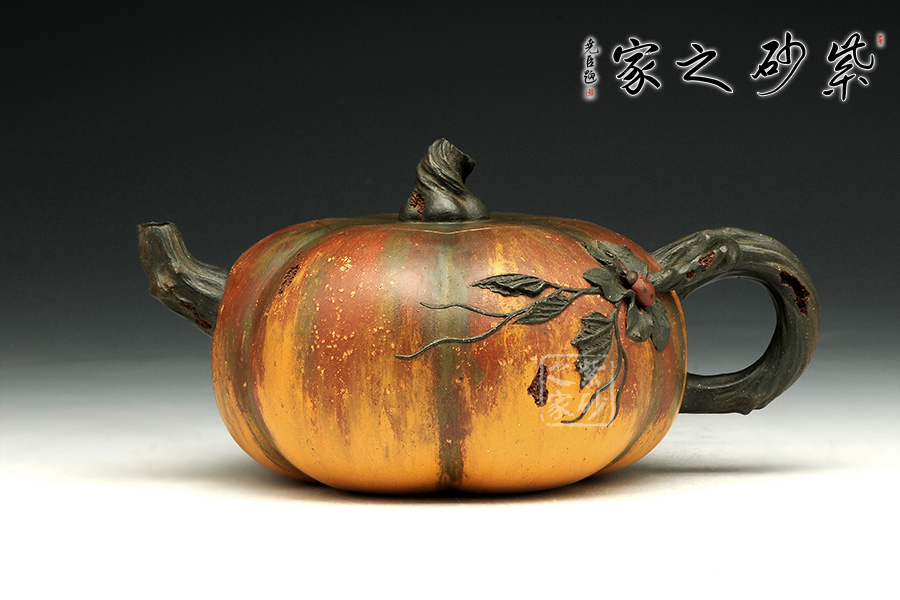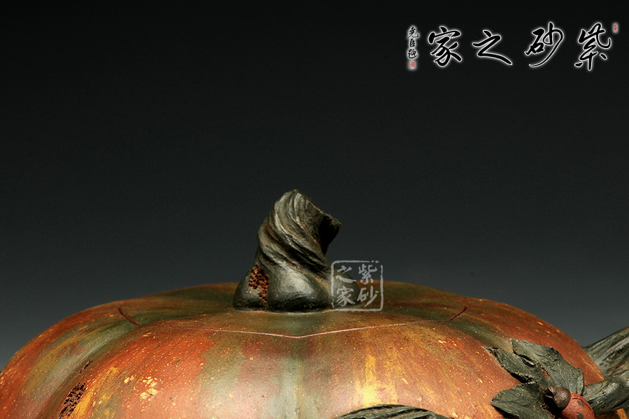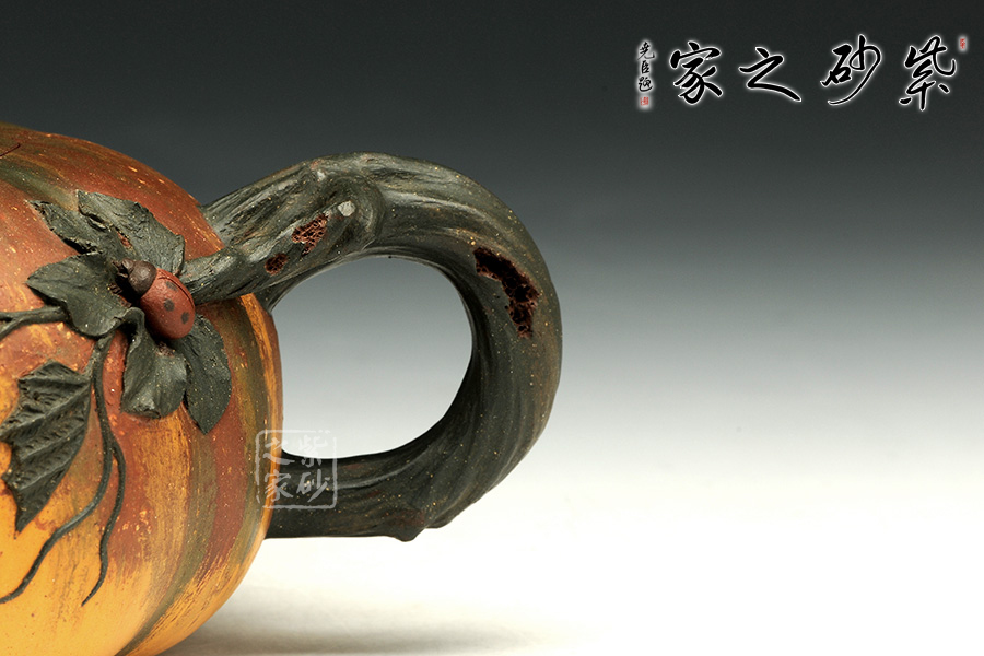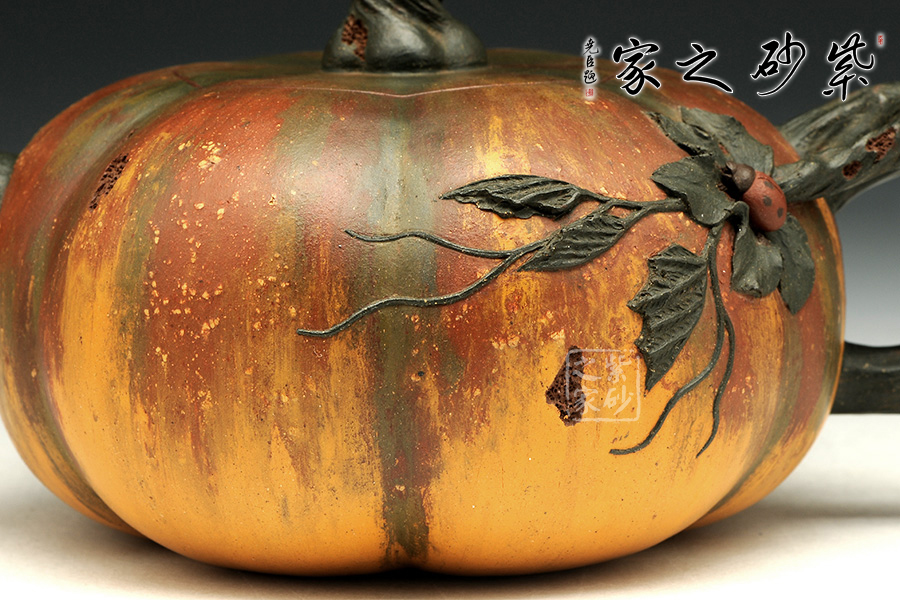 南瓜壺為經(jīng)典常見(jiàn)的花器造型。此款南瓜壺除了造型,更連色調(diào)也通過(guò)類似油畫(huà)般的效果層層渲染,使其看起來(lái)更加逼真。壺身瓜棱狀,飽滿有張力;壺嘴、把、鈕都為雕琢成藤蔓形狀,栩栩如生,而又拿握舒適,貼心實(shí)用;壺把出蔓延出的一段枝葉,為貼花工藝,曼妙自然;而那只微塑的瓢蟲(chóng),更是畫(huà)龍點(diǎn)睛,讓人眼前一亮。尤其有趣的是,作者在鈕、把、嘴以及壺身等處,連被蟲(chóng)噬咬的效果也做的惟妙惟肖,足見(jiàn)誠(chéng)意。
