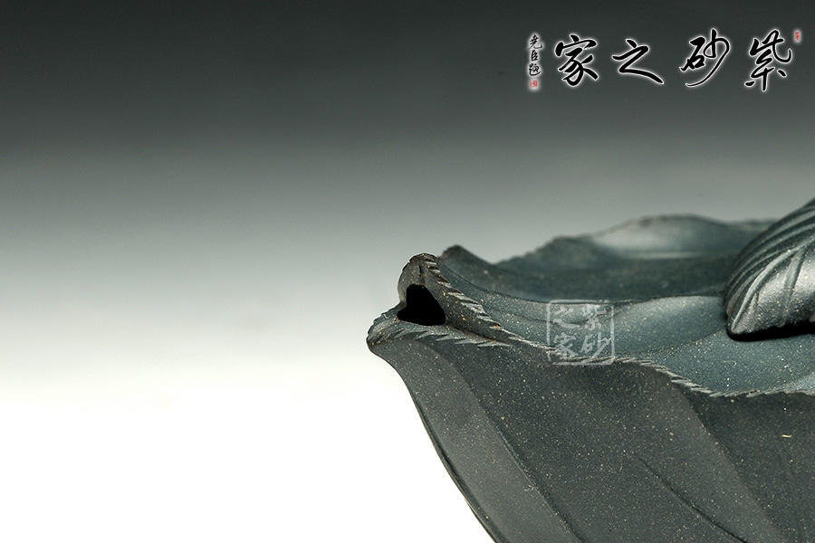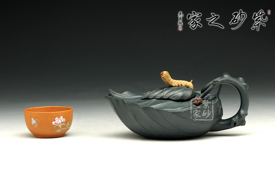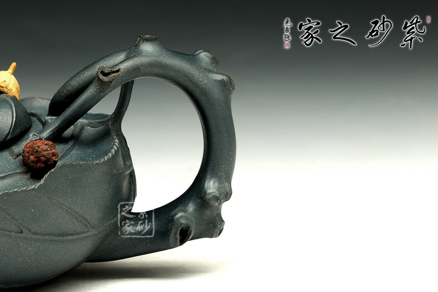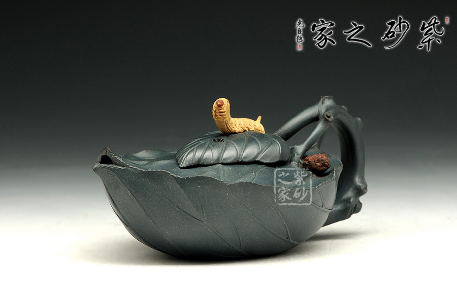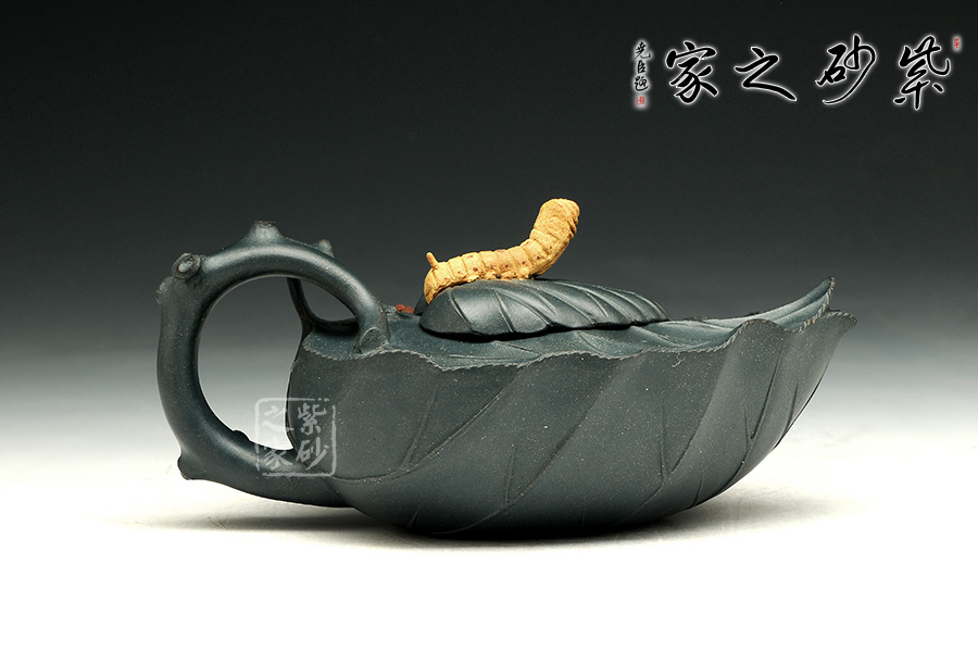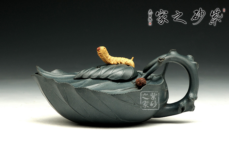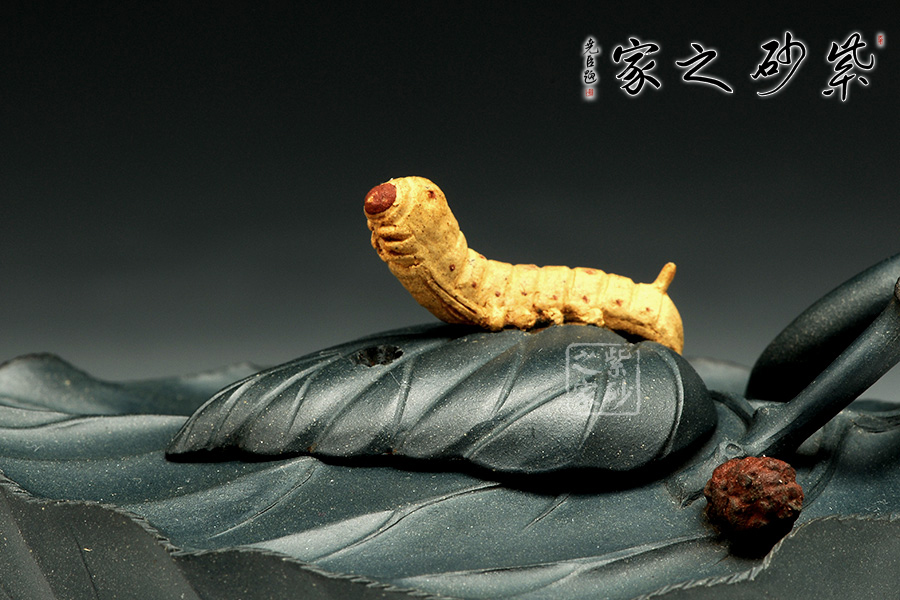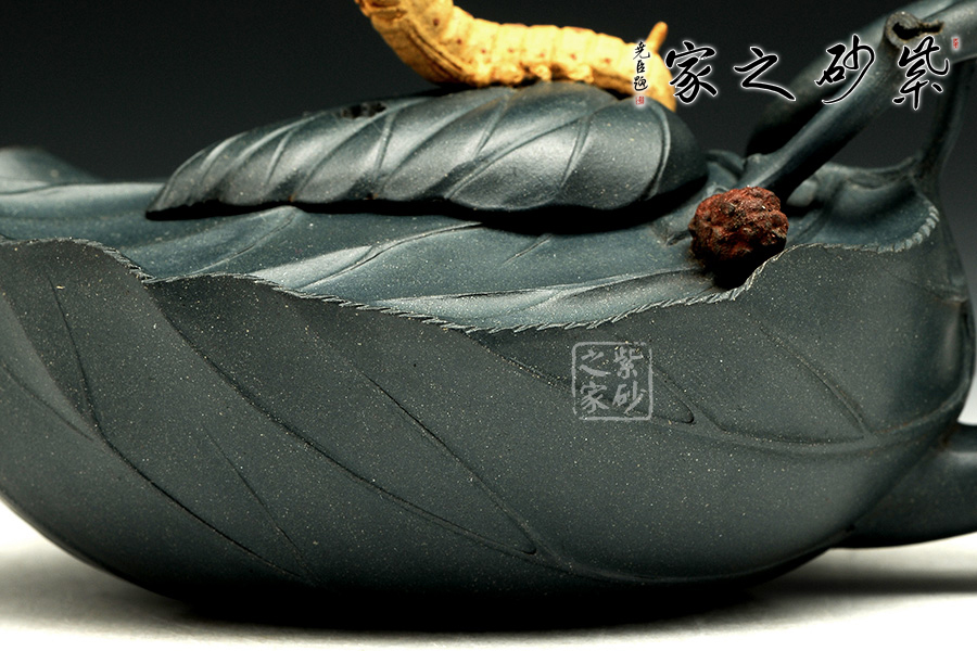 桑寶壺是謝曼倫老師的經(jīng)典代表作之一,此壺的創(chuàng)作來源于老師對生活的發(fā)現(xiàn),整器以一片樹葉為型,樹葉紋理清晰自然,十分逼真細膩,壺蓋以略小樹葉設(shè)計,壺蓋上的蠶寶寶作昂首狀,正汲取生命之養(yǎng)分;壺體上碩大的桑果栩栩如生,令人垂涎欲滴,顯示了大自然旺盛的生機,同時也留下許多兒時的回憶!