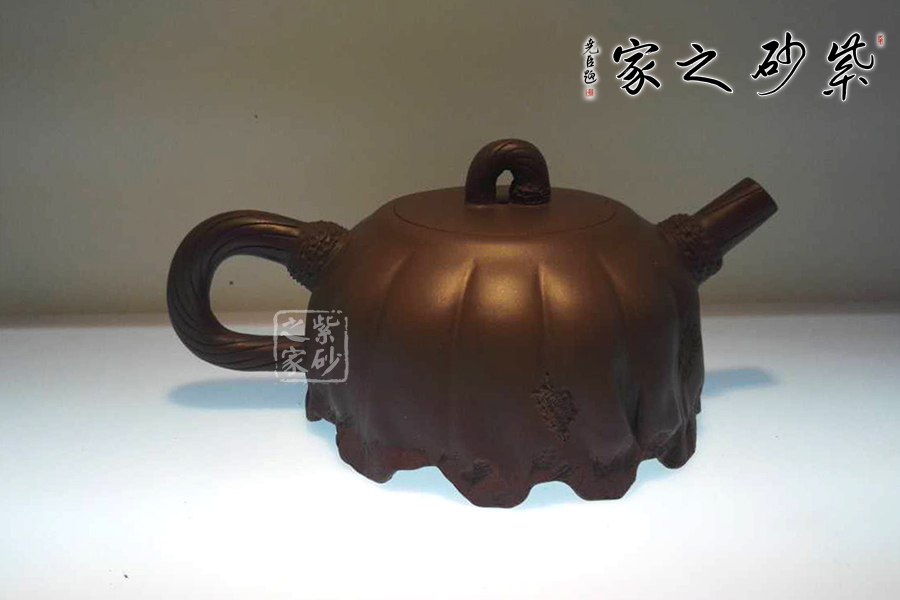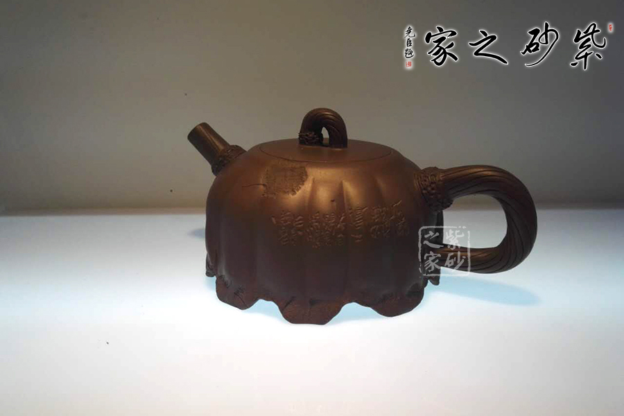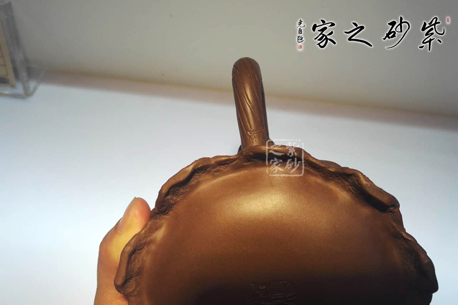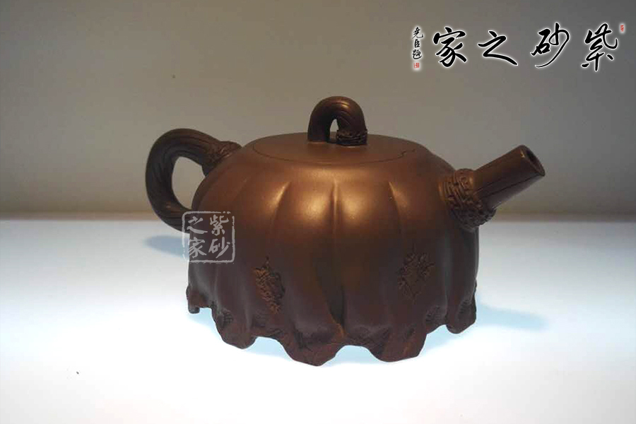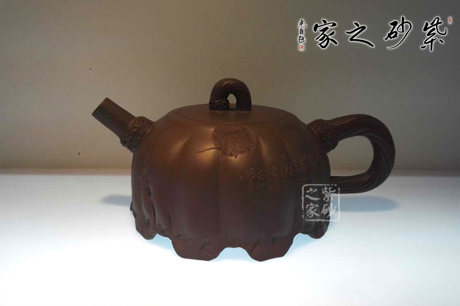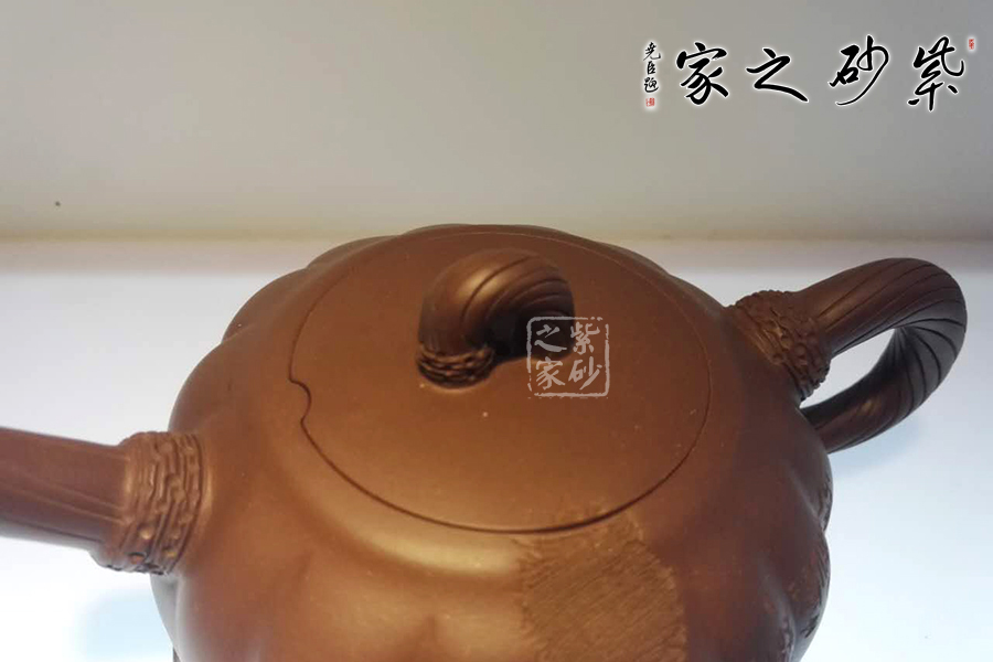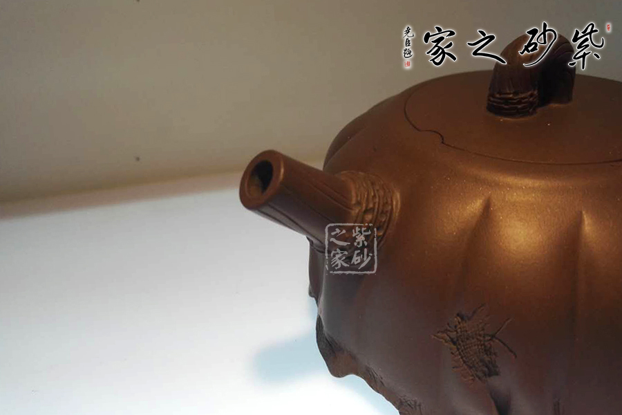 此款作品以瓜為形,壺身敦重樸實,選用上乘紫泥泥料制作,又顯得穩(wěn)重而大氣。同時這亦是款筋紋器造型壺,筋紋要求隨著壺身的形體變化而深淺自如,線條紋理清晰流暢,做工嚴(yán)謹(jǐn),達(dá)到了無比精密的程度;此壺壺身圓潤,大氣渾厚,直流嘴出水有力,斷水利落;220CC容量壺型,制作難度極大;壺身凹凸相間,線條流暢,顯示出作者深厚的技藝功底。