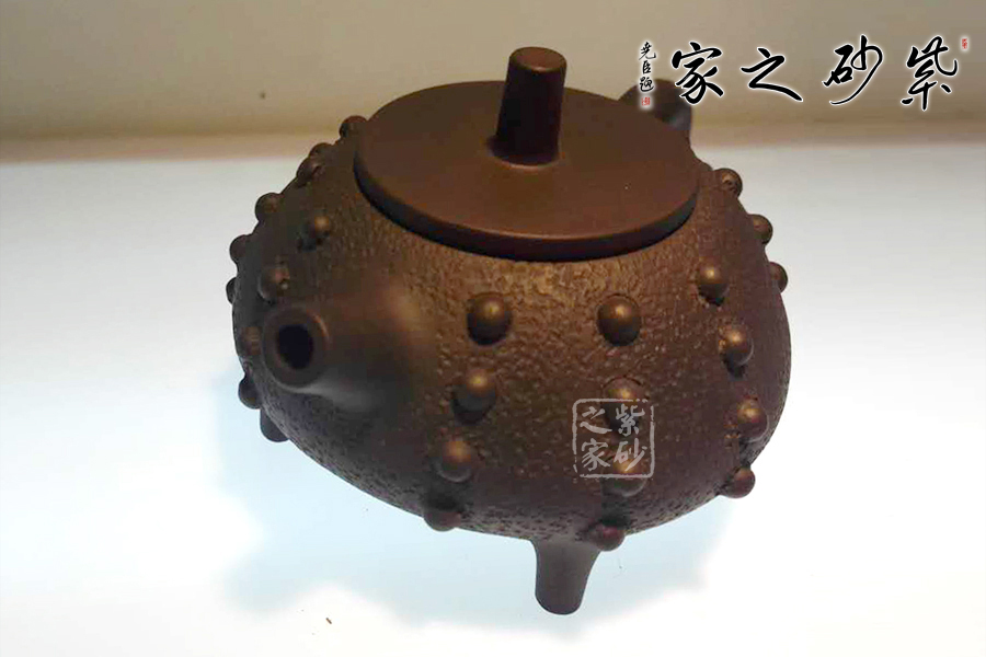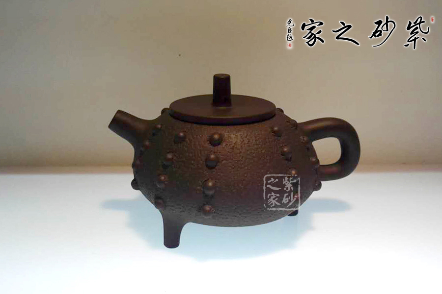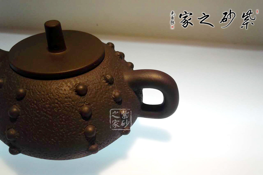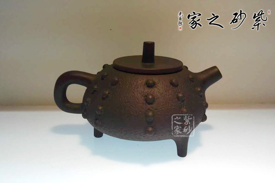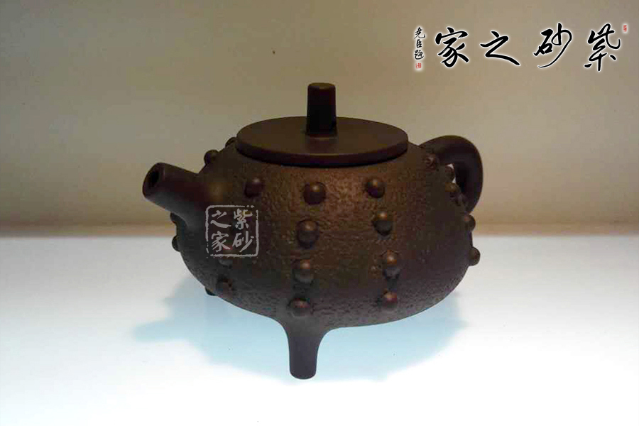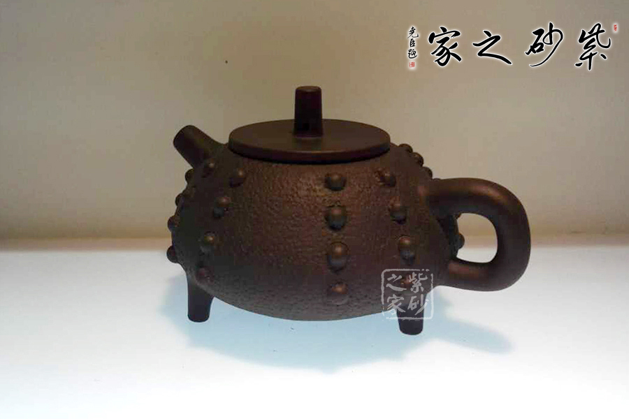 此款作品造型取自青銅器具,器型敦厚,古樸典雅。壺身遍布大小對(duì)等的小圓球,做工極其精湛,彰顯出壺身的內(nèi)在張力;壺底三足,高高挺立,器宇軒昂;直流嘴,出水流暢,斷水利落;壓蓋與壺口之上,氣密性極佳;柱形鈕,拿捏舒適;圈把線條流暢自然。此款作品為老師全手工制作,費(fèi)時(shí)費(fèi)力,收藏升值。