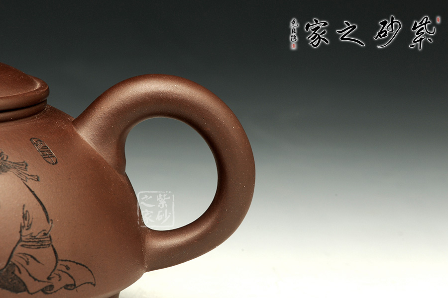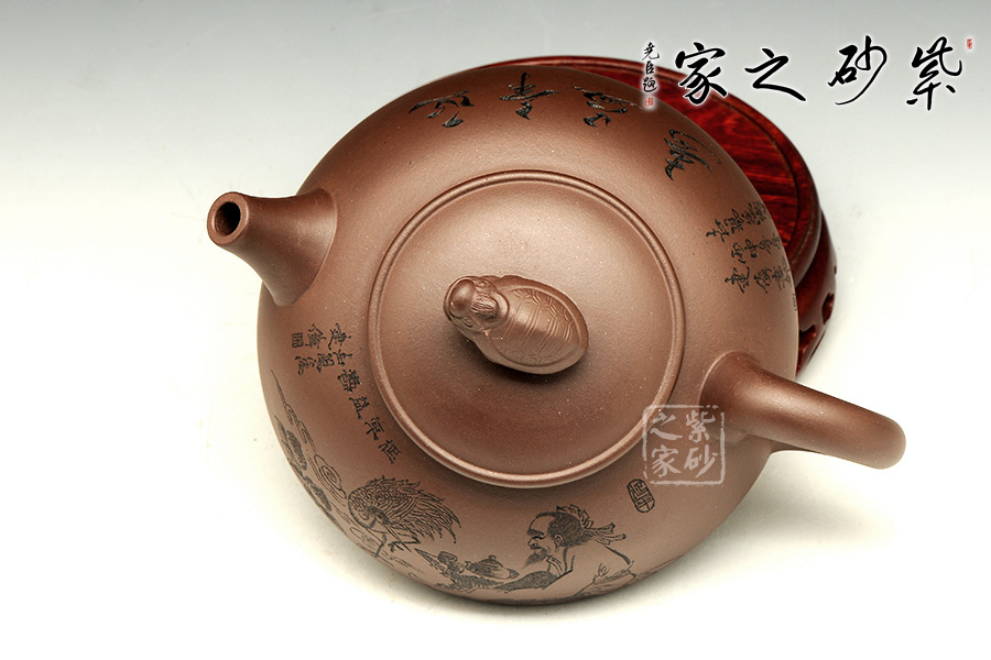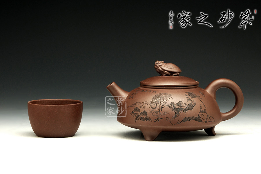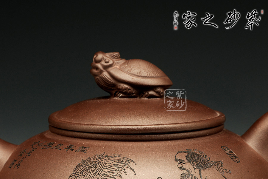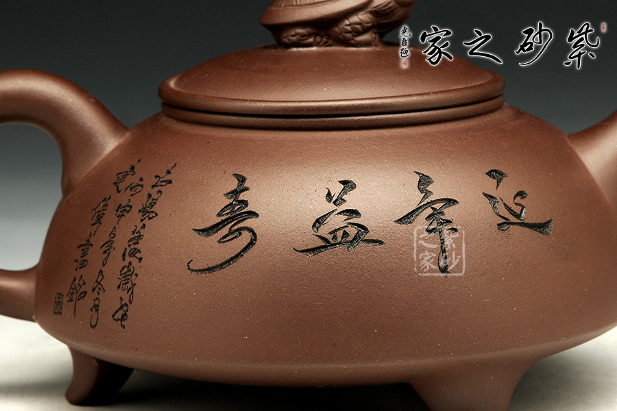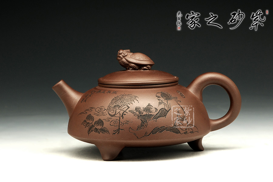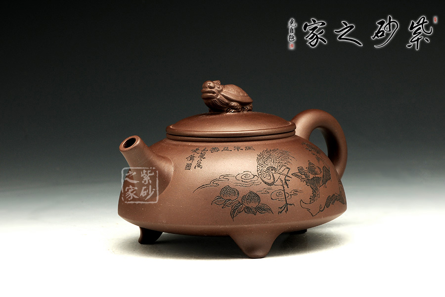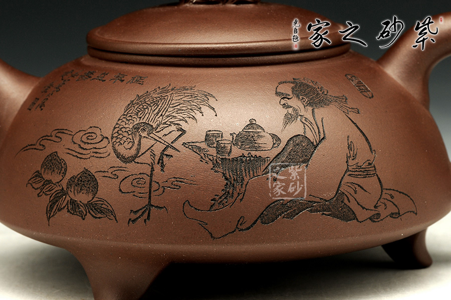 壺身造型端莊,三底足高高立起壺身,彰顯此壺內(nèi)在張力;壺身正面刻繪人物和一只可愛的仙鶴,刻繪極其細(xì)膩,線條處理精湛,人物栩栩如生;壺身反面篆刻“延年益壽”四字,老師以刀為筆,刀法剛勁有力,壺身字體灑脫,風(fēng)骨畢露,彰顯文人魅力;壺身的亮點(diǎn)在于壺鈕,壺鈕以龜為形,寓意延年益壽之意;此款作品,老師精選原礦紫泥全手工制作,費(fèi)時費(fèi)力,幾易其稿,最終成形,品茗把玩再好不過,收藏升值!