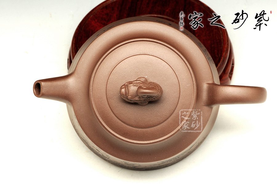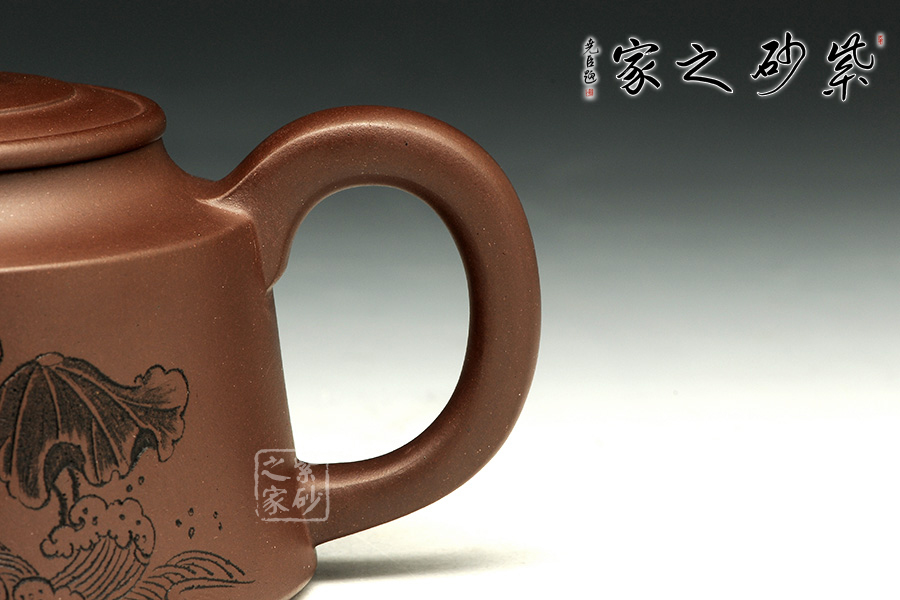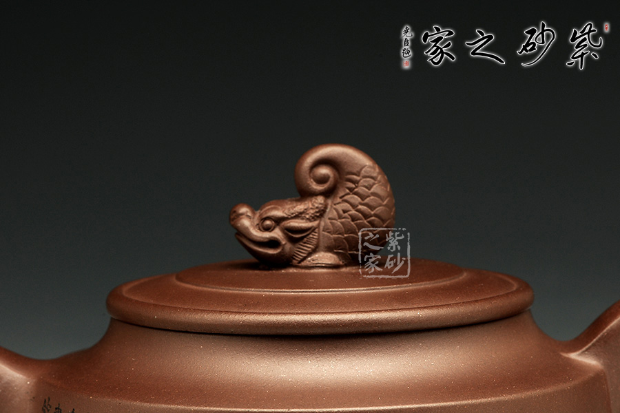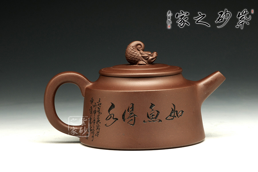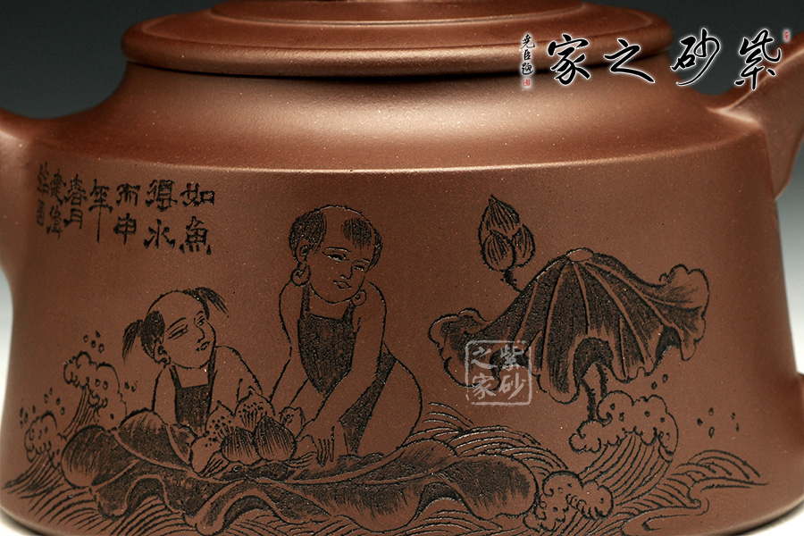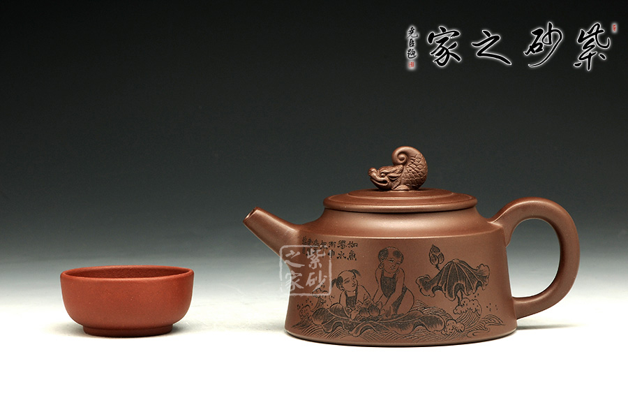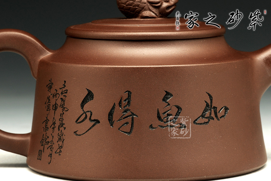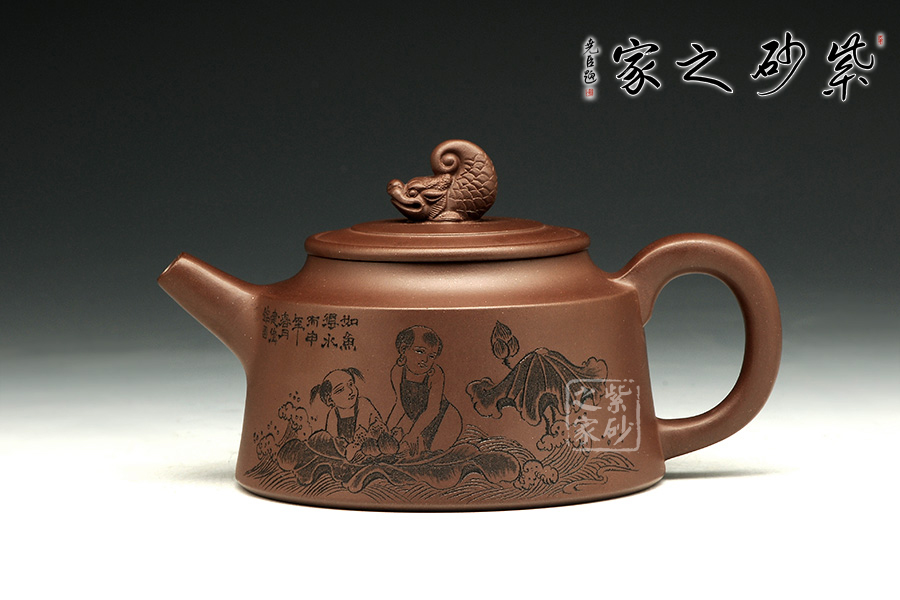 壺身造型敦厚、穩(wěn)重。壺鈕以魚為形,設(shè)計的極為可愛,栩栩如生,富有神韻;壺口邊沿,線條緩緩傾斜,流暢自如,十分精湛;壺身雙面雕刻,正面刻繪湖水中玩耍的童子,人物形象,個性十足;壺身背面刻繪“如魚得水”四字,字體風(fēng)骨畢露,灑脫自如。此款作品,為朱萍萍老師全手工制作,壺身采用原礦紫泥煉制,色澤古樸,質(zhì)感特殊。
