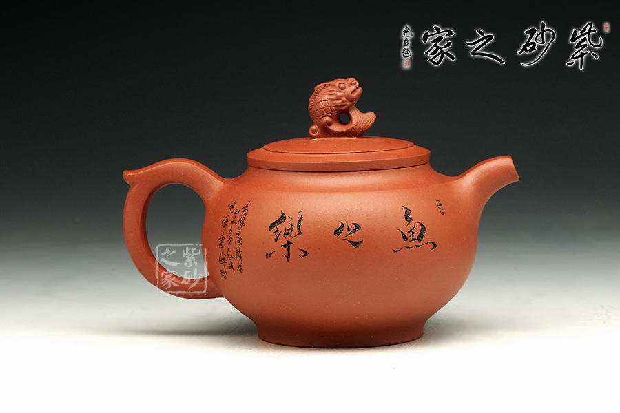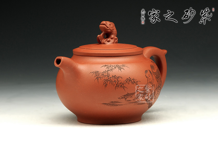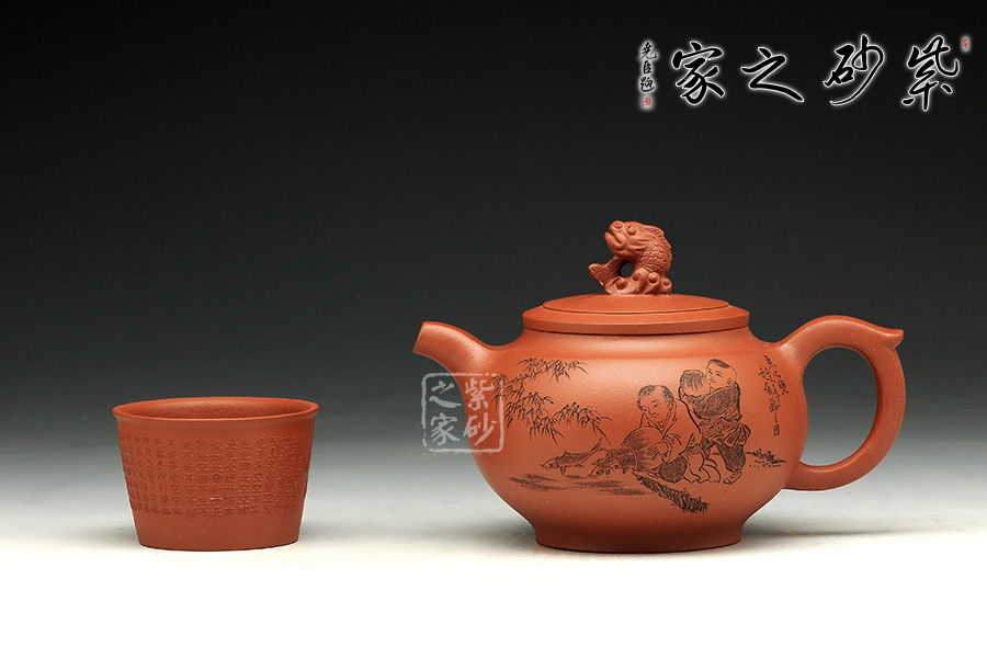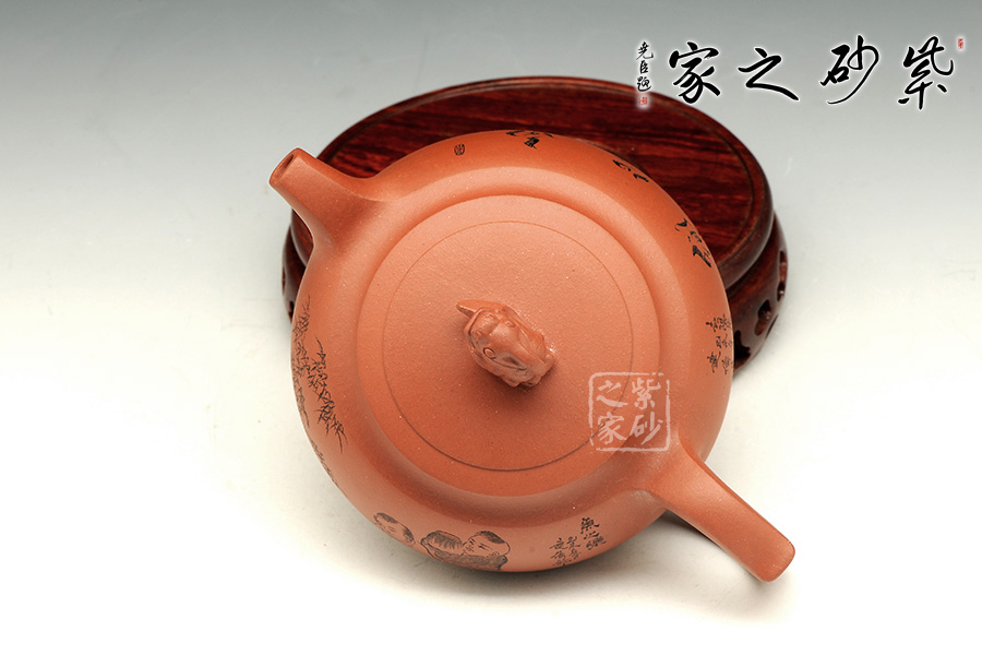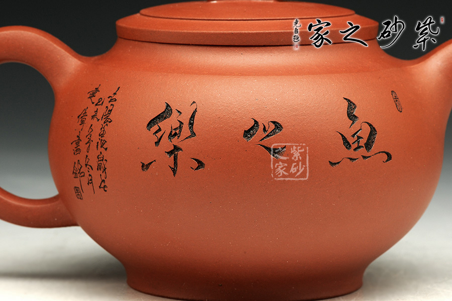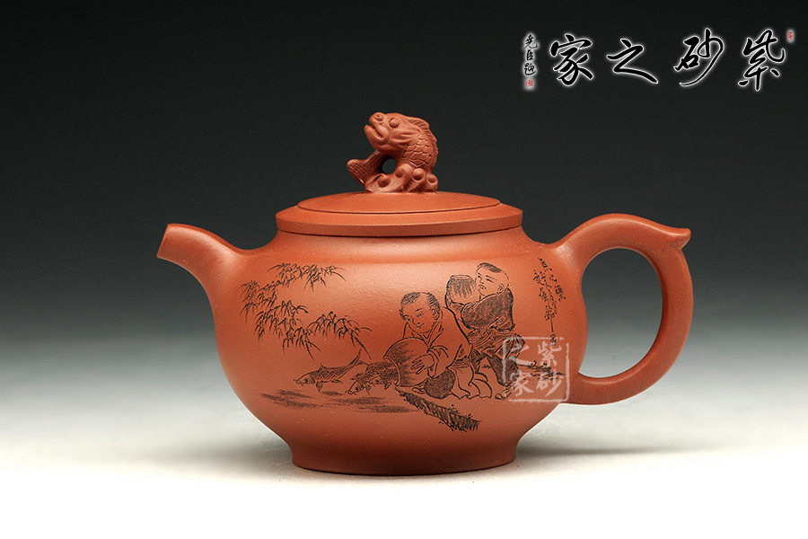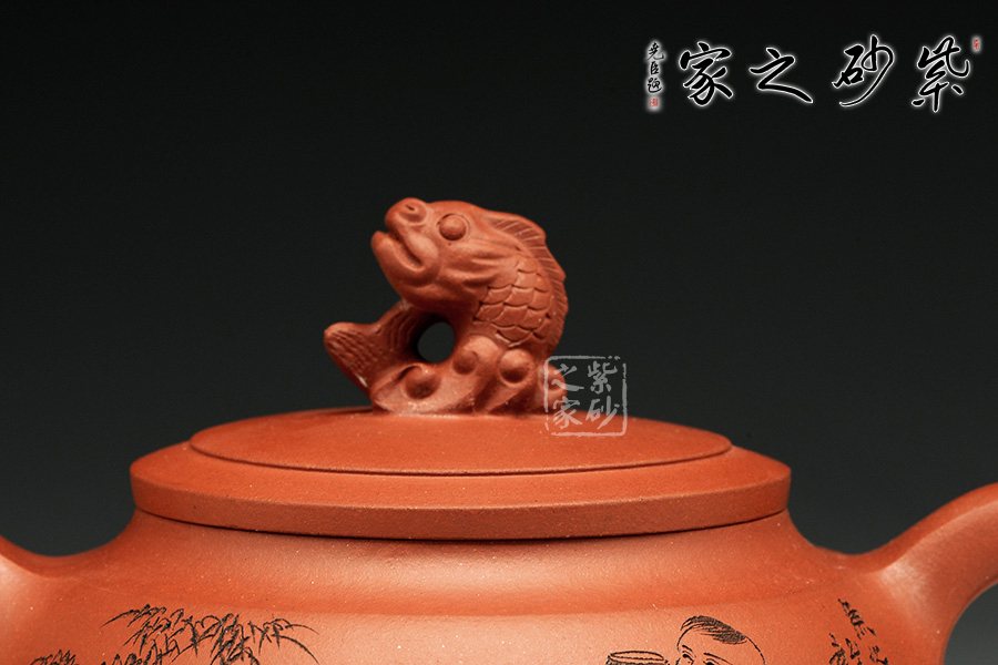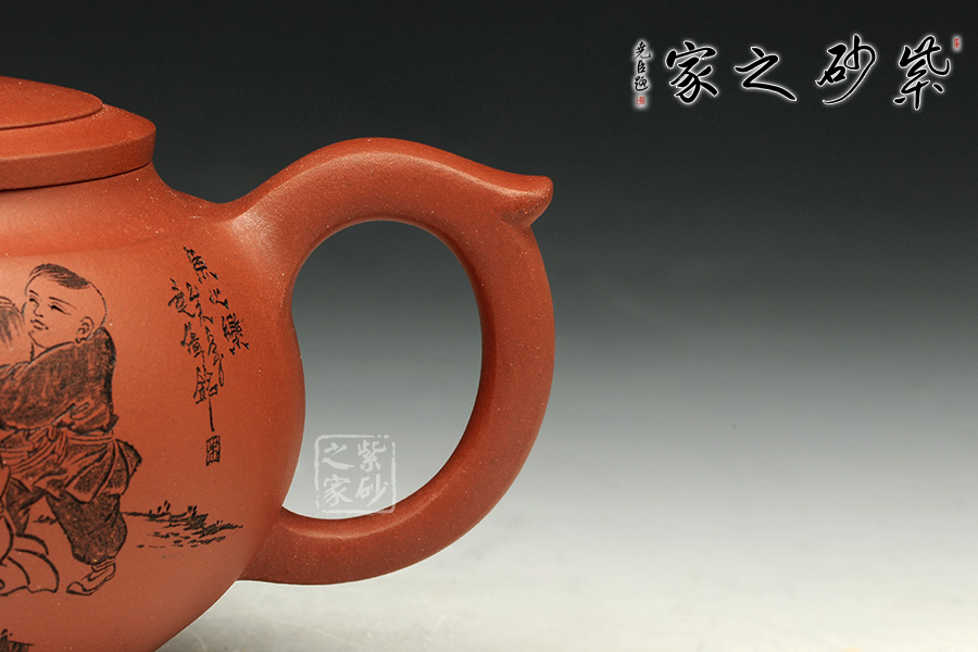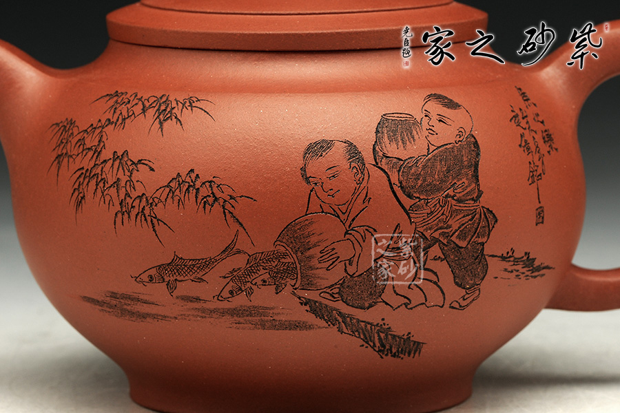 此款作品造型飽滿,風韻十足,此壺以魚為創(chuàng)作主題,魚寓意美好、吉慶、年年有余、金玉滿堂等。此款作品雙面刻繪,正面刻繪童子,人物栩栩如生,神態(tài)動作刻繪的極其生動;壺身反面篆刻“魚之樂”,筆墨酣暢淋漓,筆法圓潤蒼勁,大氣磅礴,矩度嚴謹,自然天成;此款作品,采用原礦清水泥制作,泥色醇和爾雅,文人氣息濃厚,收藏升值。