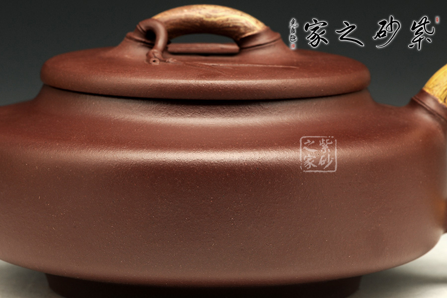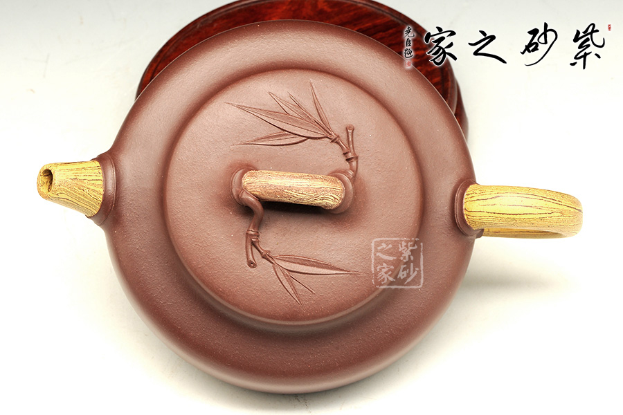 此款作品以竹為創(chuàng)作主題,寓意竹的堅強不屈的精神;此壺采用原礦紫泥制作,泥色古樸,質(zhì)感特殊,易泡養(yǎng);壺身線條流暢自如,壓蓋設(shè)計,壺鈕以一節(jié)竹枝為形,形象生動,做工極其精湛;此款作品,尤其難得的是,壺嘴、壺把和壺蓋皆以絞泥裝飾技法與傳統(tǒng)制壺相結(jié)合,并融入中國傳統(tǒng)文化精華,形成了自己的風(fēng)格特色,突出了自己的鮮明個性,令人喜愛。