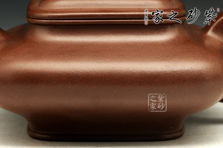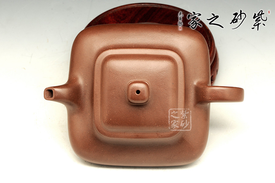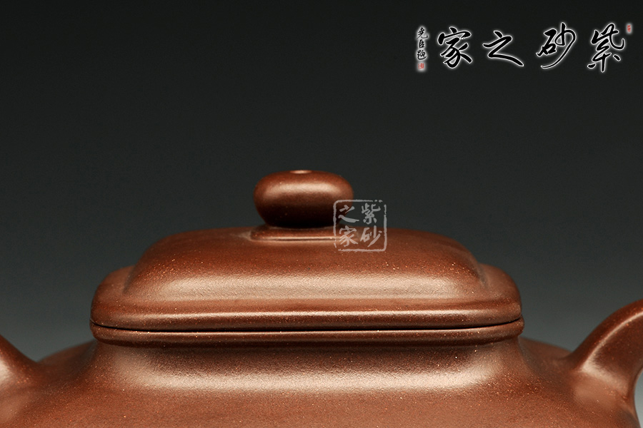 瞿建明老師這把“四方虛扁”壺,采用原礦紫泥制成,泥質(zhì)極佳,成色上等;器型上扁而不塌,暗蘊力道,反而極覺挺拔之氣;壺體看似形容略小,卻有250cc的肚量;四方體,四方底,四方蓋,四方鈕,方圓并濟、剛?cè)崛谇?,恰到好處地展現(xiàn)了一把方器的挺拔剛毅之美。