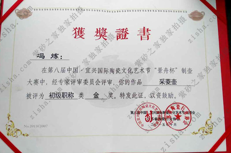 馮煉,高級工藝美術(shù)師,師承江蘇省工藝美術(shù)大師徐元明,自幼酷愛美術(shù),書法,自幼對紫砂藝術(shù)產(chǎn)生濃厚的興趣,在興趣的指導下,苦練紫砂技藝,并得到了多位名師的指導,技藝日趨成熟,光貨秀麗,方貨端莊,尤為擅長的筋紋器更是巧奪天工,美輪美奐。作品大方典雅,獨具一格,深受紫砂愛好者的喜愛和青睞。獲評“陶都宜興優(yōu)秀青年陶藝家”,2014宜興市首屆雙橋杯手工制陶大賽一等獎;2015、2016、2018年獲宜興市手工制陶大賽一等獎;首屆景舟杯金獎,獲直升工藝師的資格;2016年在“中國書畫名家·陶藝家跨界交流”活動中,與中國書畫名家陳傳席、唐輝、石峰、姚新峰等合作文人壺多件。
