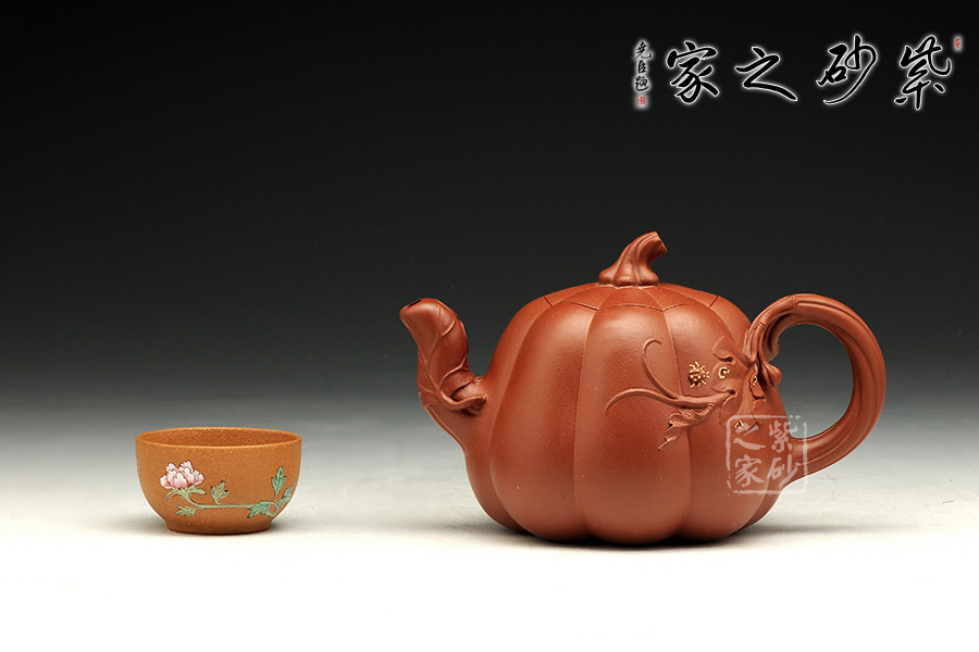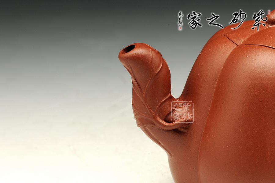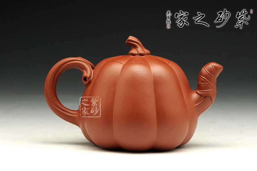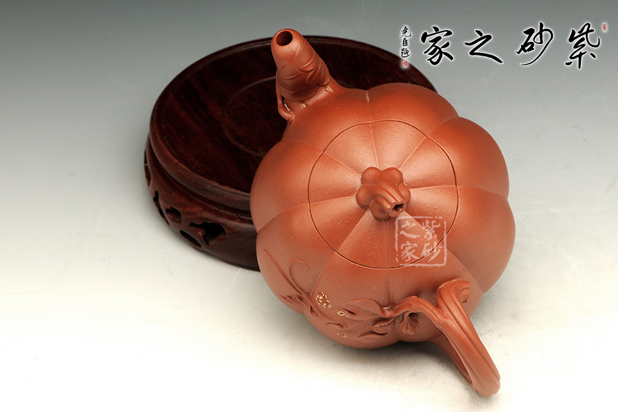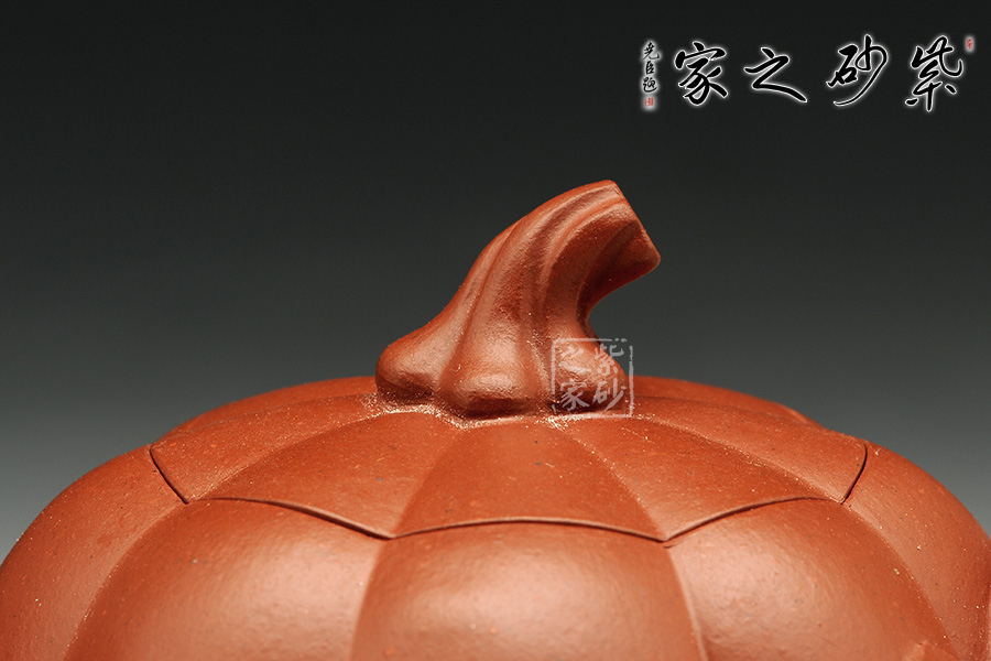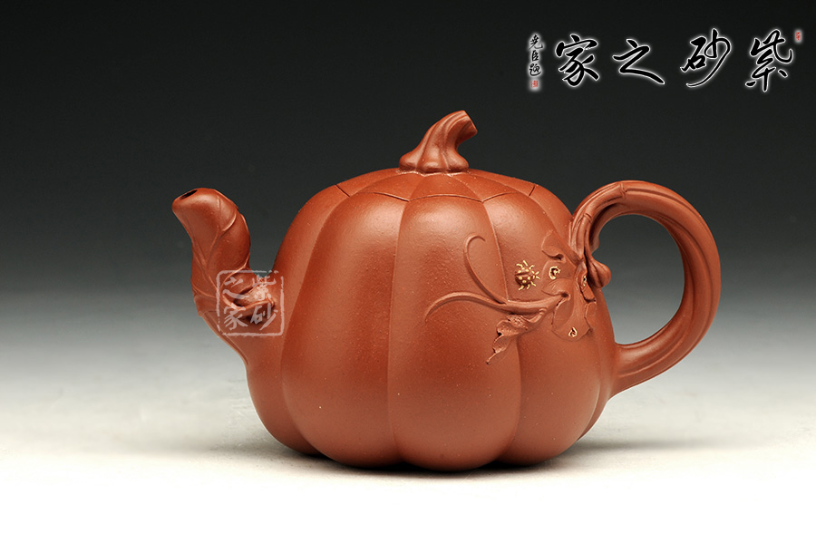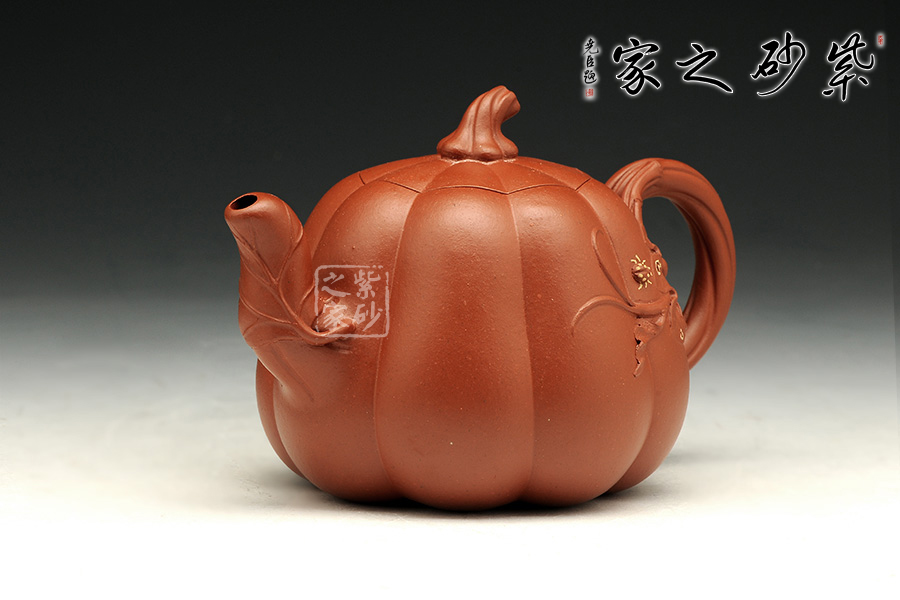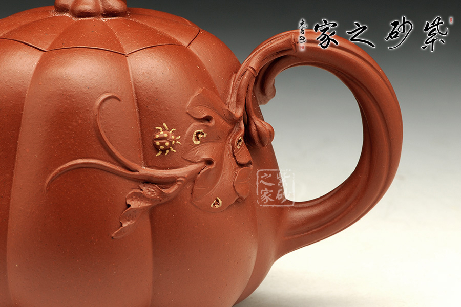 南瓜壺是紫砂壺中很常見的一種款型。此南瓜不僅外形酷似南瓜,更是集聚了南瓜的神韻,猶若瓜熟即將待落。壺鈕、壺把嫉皆以南瓜藤為原型,形象逼真。壺嘴則若南瓜葉包裹而成,精巧別致,創(chuàng)意極新。壺把處一南瓜葉子胥出,蒼老卻不失神氣。而南瓜壺身,紅色斑駁,極似熟透了的南瓜,讓人有快速采摘拿去熬湯的沖動(dòng)。此南瓜壺,顯然活矣!