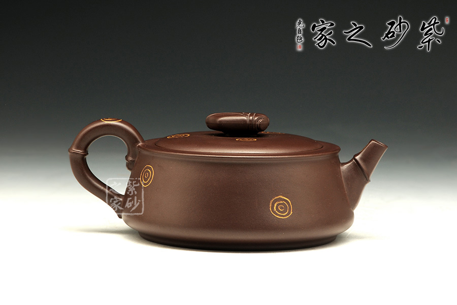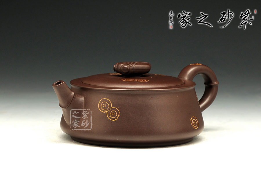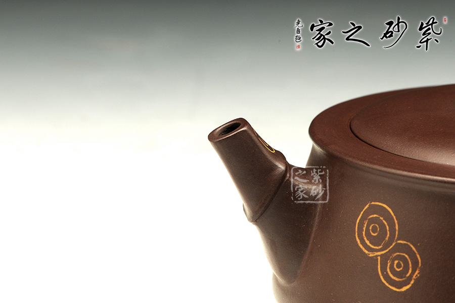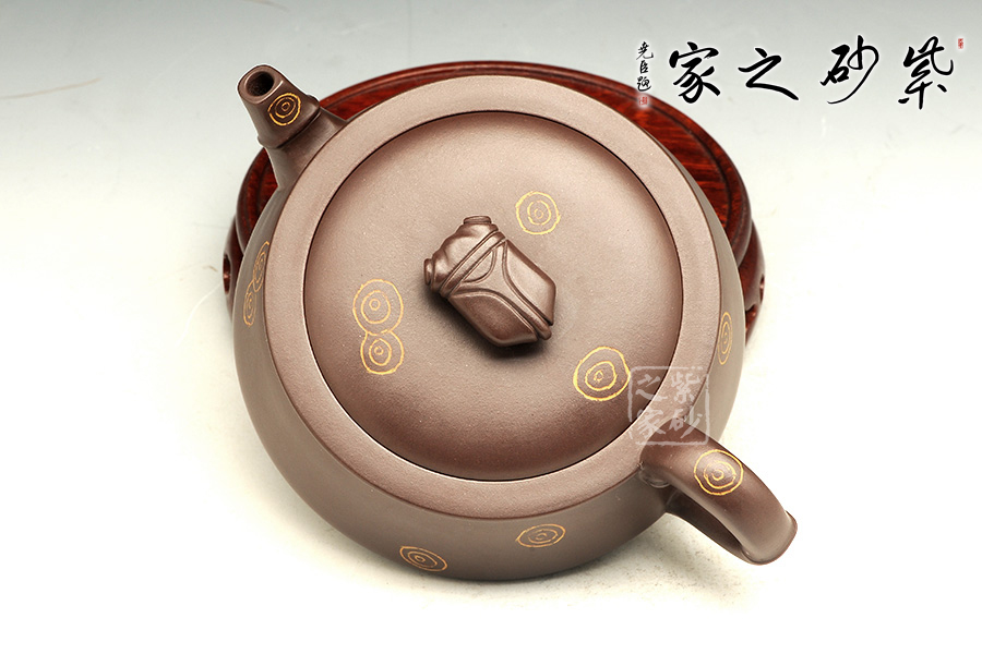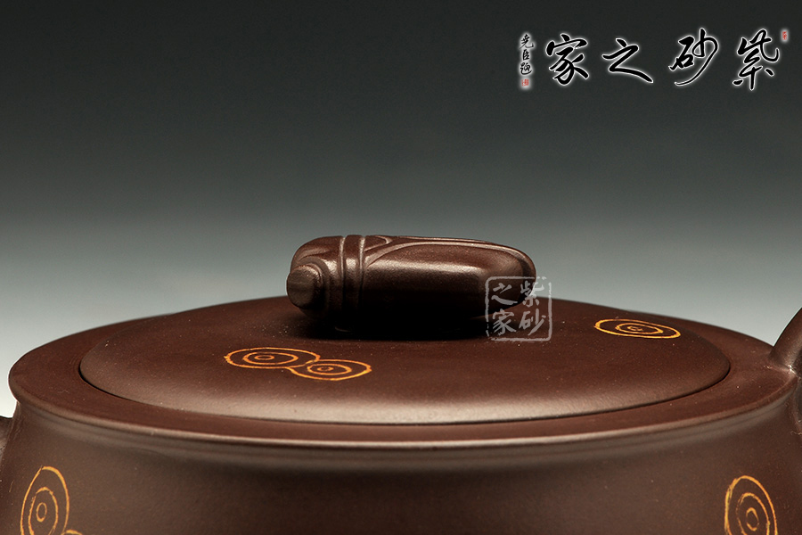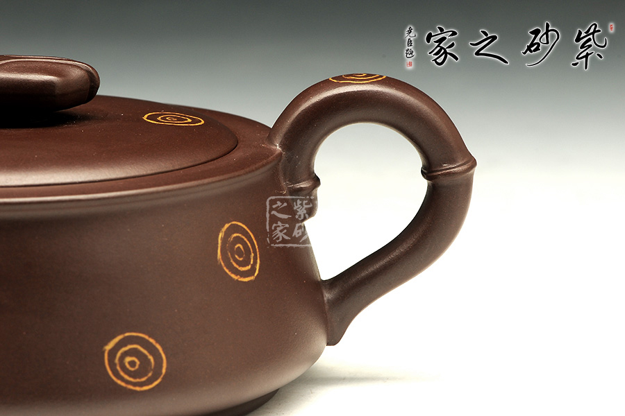 此款作品端莊、穩(wěn)重,壺身線條流暢自如,嵌蓋嚴(yán)密,氣密性極佳;壺鈕以一只蟬做壺鈕,形象生動(dòng),栩栩如生,十分可愛(ài);壺身刻繪大小不一的圓圈,線條處理的極其精細(xì);直流嘴,從壺身自然胥出,出水流暢,斷水利落;圈把,節(jié)點(diǎn)處理的精致到位,可見(jiàn)手工制作嫻熟;此款作品,采用原礦紫泥制作,泥色細(xì)膩,質(zhì)感特殊,收藏升值。