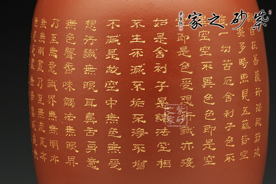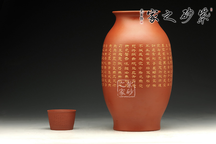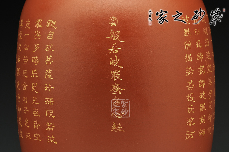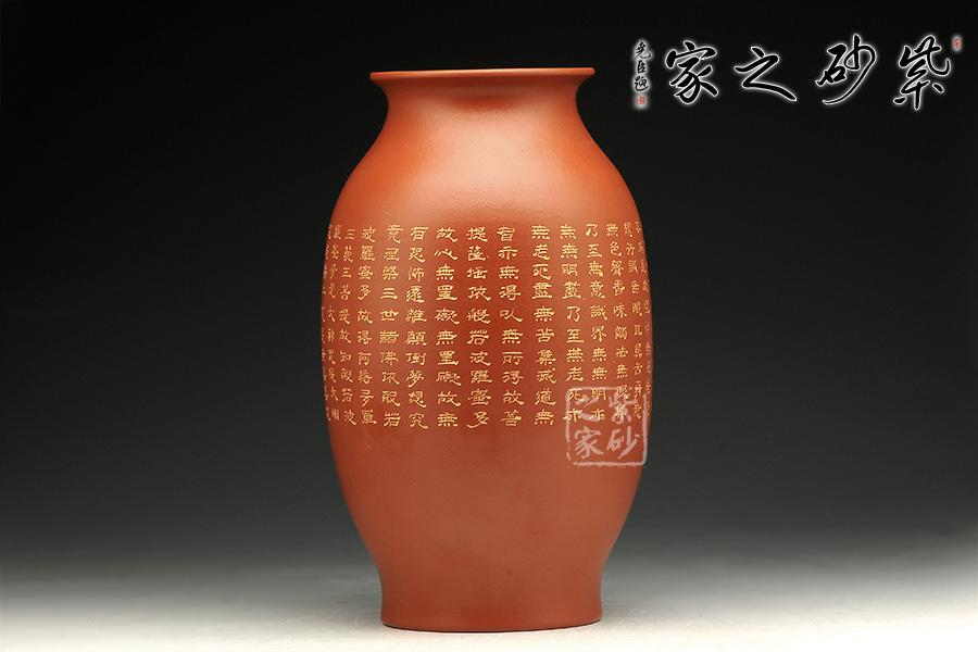 此花瓶造型極盡古典韻味,線條自然的變化間完美詮釋了紫砂的可塑性,或張揚(yáng)或內(nèi)斂。瓶身的造型豐斂有余,線條流暢。外表細(xì)膩光潔,動(dòng)人異常。通體觀之,氣韻高雅中有敦厚,妙不可言。瓶身以經(jīng)文飾之,神圣之感油然而生,流不盡的韻味。作品集賞、用、藏于一體!