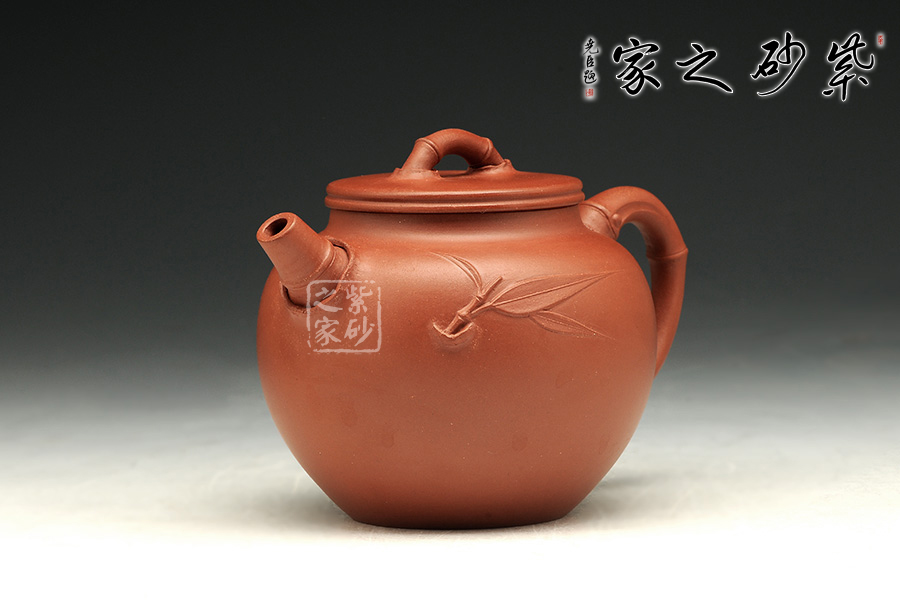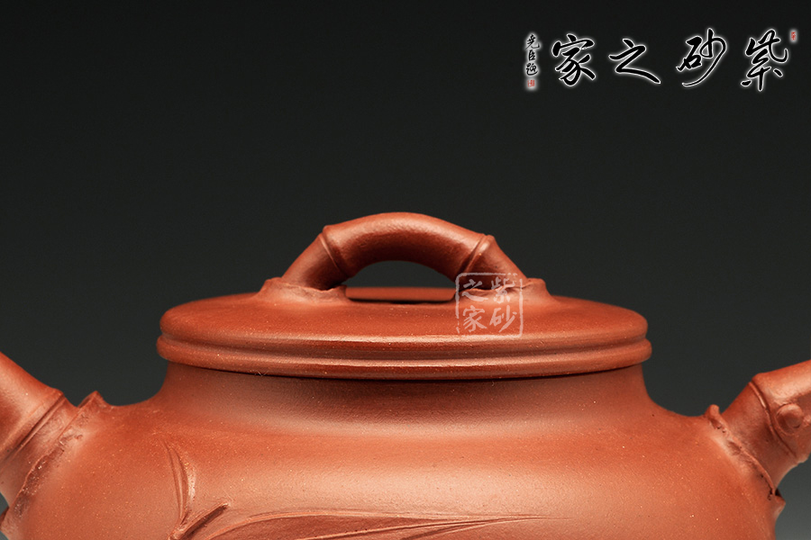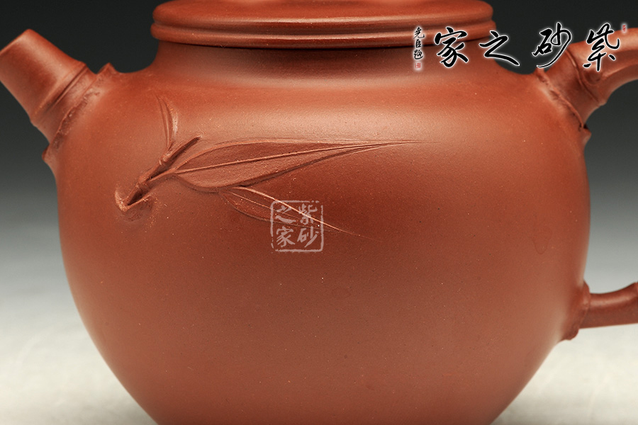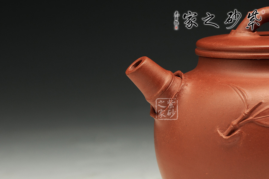 其竹造型作品蒼勁有力、硬朗俊秀。凡貼竹葉,往往信手為之,故每個壺上的竹葉之角度、動勢、造型極少相同。又制桃葉之壺,取名“桃韻”,清靈可愛。壺上的桃形裝飾源于雕塑功底,每把壺上亦各個不同,甚少重復(fù)。
