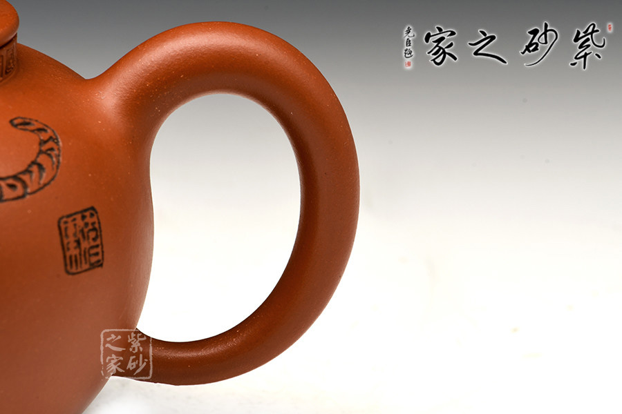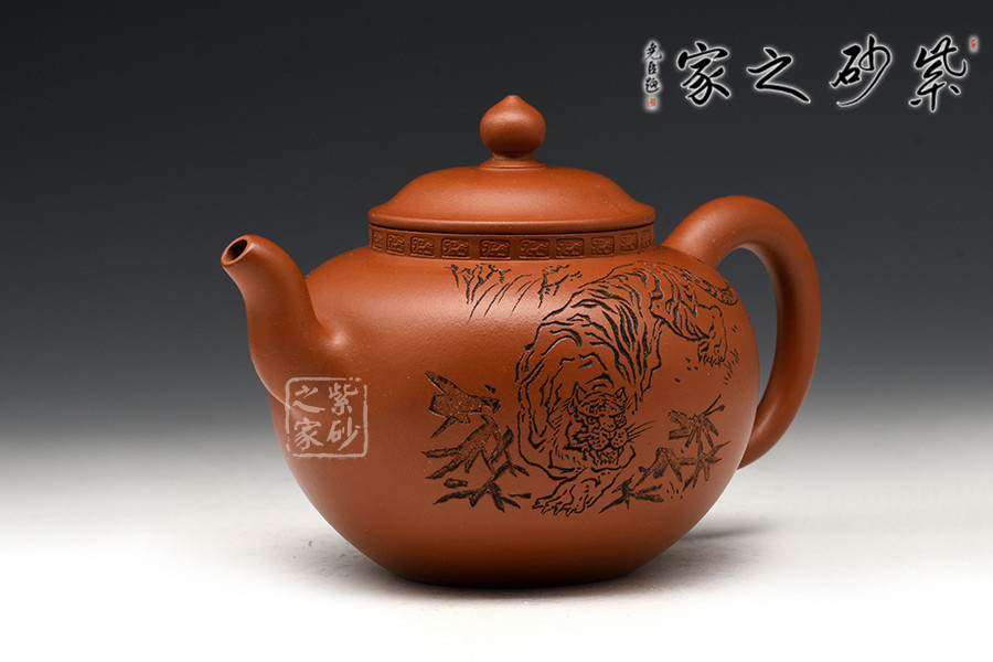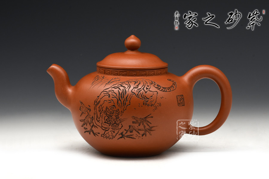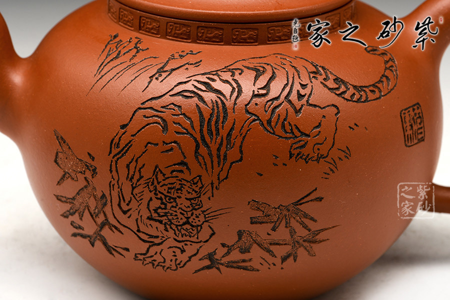 此壺是傳統(tǒng)造型,強(qiáng)調(diào)了線條的舒展和流暢,從壺嘴之間到壺把之梢一起貫通。酣暢淋漓,顯得精神,形體中的曲線、圓潤線條流暢分明。壺鈕以一粒圓珠飾之,但又如同菩提蓮子,精細(xì)巧制;嘴和壺把呈相對之態(tài),一收一放,妙趣天成。再加上其老虎生動有趣的表情的刻畫,讓人愛不釋手。