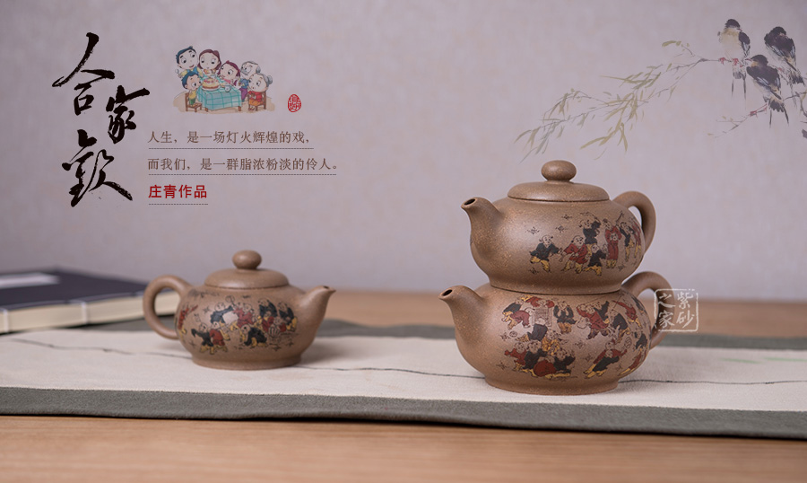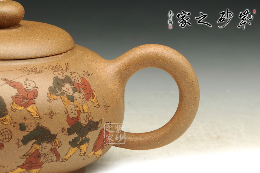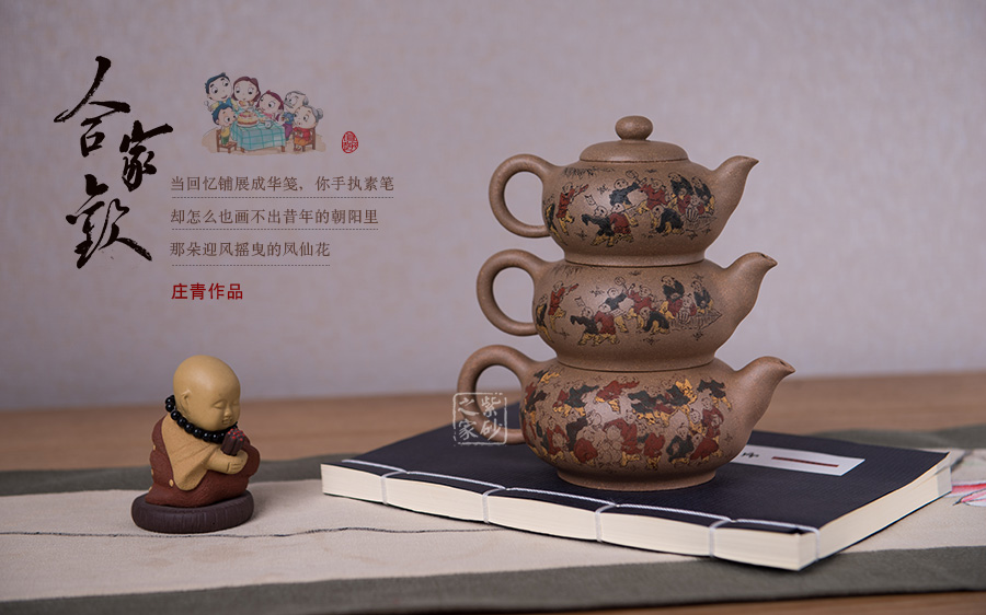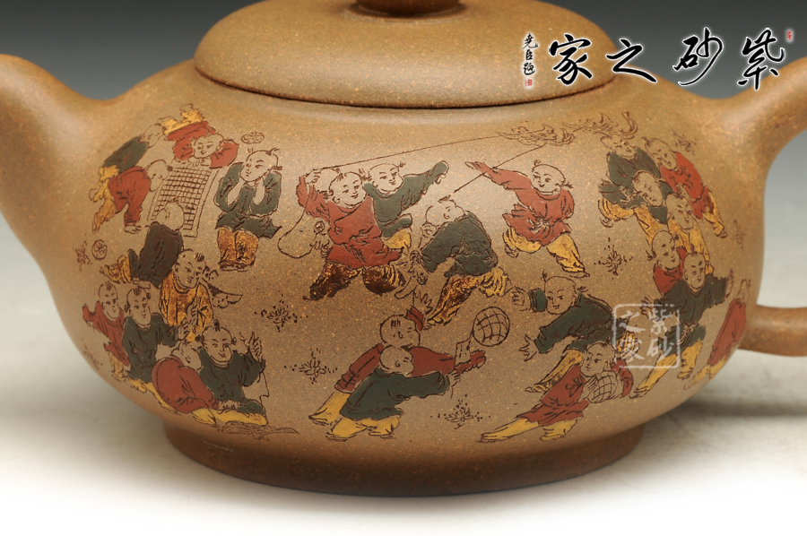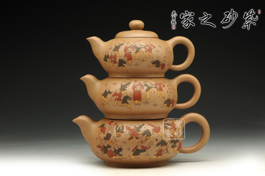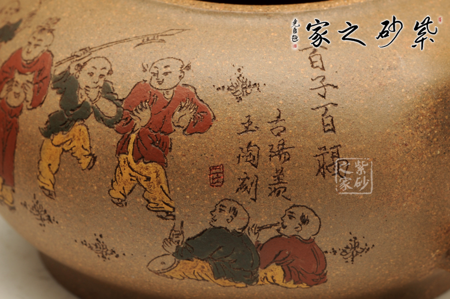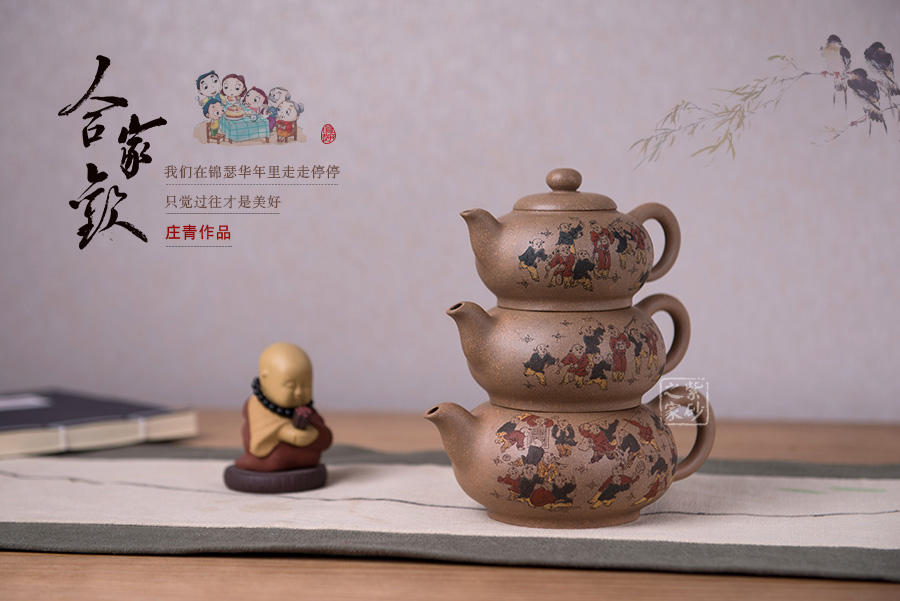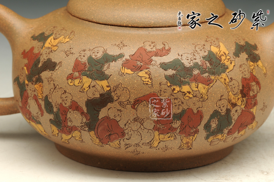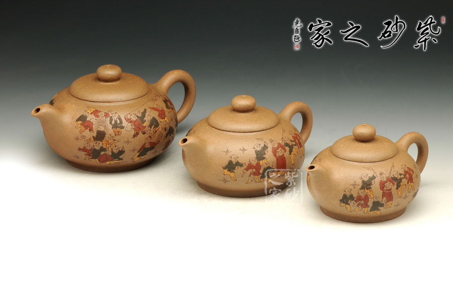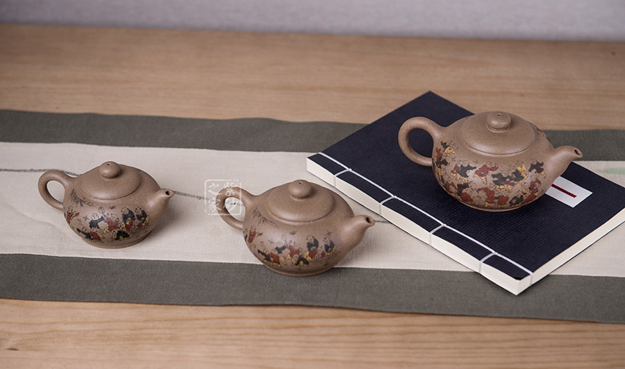 由三個(gè)紫砂壺組合而成合家歡,可謂是新穎別致。合家歡寓意一家子團(tuán)圓和睦,歡快無比。三個(gè)紫砂壺根據(jù)大小依次排列,排列有序,十分霸氣,宛若一個(gè)溫馨的三口之家。壺身上皆以彩繪的形式,老師自制自銘,展現(xiàn)了一幅百子歡聚圖,熱鬧的畫面,歡快的氛圍,絢麗的色彩,洋溢著吉祥和喜悅。