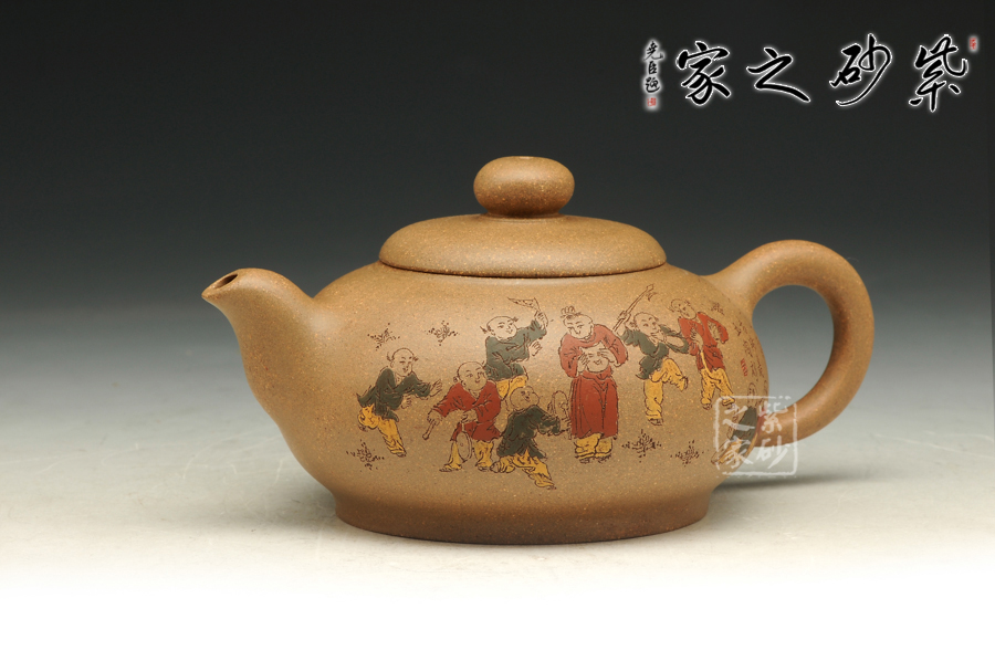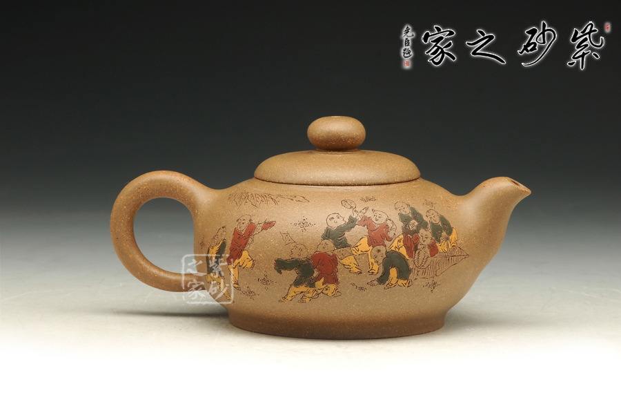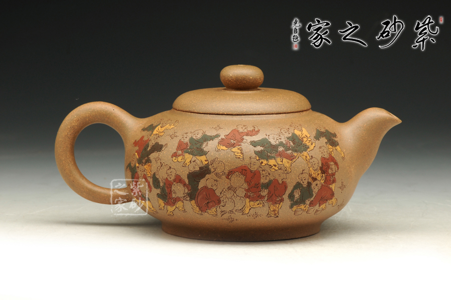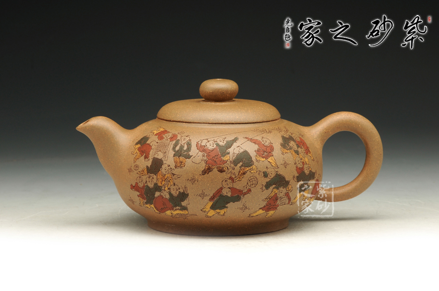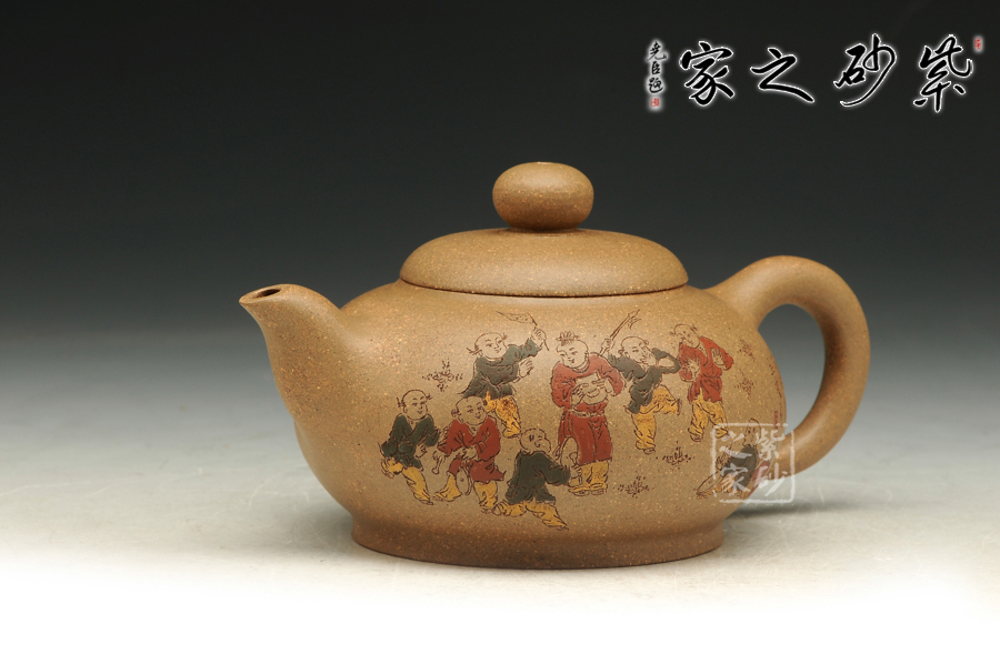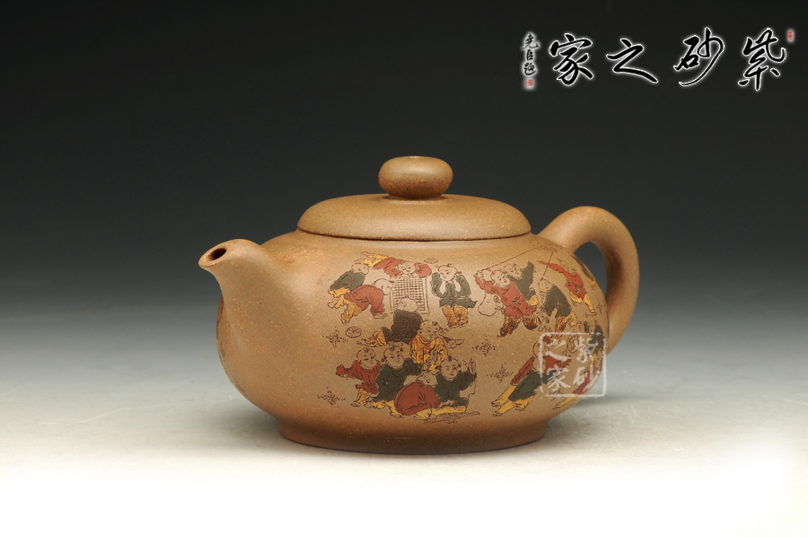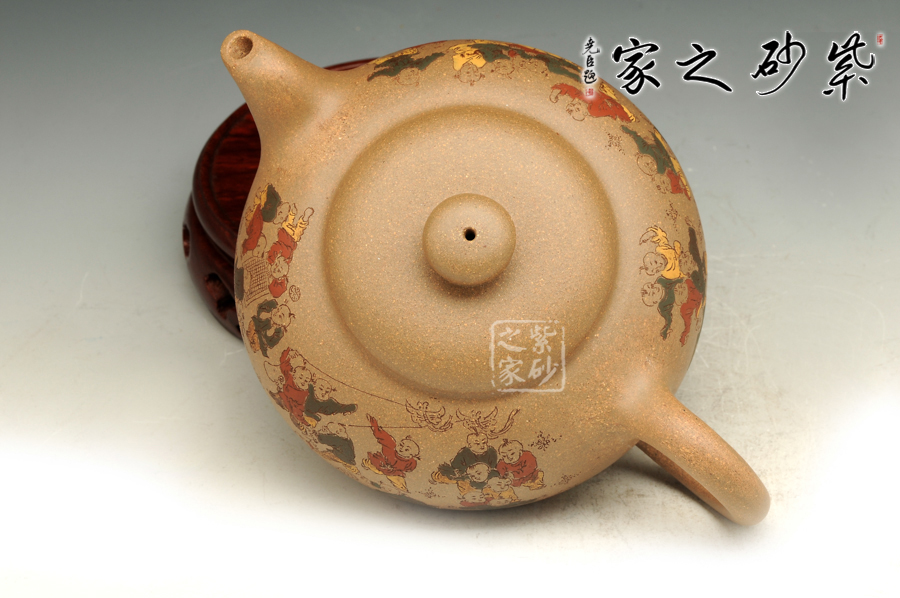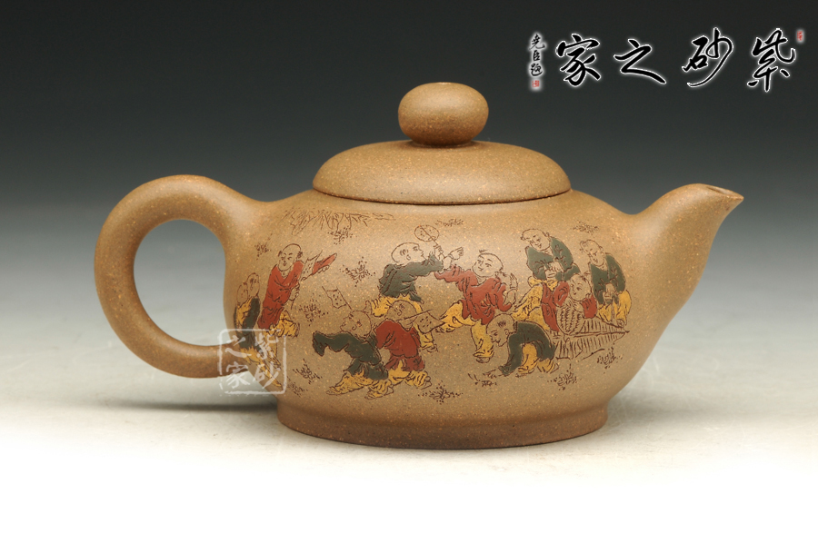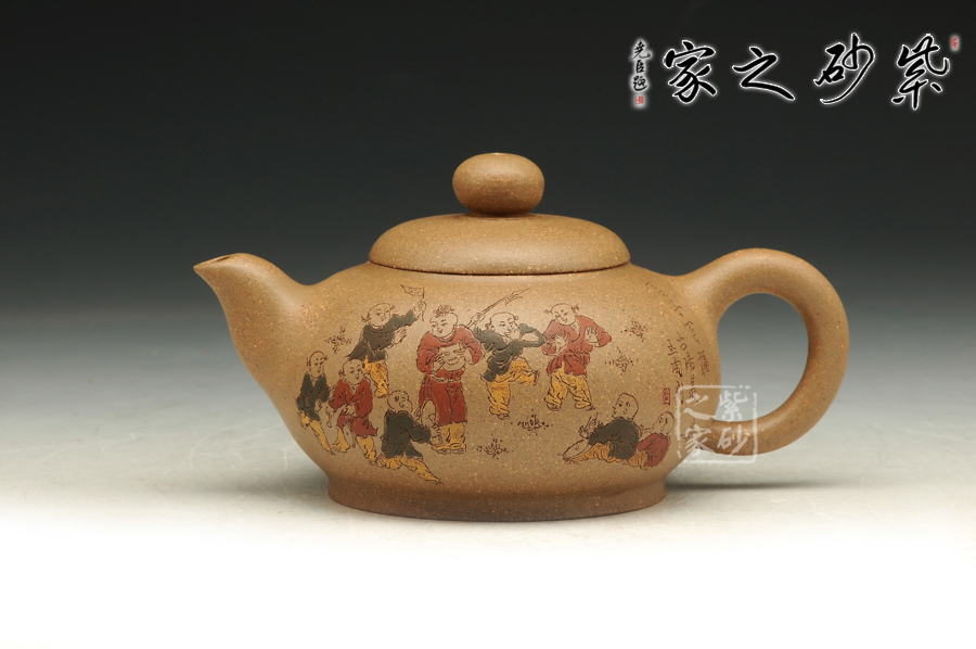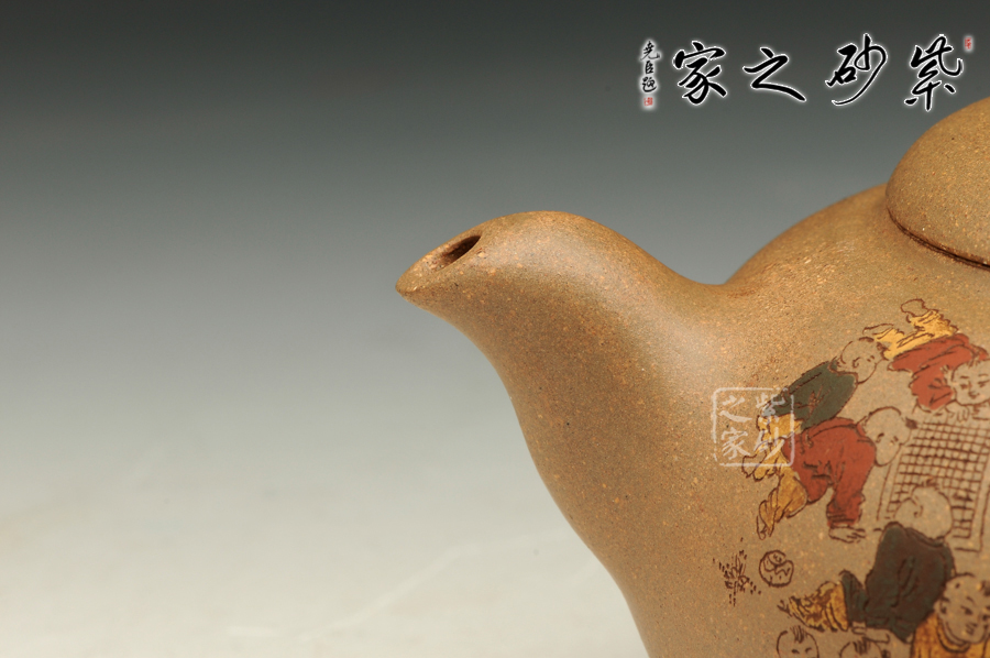 由三個(gè)紫砂壺組合而成合家歡,可謂是新穎別致。合家歡寓意一家子團(tuán)圓和睦,歡快無比。三個(gè)紫砂壺根據(jù)大小依次排列,排列有序,十分霸氣,宛若一個(gè)溫馨的三口之家。壺身上皆以彩繪的形式,老師自制自銘,展現(xiàn)了一幅百子歡聚圖,熱鬧的畫面,歡快的氛圍,絢麗的色彩,洋溢著吉祥和喜悅。