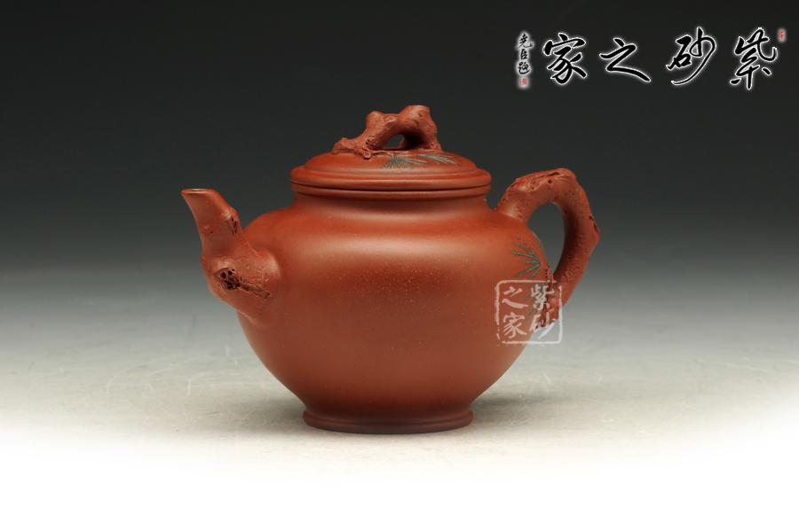其竹造型作品蒼勁有力、硬朗俊秀。凡貼竹葉,往往信手為之,故每個壺上的竹葉之角度、動勢、造型極少相同。又制桃葉之壺,取名“桃韻”,清靈可愛。壺上的桃形裝飾源于雕塑功底,每把壺上亦各個不同,甚少重復。