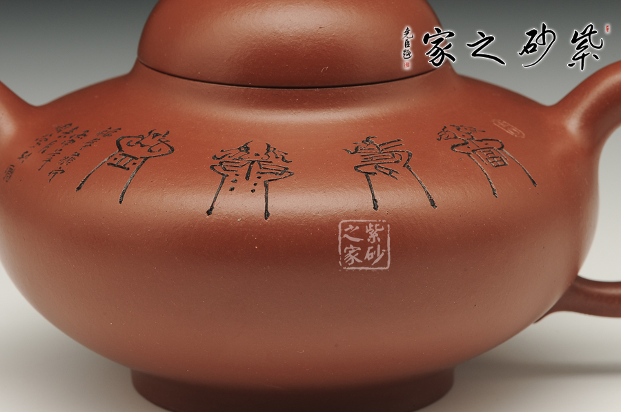 此壺采用刻繪裝飾工藝,刻字蒼勁古樸,雅韻十足。