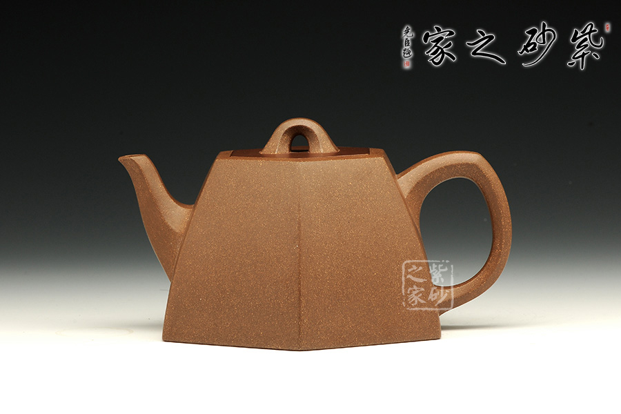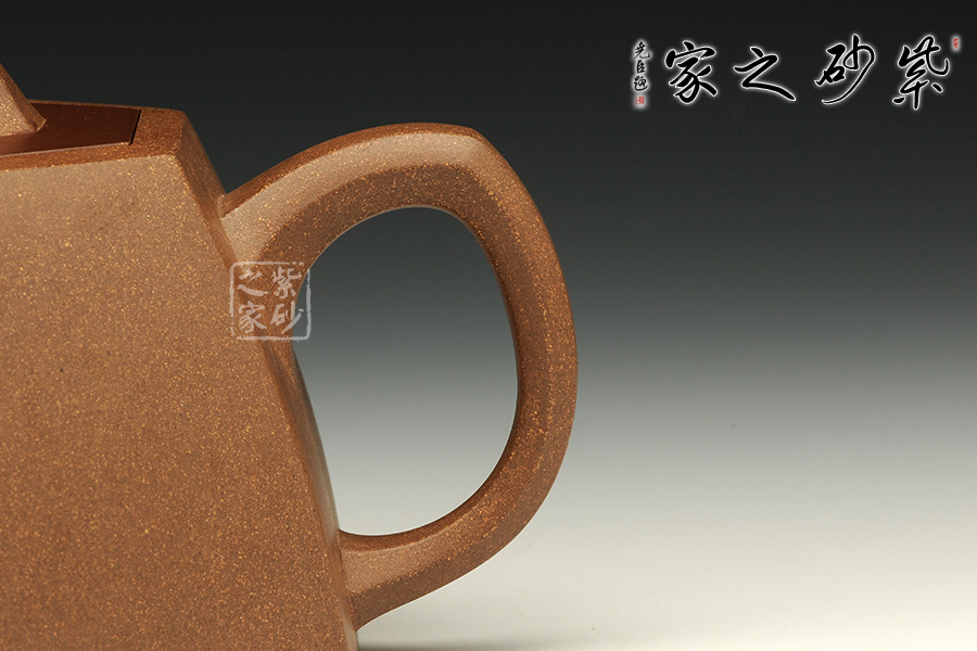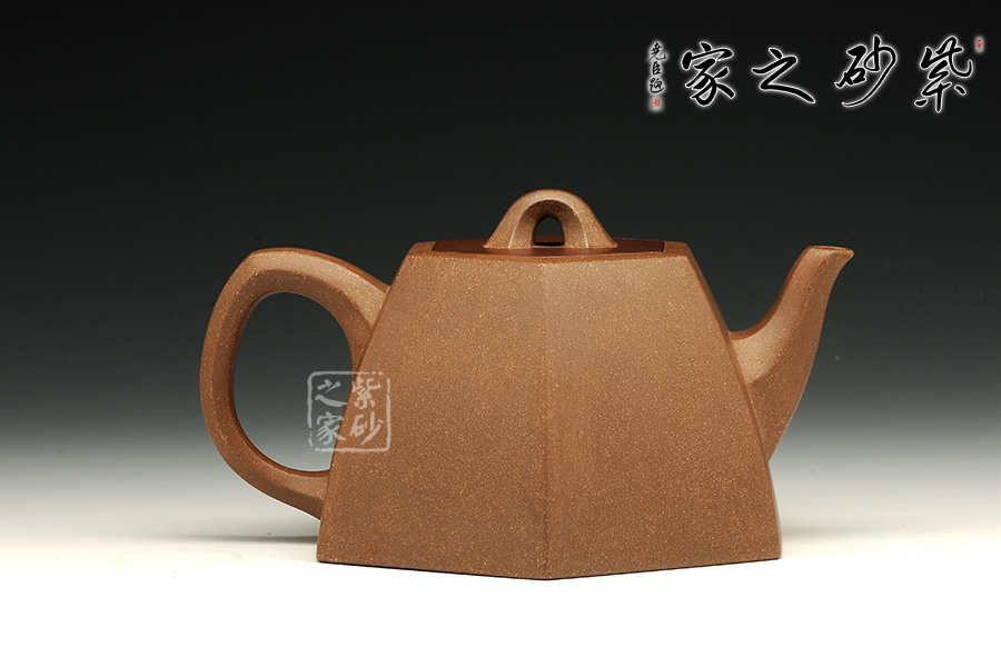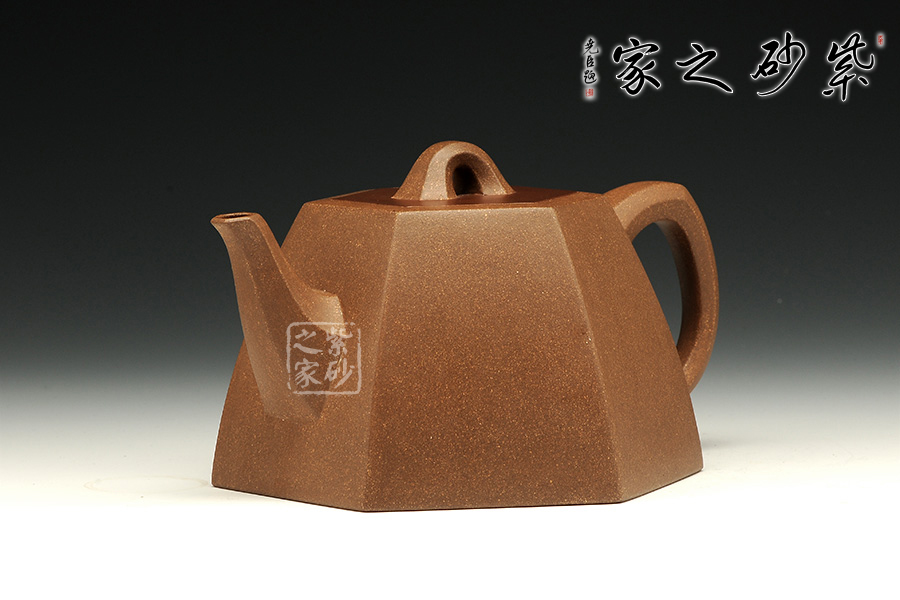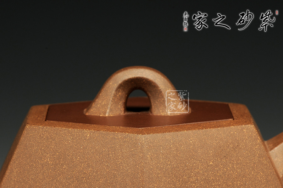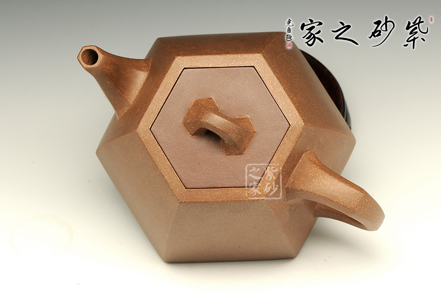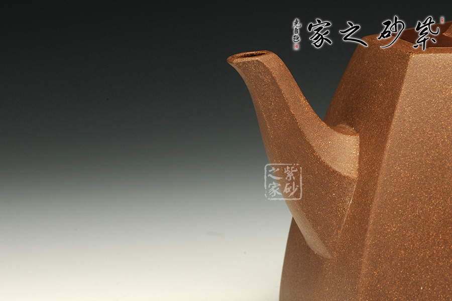 此作品輪廓清醒,線條鮮明有力,比例協(xié)調(diào),對(duì)稱(chēng)工整,壺身扁圓而飽滿壺身上小下大,六方造型一絲不茍,工整精細(xì),足見(jiàn)制作難度和用心程度。六面工整光滑,線條筆挺,氣魄雄偉。且壺鈕橋型高掛,線條挺立,細(xì)膩精巧,足見(jiàn)制壺者的工藝之精湛。壺把和壺嘴用六方制作,但方中有圓,工整且不失圓滑美妙。通身來(lái)觀之,此壺大方得體,氣度不凡,是玩壺的佳作。