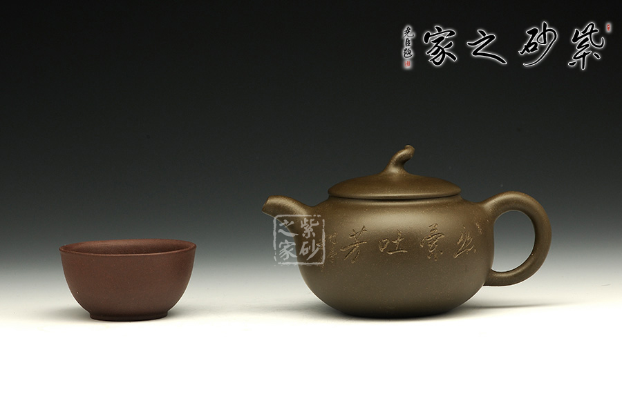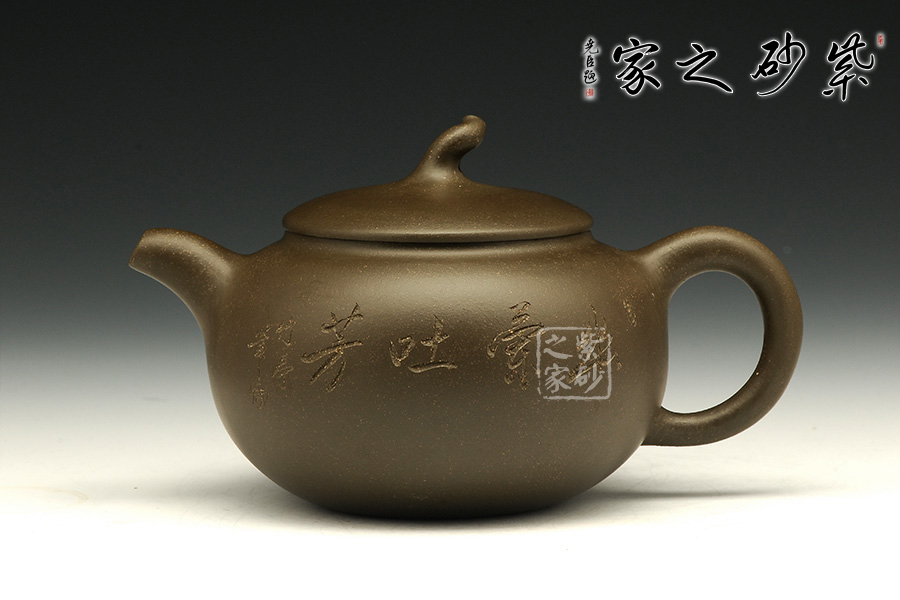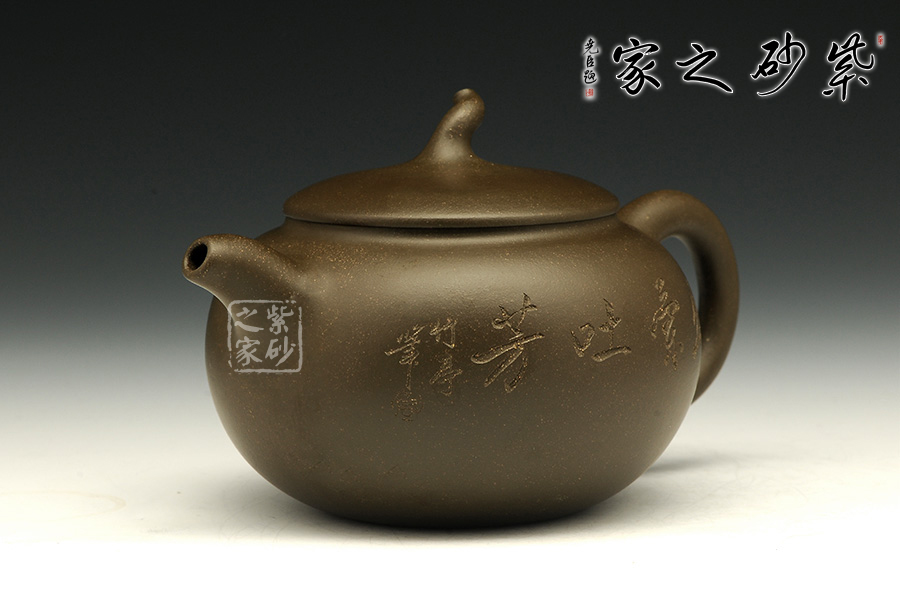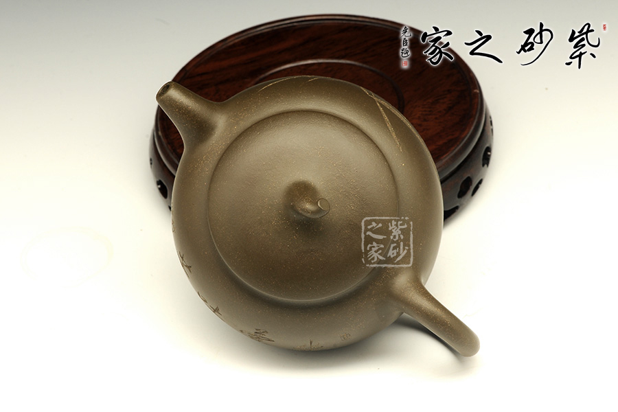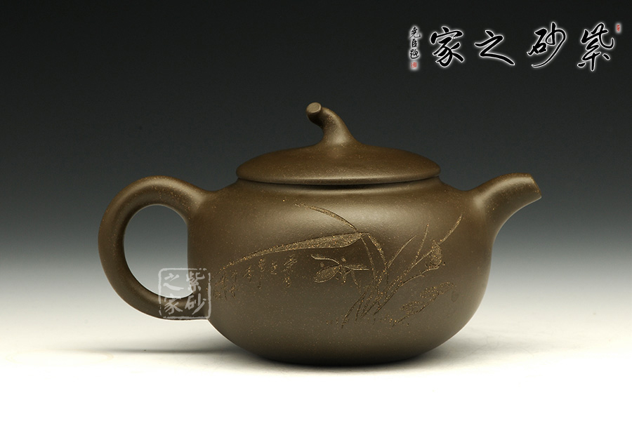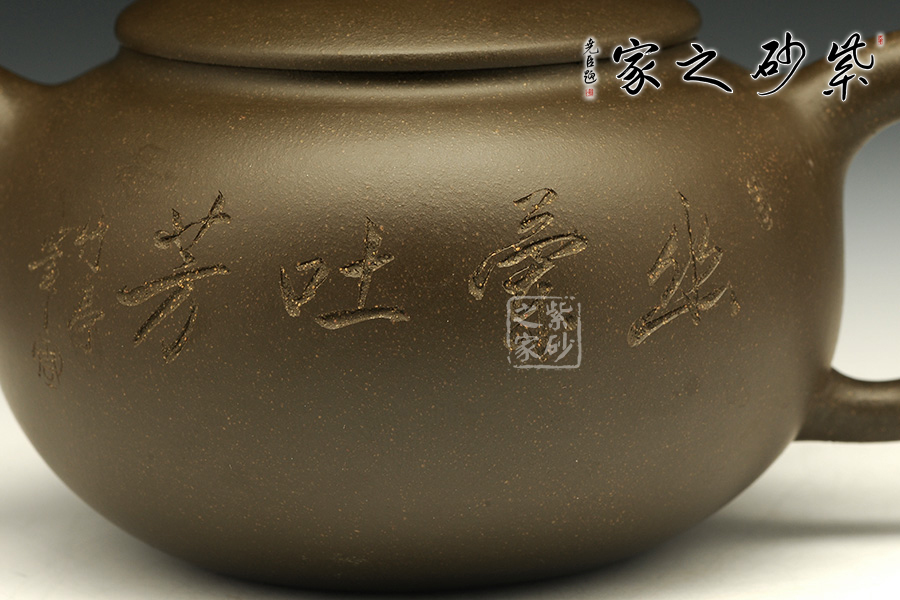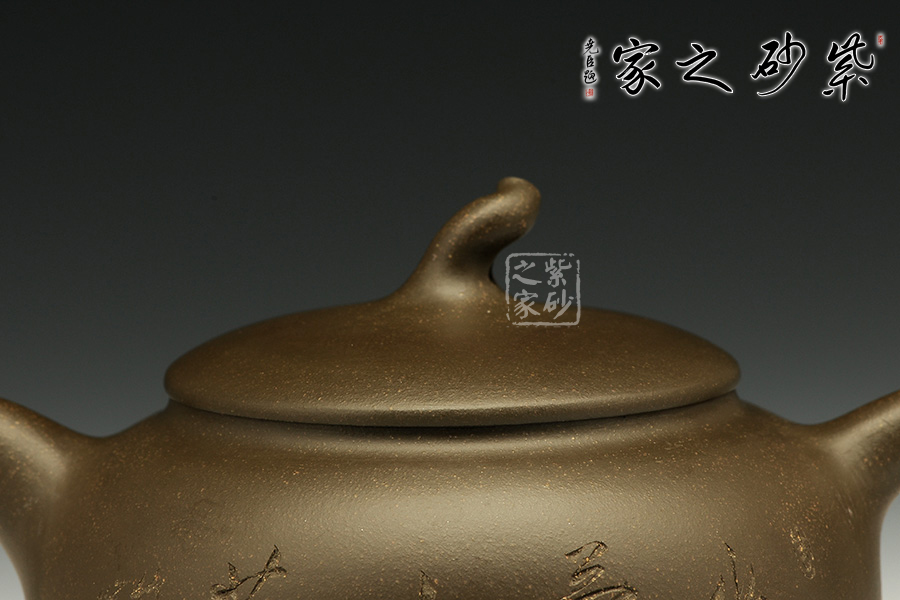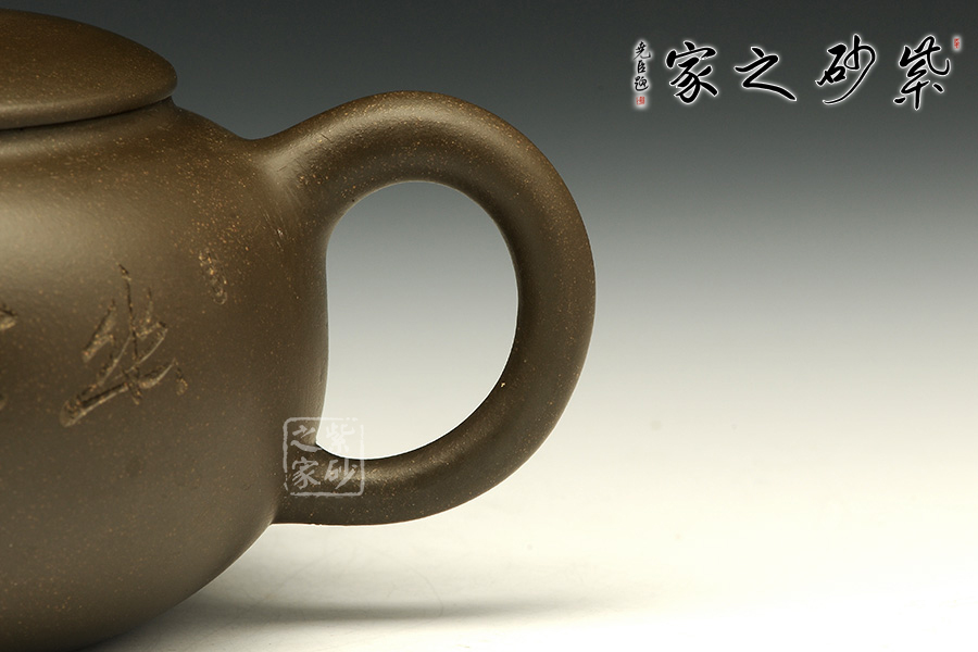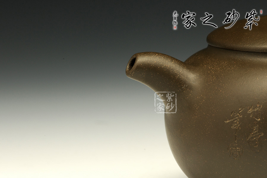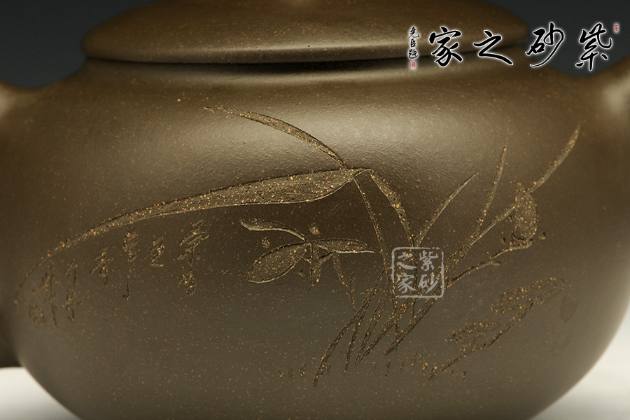 這款茄段的美妙之處在于似真似幻,在具體和抽象之間輪轉(zhuǎn)。以生活中常見的茄子為型,用圓潤的線條勾畫出茄子的動態(tài)之美,與常見的茄段不同此款造型憨胖,敦實厚重,沉穩(wěn)有力,壺鈕為如茄蒂,逼真自如,流與把舒暢自如,工藝精到,配經(jīng)絕妙的刻繪畫面,以“幽蘭吐芳”配文,或?qū)憣嵒驅(qū)懸猓瑢⒏挥械淖匀恢蕾x于紫砂之上,這是紫砂與自然的頌歌!