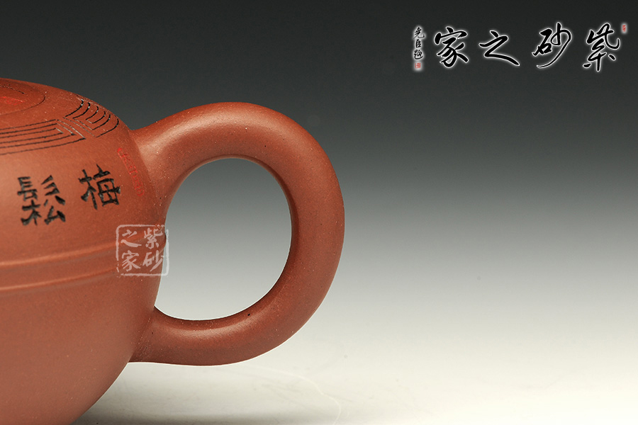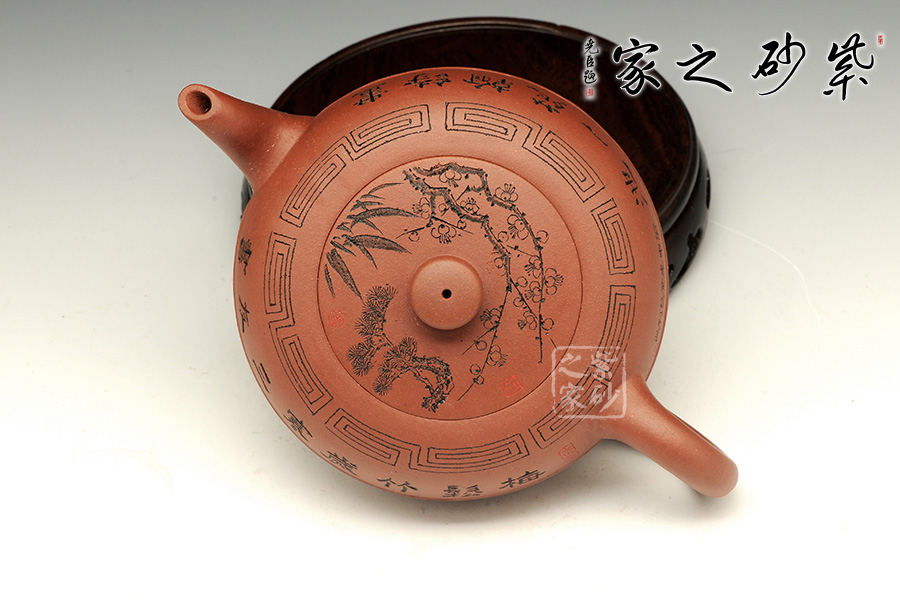 壺身依舊是扁圓球型,但并非兩片合并。壺底簡(jiǎn)潔,為一捺底,扁型鈕與蓋渾然一體,整個(gè)壺在扁圓中富于韻味。壺流自壺腹胥伸自然,把高挑圓潤(rùn)下留垂耳,與流對(duì)應(yīng)稱勢(shì)。肩部位置的線條提攜整壺神韻,線條細(xì)長(zhǎng)美觀、角圓,變化中求統(tǒng)一,以求完美。