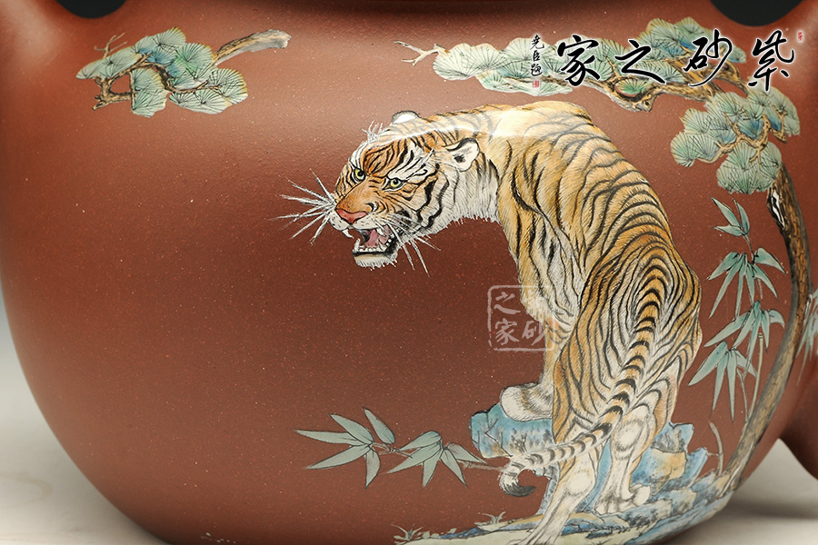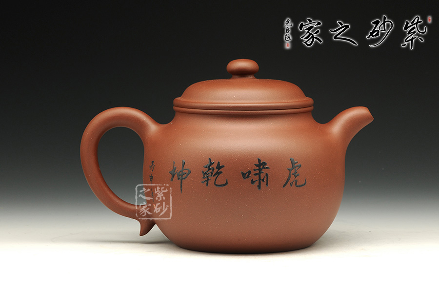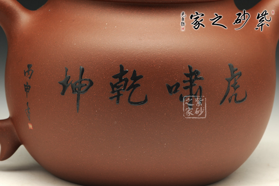 蓮子壺是傳統(tǒng)的壺式之一,此壺如傳統(tǒng)形制一般,造型古樸,腹圓而鼓,壓蓋蓋面蓬勃飽滿,氣密性良好;暗接耳形把彎曲有致,弧度大小合適;一彎流嘴口略微下壓,出水暢快;壺身結(jié)構(gòu)自然和諧,十分優(yōu)美,平靜中孕育著動(dòng)感,頂蓋上的寶珠鈕更具神韻;壺身正面鐫刻的是“虎趣圖”,一只老虎氣勢洶洶地轉(zhuǎn)身,神態(tài)逼真,一側(cè)松枝蒼古,意蘊(yùn)幽深;反面鐫刻的是“虎嘯乾坤”四字。