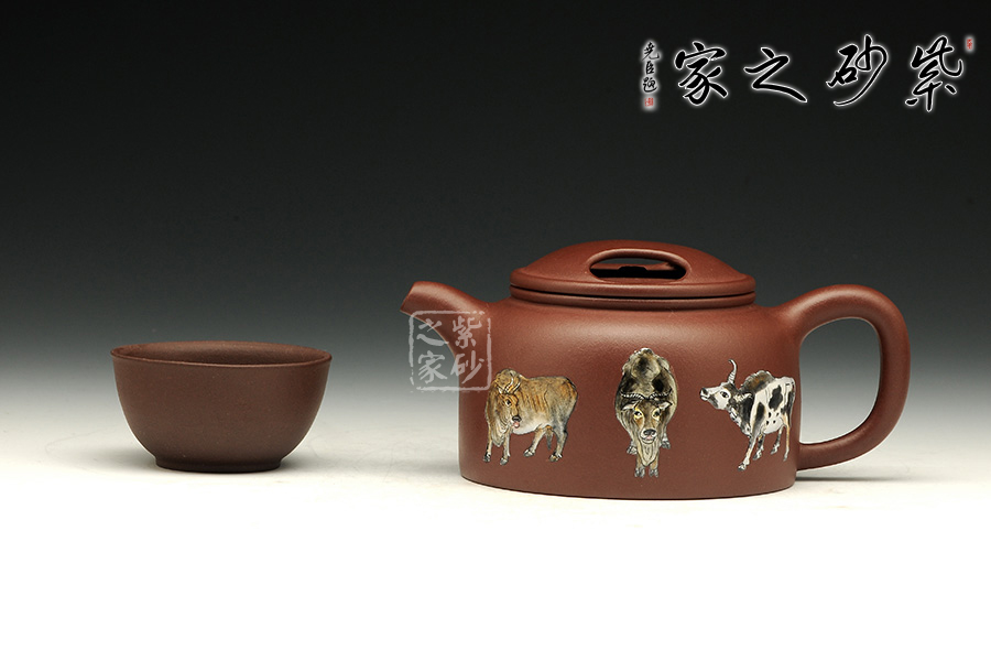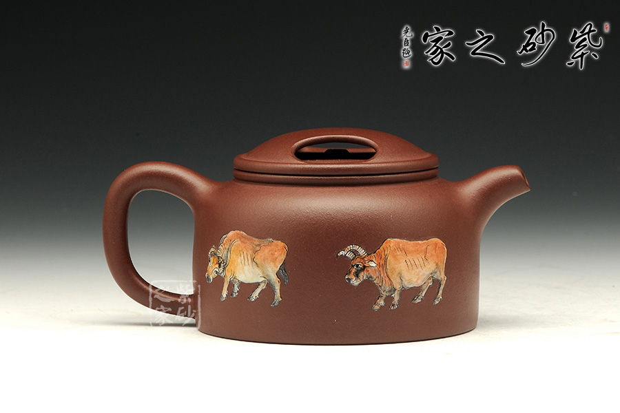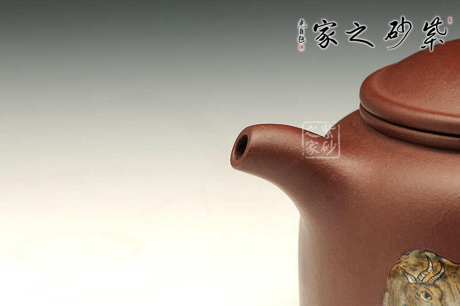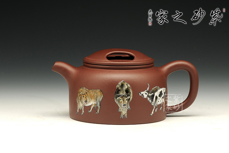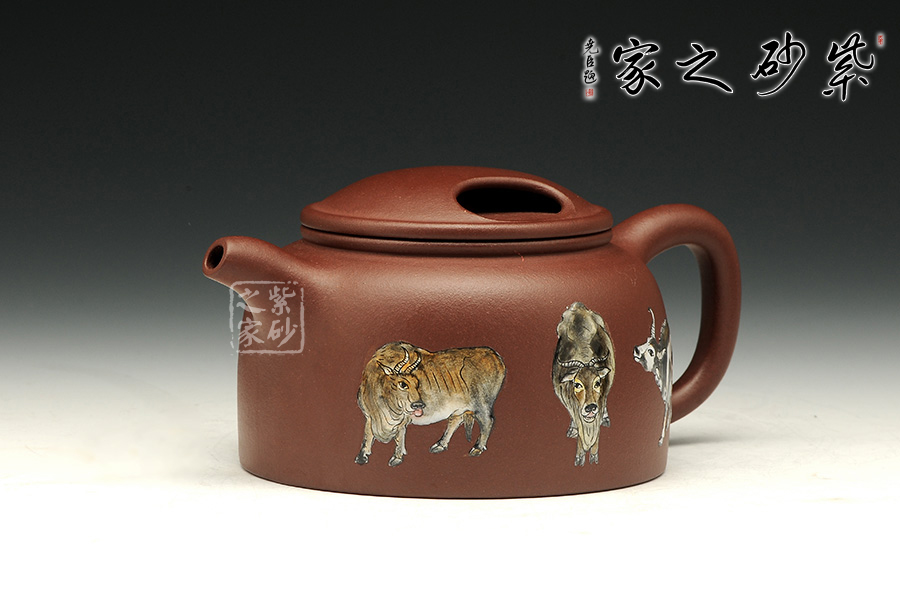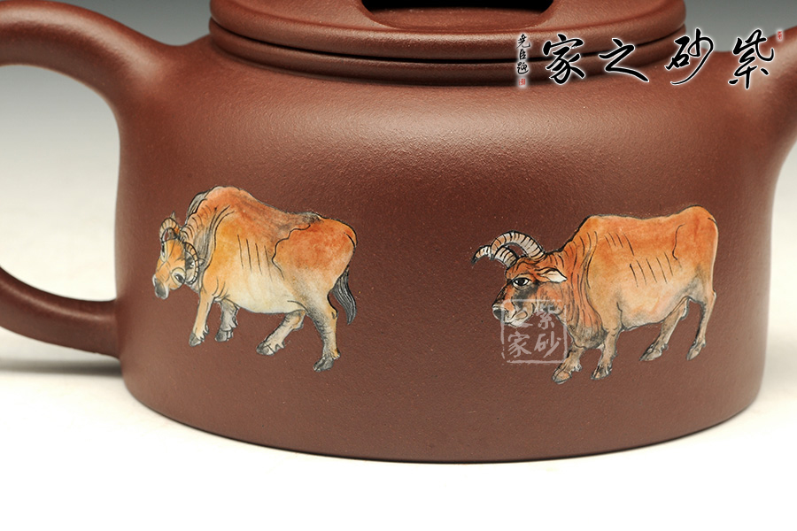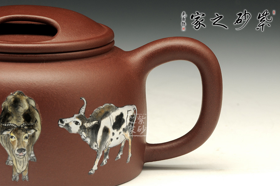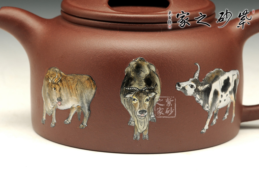 《五牛圖》有開運(yùn)祈福調(diào)理風(fēng)水的功效,適合作為贈送友人或個人品賞。風(fēng)水上有牛市的意思,牛是興旺的象征。寓意事業(yè)興旺,財源不斷。牛蓋蓮子壺為傳統(tǒng)器型,端莊秀美、古樸醇厚。使用紫泥制作而成的牛蓋蓮子壺在色澤上更加的穩(wěn)重,砂質(zhì)細(xì)膩,手感極佳,整個的線條柔和流暢,簡單卻不失大雅。此壺重點(diǎn)在于壺蓋上兩個對稱的橢圓型孔,咋一看像是牛頭上兩只圓鼓鼓的“眼睛”,形象生動,整體構(gòu)思嚴(yán)謹(jǐn),有層次感,微微彎曲的壺嘴也水不斷流。