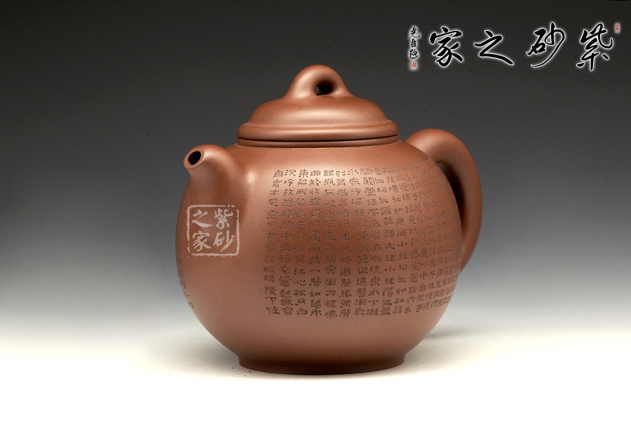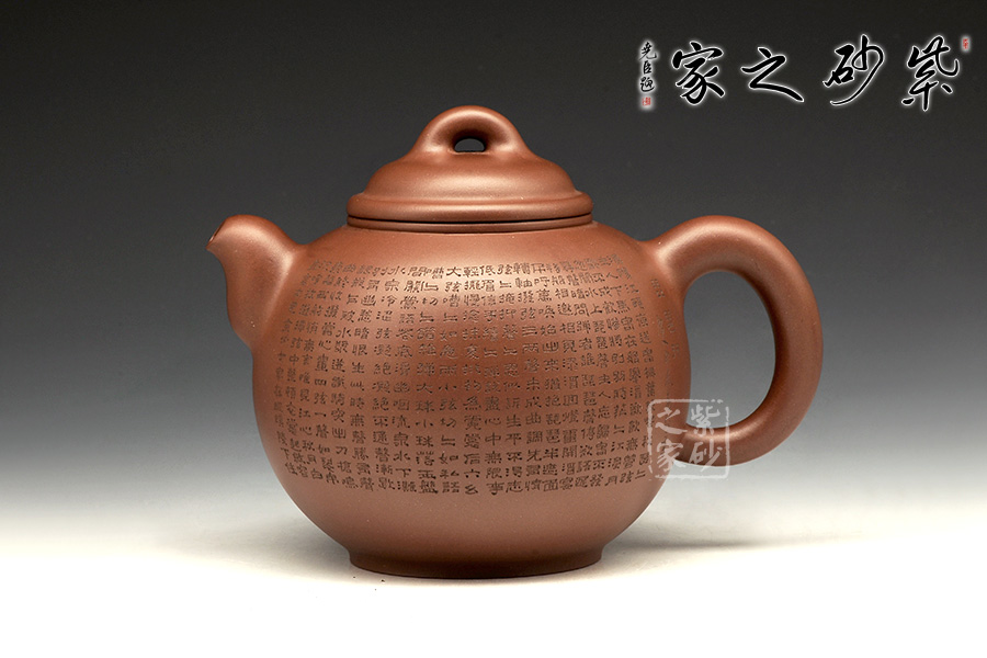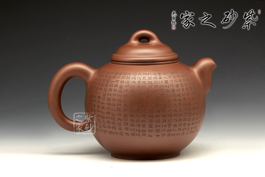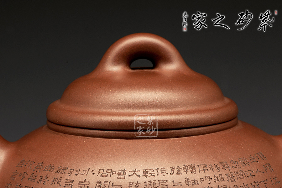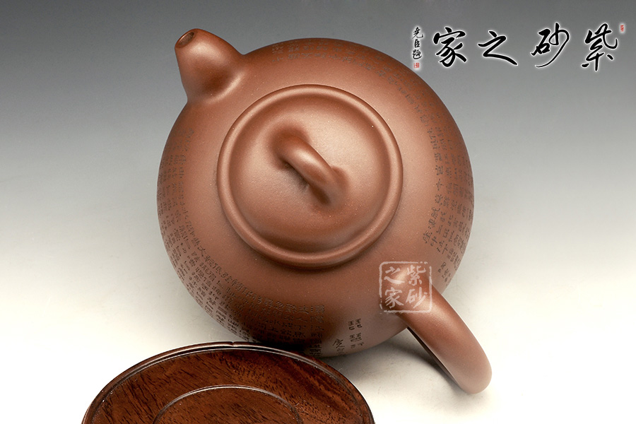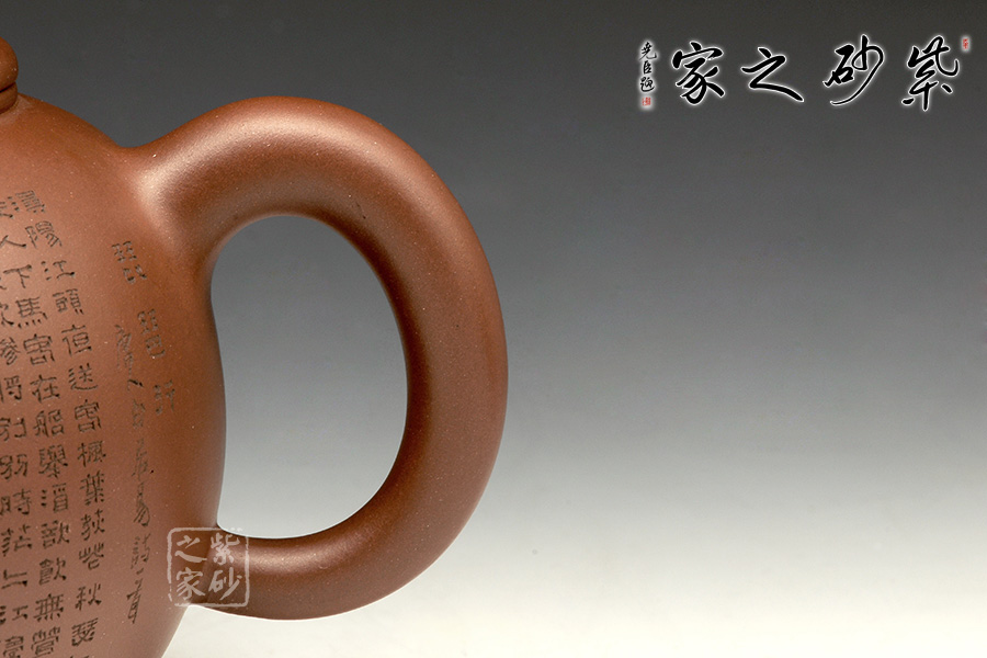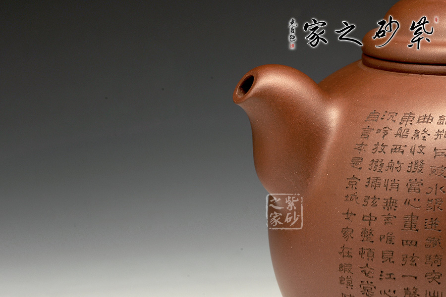 譚曉君乃中國工藝美術大師譚泉海之女,此壺乃譚曉君手制,整體圓潤飽滿,豐腴彰顯出高貴氣質(zhì),體現(xiàn)出圓潤大度的品德,壺嘴精巧胥出,與整體呼應協(xié)調(diào),壺把渾厚飽滿,甚是可愛;壺身篆刻詩人白居易名詩《琵琶行》,字里行間都體現(xiàn)出篆刻家技藝的深厚!