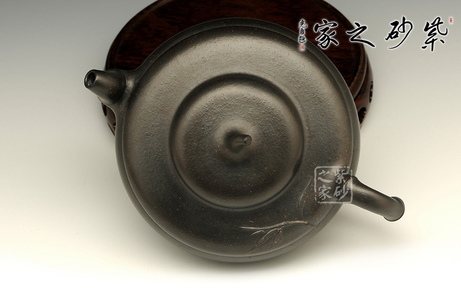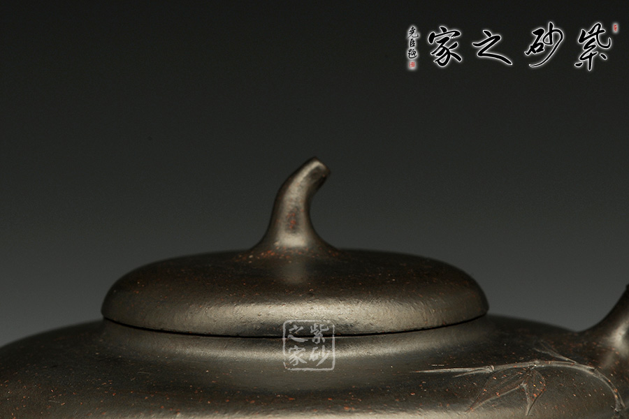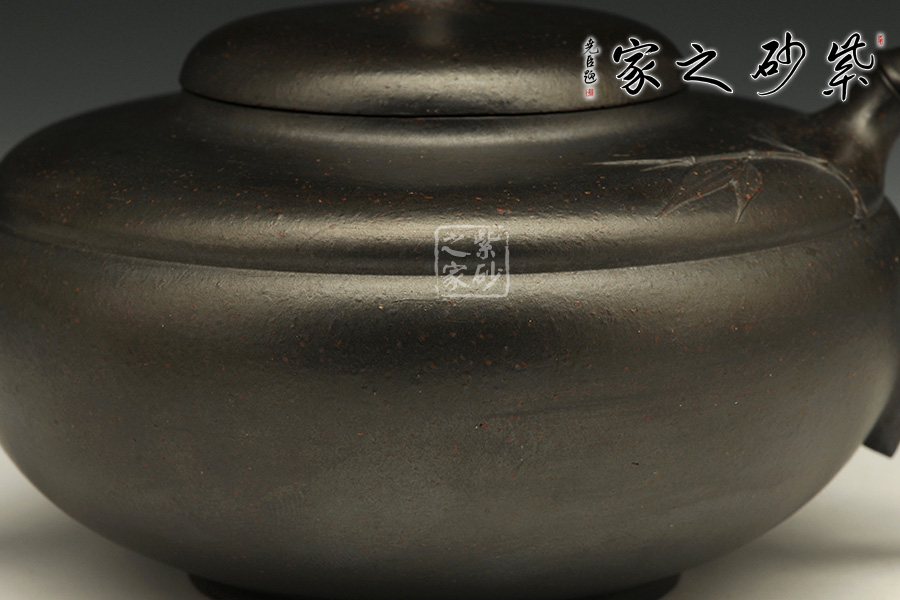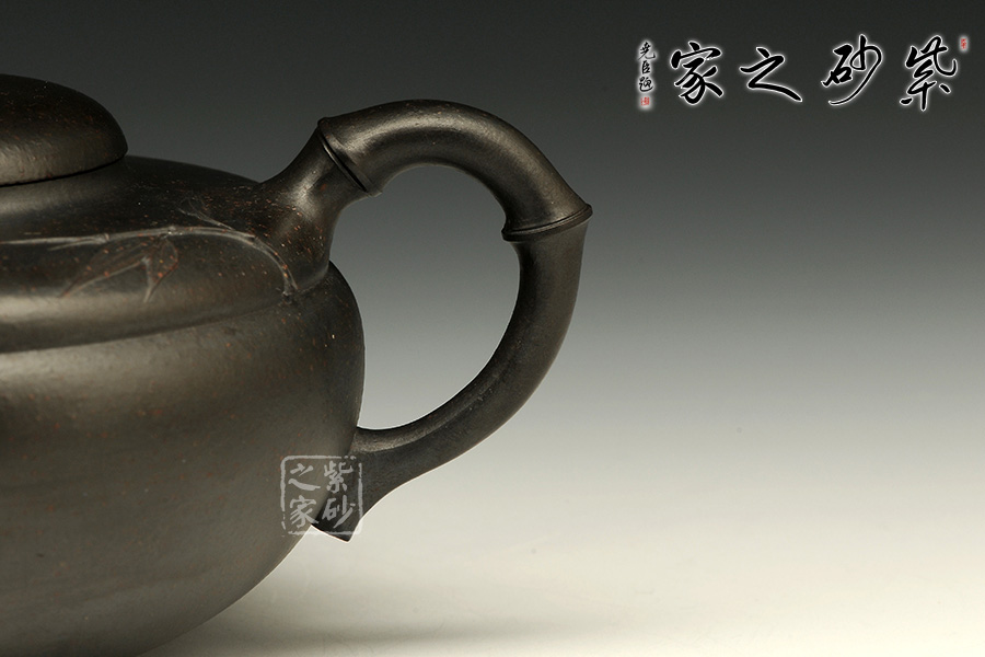 壺嘴與壺把的造型渾厚、靈韻,壺身貼飾三兩竹葉,更添生動(dòng)靈媚之感