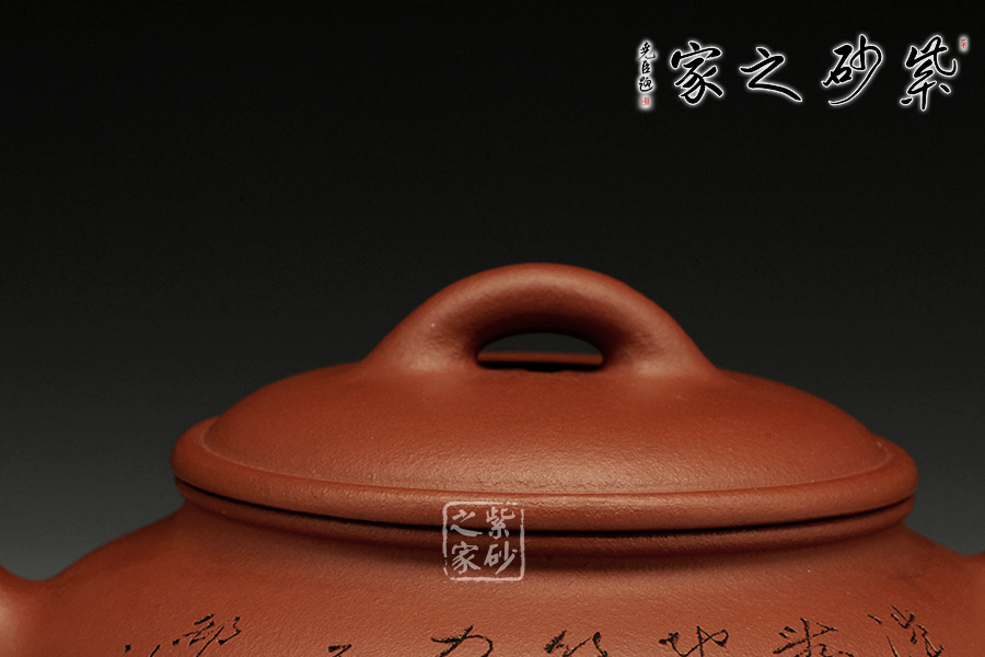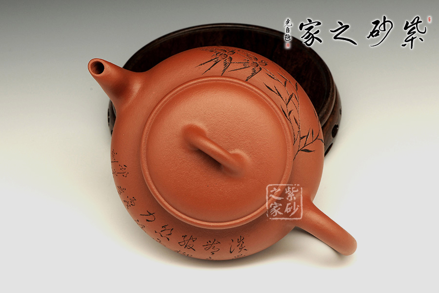 作品壺體呈扁圓狀,體態(tài)富足而雍容。壓蓋與壺口完全切合,不差分毫。彎流壺嘴出水爽處,出水不受阻。整器有骨有肉,骨肉亭均,有自己的特質(zhì)、性格和規(guī)范。流自壺腹胥出自然,壺把高挑圓潤,與流對應(yīng)出勢,整體凝重端莊,古樸素雅。壺形樸拙謙和,造工精細(xì),美妙絕倫,再配以刻繪,更覺古雅美觀!