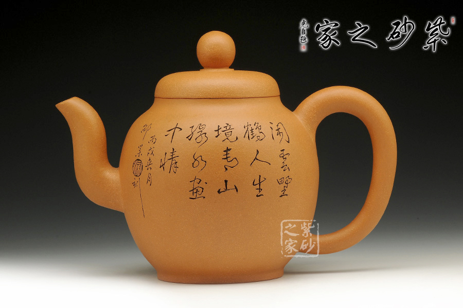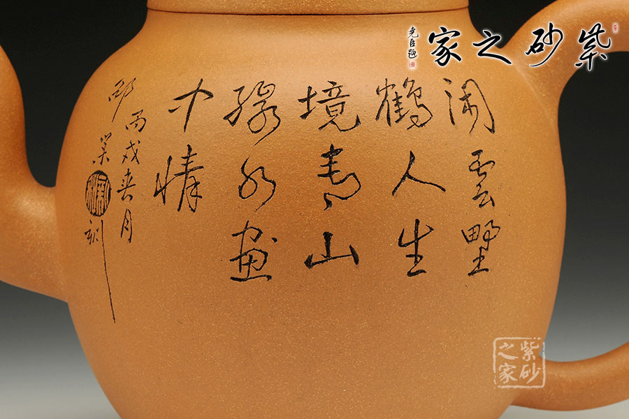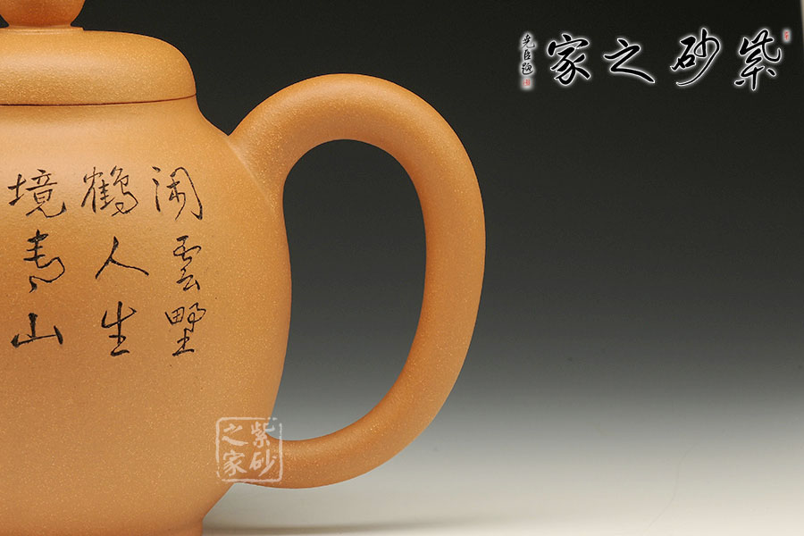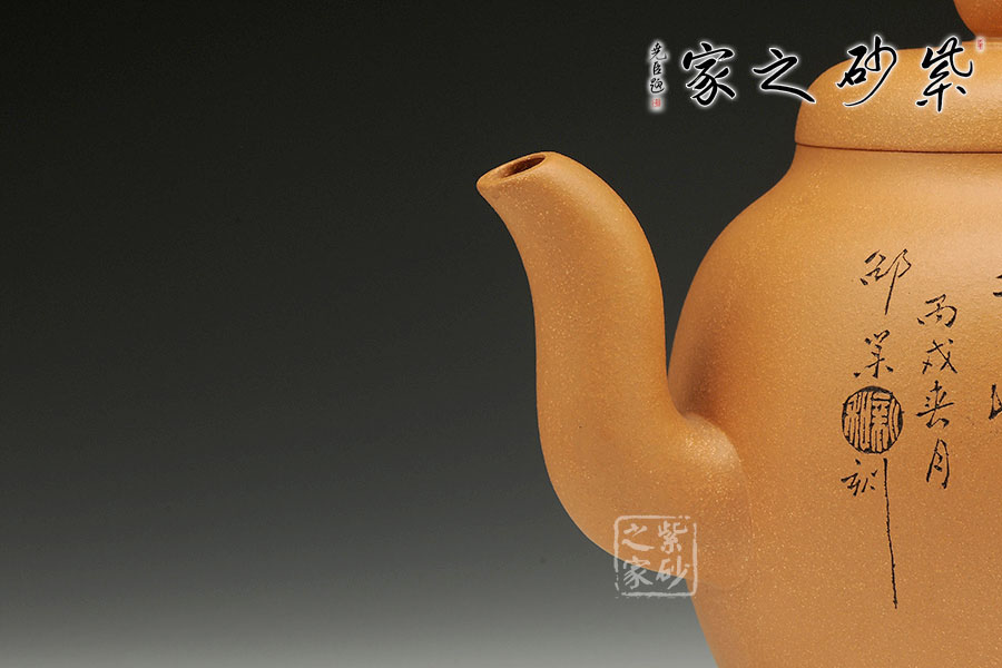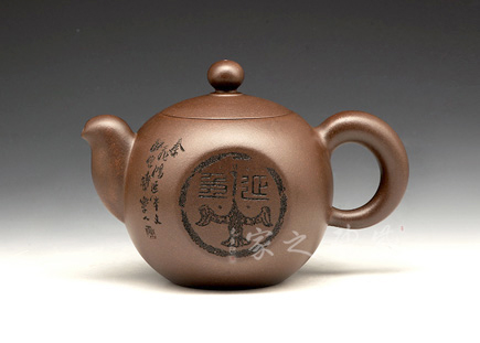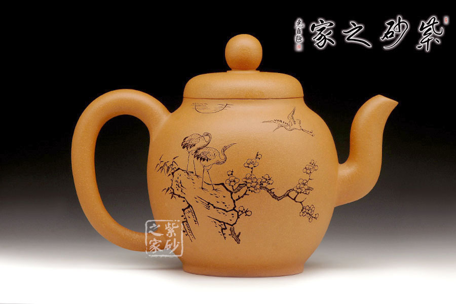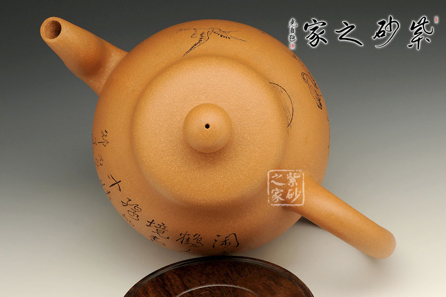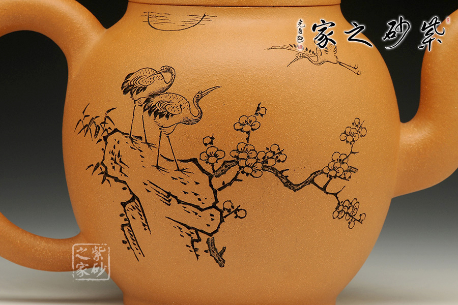 此壺是傳統(tǒng)造型,強(qiáng)調(diào)了線條的舒展和流暢,從壺嘴之間到壺把之梢一起貫通。酣暢淋漓,顯得精神,形體中的曲線、圓潤線條流暢分明。壺鈕以一粒圓珠飾之,但又如同菩提蓮子,精細(xì)巧制;嘴和壺把呈相對之態(tài),一收一放,妙趣天成。再加上其閑云野鶴有趣的表情的刻畫,讓人愛不釋手。