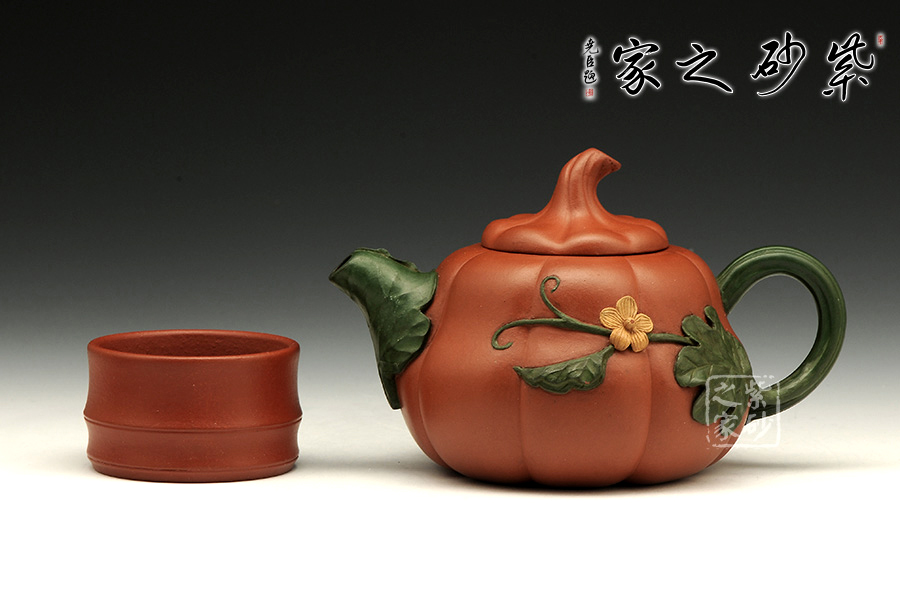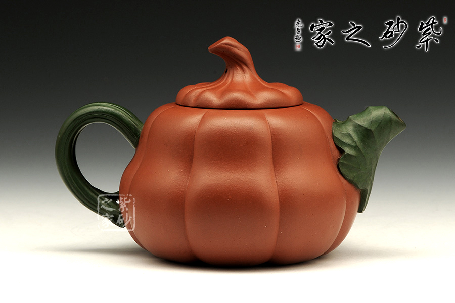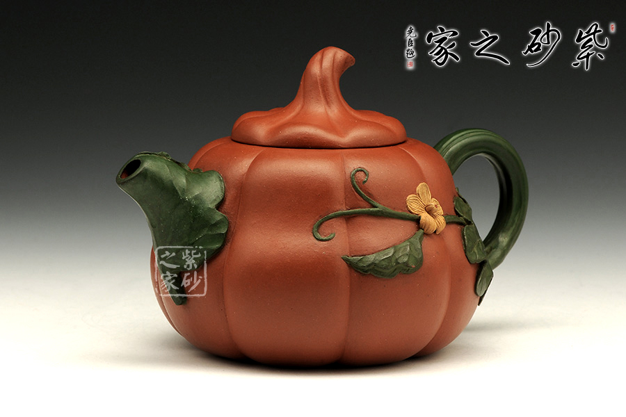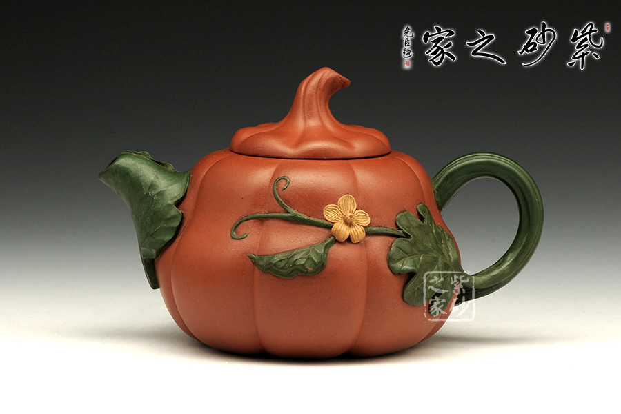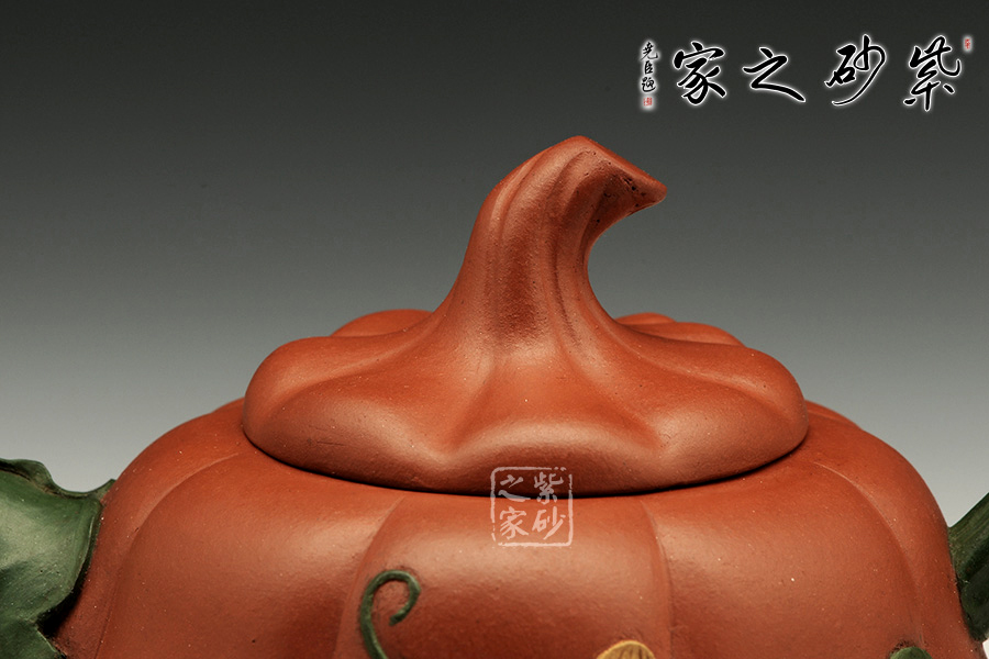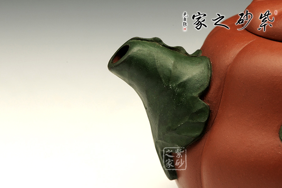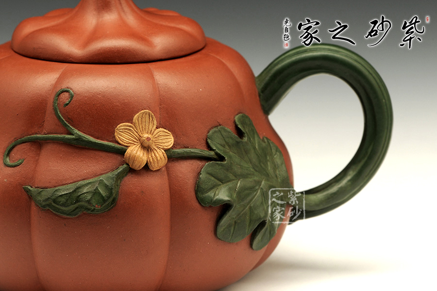 這把金瓜壺以瓜形為壺體,瓜柄為壺蓋,瓜藤為壺把,葉脈藤紋,貼繪逼真,構(gòu)思和諧巧妙,取材自然,雅而不俗。此壺整體色澤古樸,虛實相間。形態(tài)逼真,饒有趣味。壺身圓融作筋紋狀,取瓜之型。為八瓣依次圓弧起伏,別有韻味。