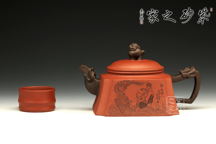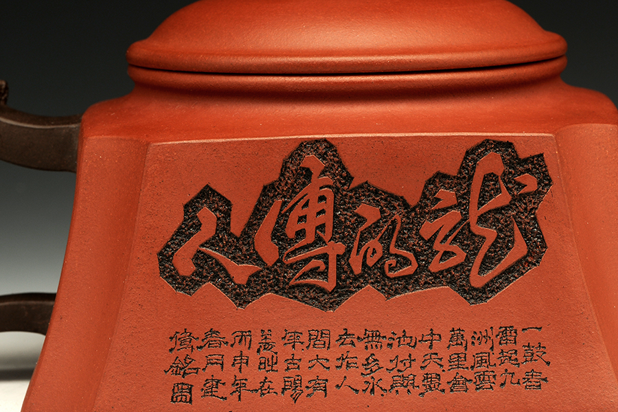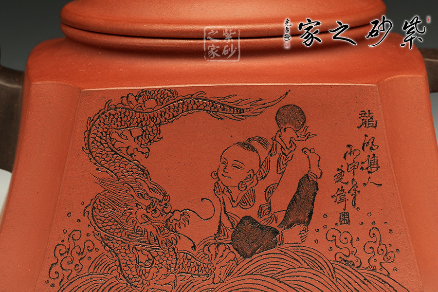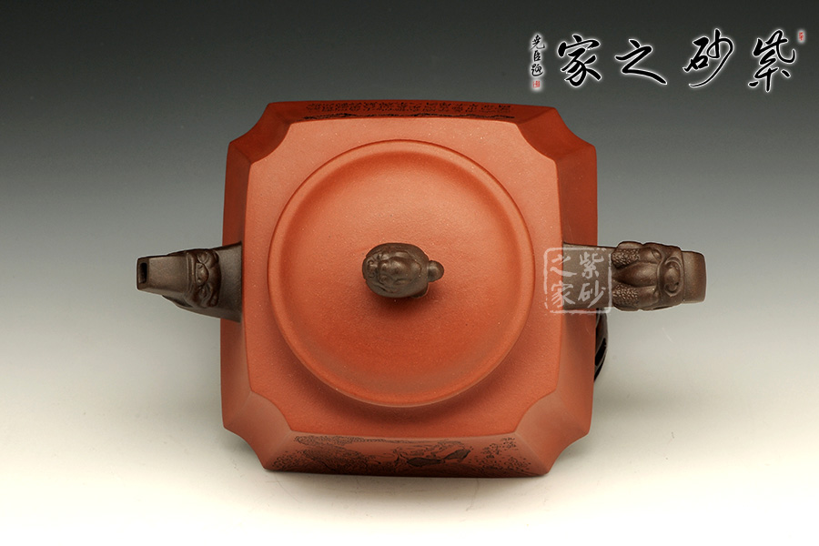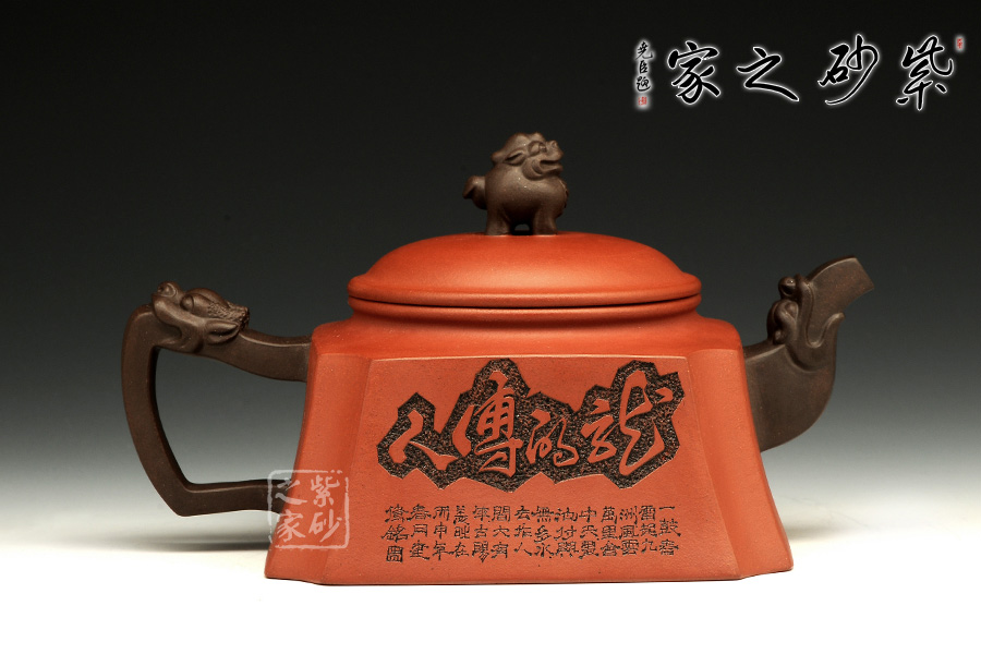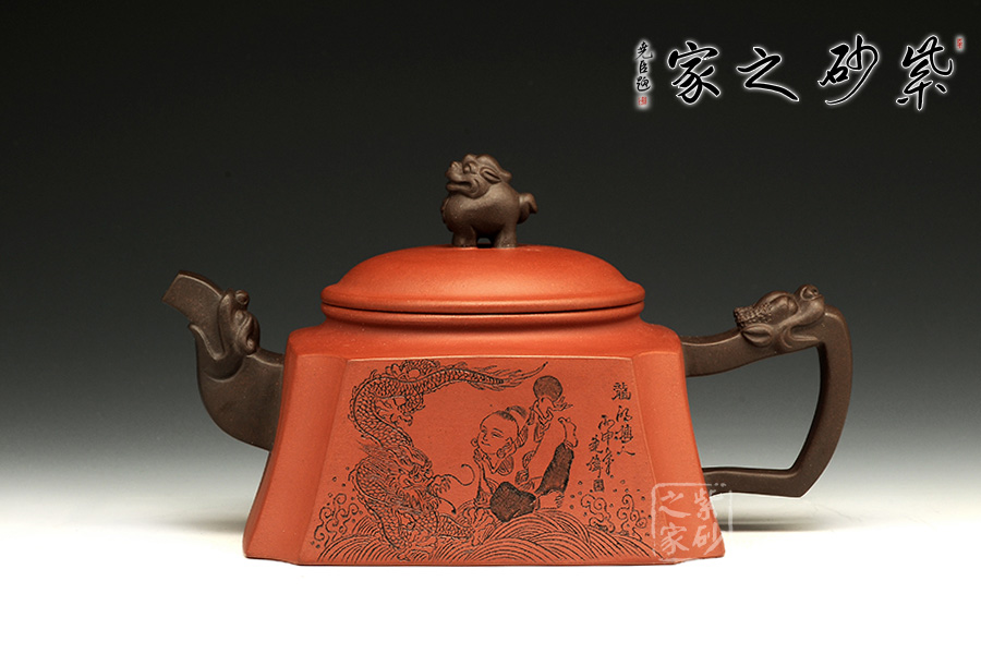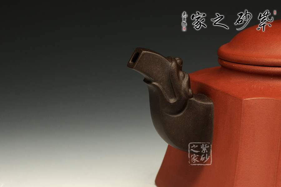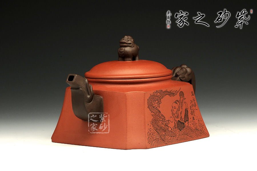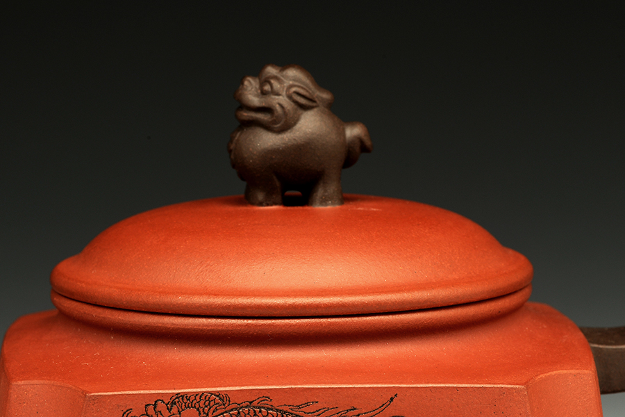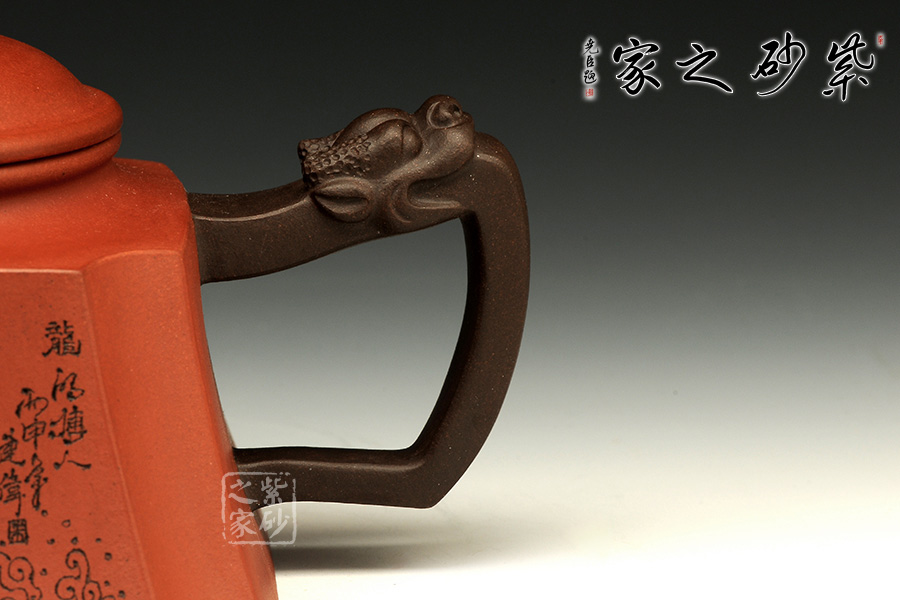 此壺以硬朗的直線為主,挺拔工整,又透出圓潤的溫婉。造型別致,值得收藏!壺身被分為四面,切面平滑,棱角分明。肩部用斜角過渡,壓蓋對接嚴(yán)密,整體簡潔。壺鈕、壺嘴和把皆以龍形為素,刻畫生動形象,相互交映。外觀用切面裝飾,于圓潤里透著工整和老味,意味獨(dú)特。