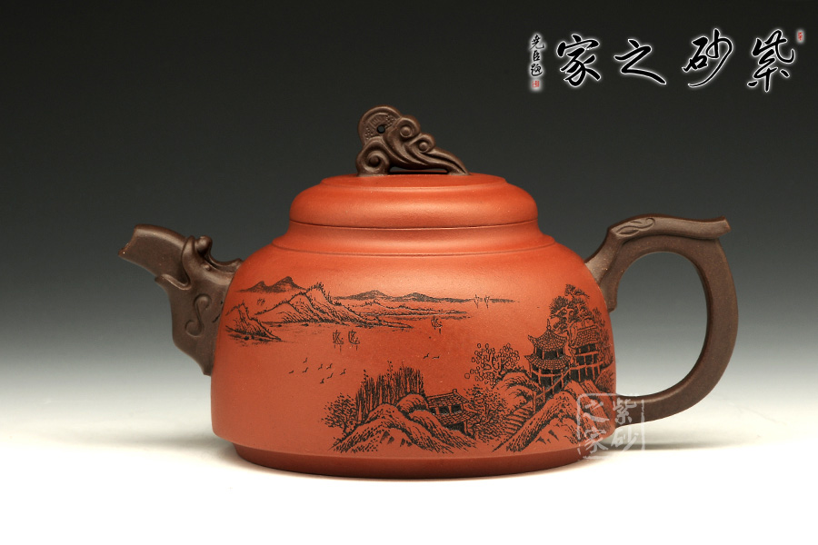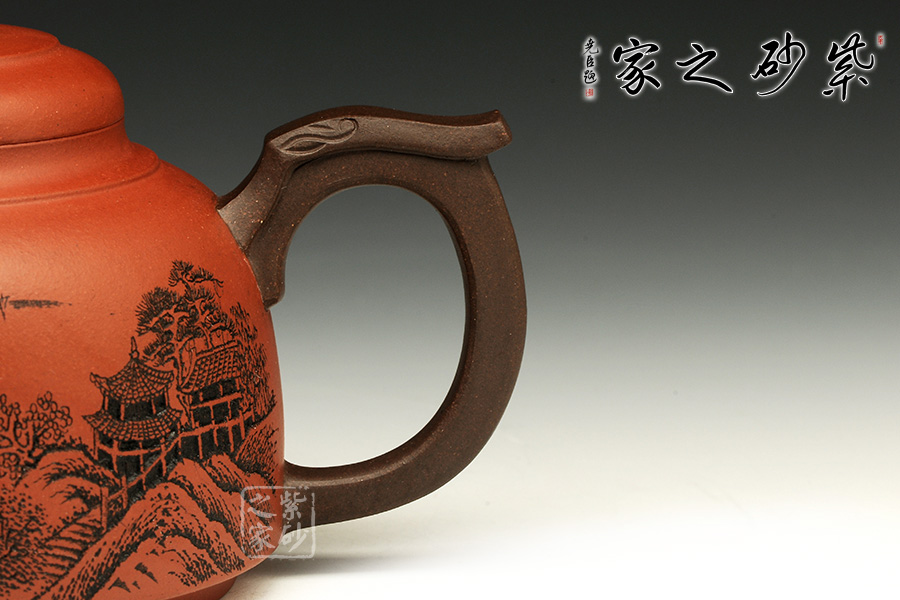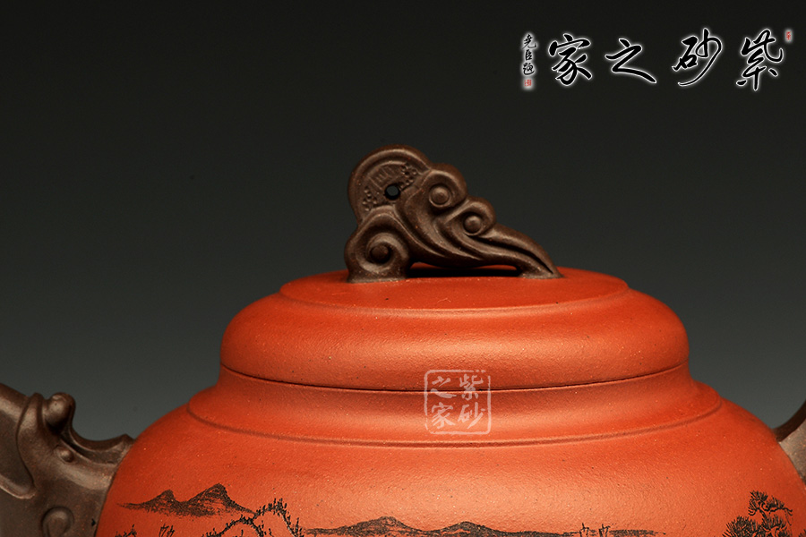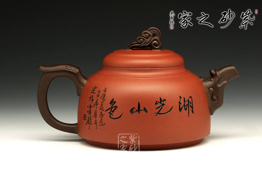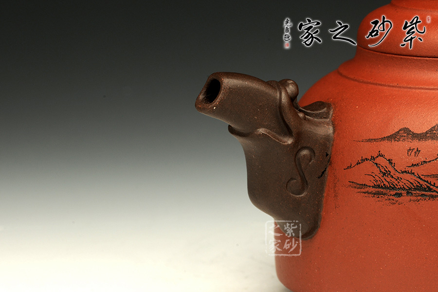 雙色泥料使用,交相輝映下足見(jiàn)作者功力不凡。壺身造型圓潤(rùn)挺拔,平滑直線和曲線過(guò)渡自然,工整細(xì)膩。此壺以硬朗的直線為主,挺拔工整,又透出圓潤(rùn)的溫婉。造型別致,值得收藏!壺鈕如意裝飾,壺嘴壺把以龍形為素,刻畫生動(dòng)形象,相互交映。